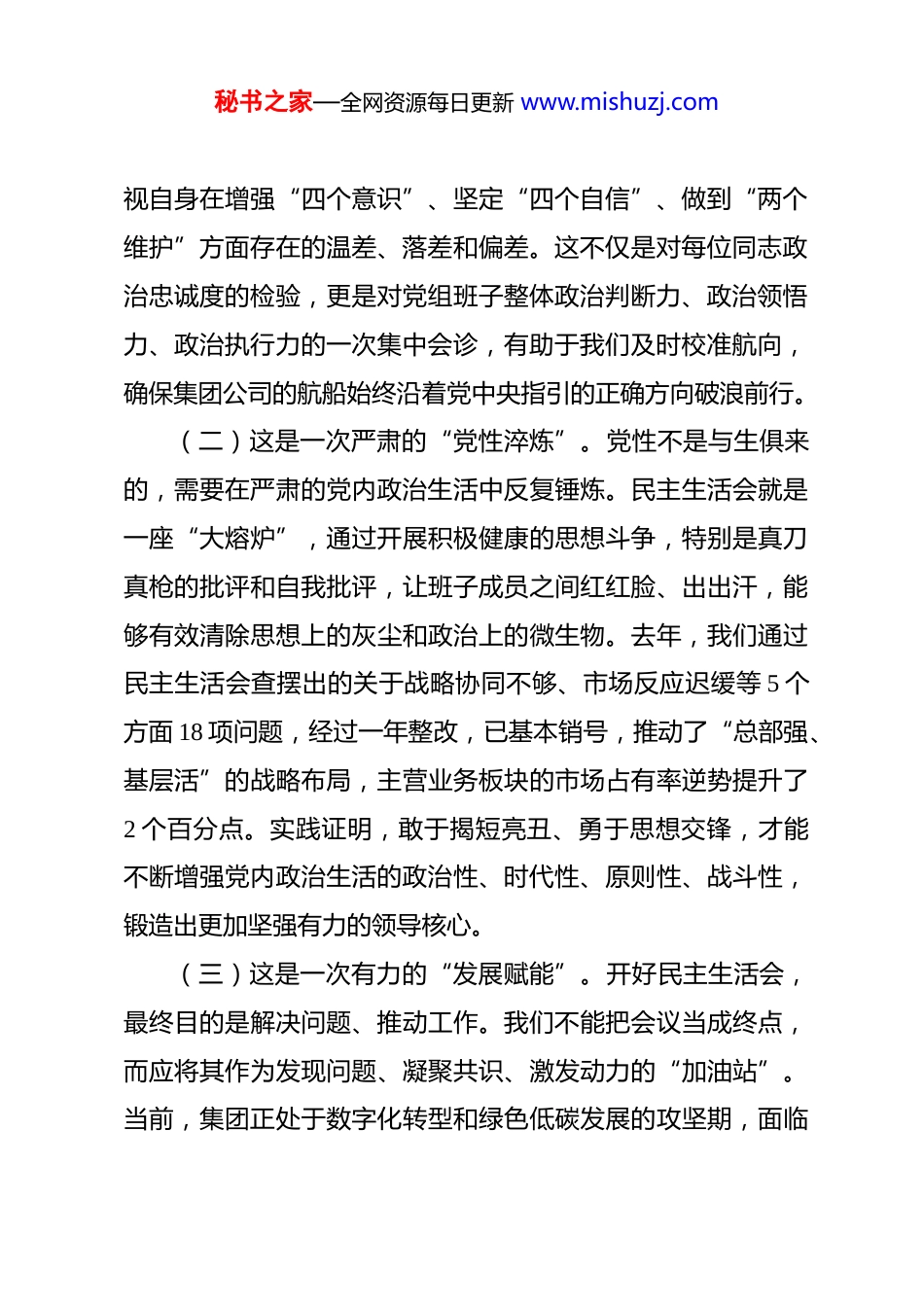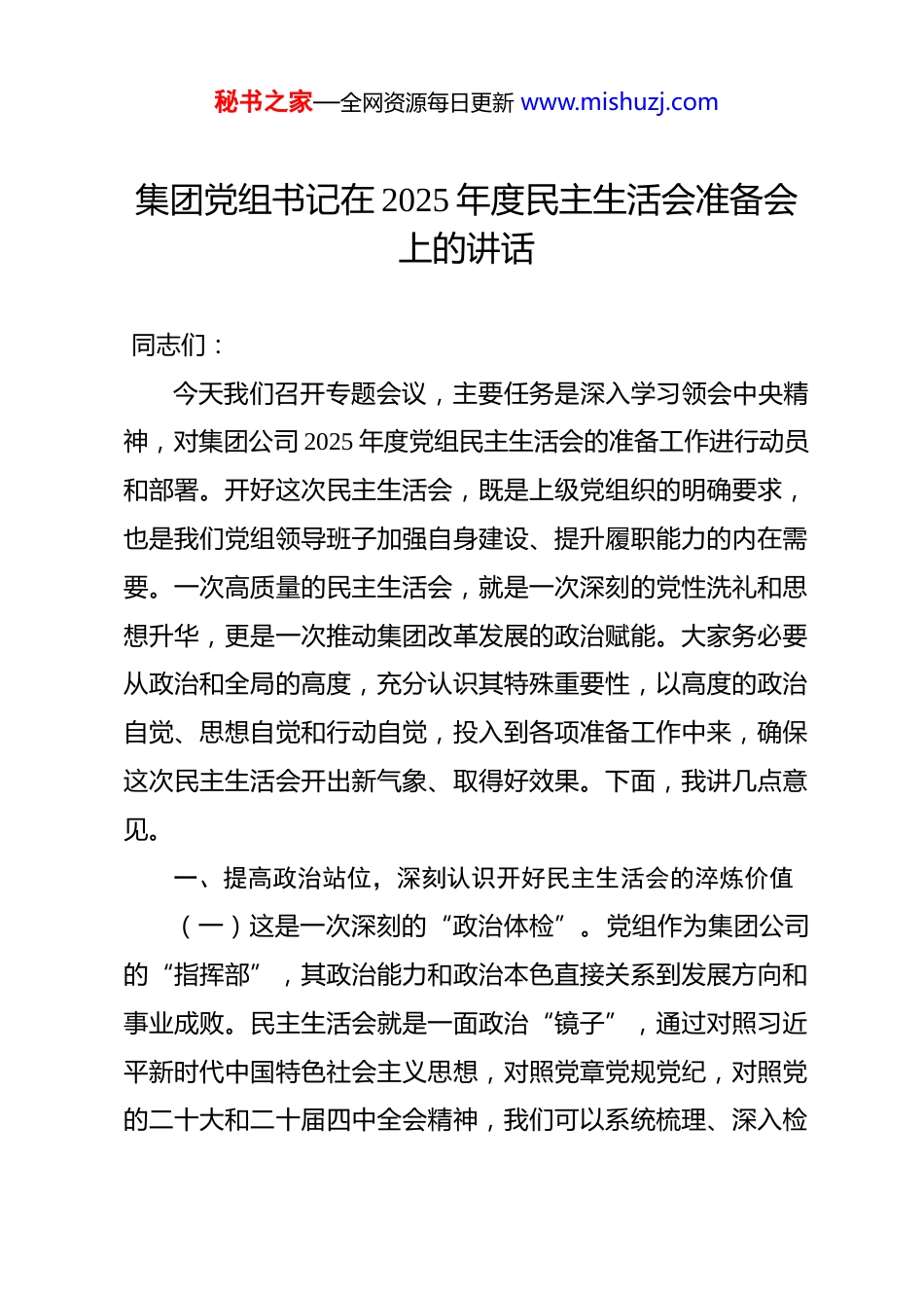 秘书之家—全网资源每日更新 www.mishuzj.com集团党组书记在 2025 年度民主生活会准备会上的讲话 同志们:今天我们召开专题会议,主要任务是深入学习领会中央精神,对集团公司 2025 年度党组民主生活会的准备工作进行动员和部署。开好这次民主生活会,既是上级党组织的明确要求,也是我们党组领导班子加强自身建设、提升履职能力的内在需要。一次高质量的民主生活会,就是一次深刻的党性洗礼和思想升华,更是一次推动集团改革发展的政治赋能。大家务必要从政治和全局的高度,充分认识其特殊重要性,以高度的政治自觉、思想自觉和行动自觉,投入到各项准备工作中来,确保这次民主生活会开出新气象、取得好效果。下面,我讲几点意见。一、提高政治站位,深刻认识开好民主生活会的淬炼价值(一)这是一次深刻的“政治体检”。党组作为集团公司的“指挥部”,其政治能力和政治本色直接关系到发展方向和事业成败。民主生活会就是一面政治“镜子”,通过对照习近平新时代中国特色社会主义思想,对照党章党规党纪,对照党的二十大和二十届四中全会精神,我们可以系统梳理、深入检秘书之家—全网资源每日更新 www.mishuzj.com视自身在增强“四个意识”、坚定“四个自信”、做到“两个维护”方面存在的温差、落差和偏差。这不仅是对每位同志政治忠诚度的检验,更是对党组班子整体政治判断力、政治领悟力、政治执行力的一次集中会诊,有助于我们及时校准航向,确保集团公司的航船始终沿着党中央指引的正确方向破浪前行。(二)这是一次严肃的“党性淬炼”。党性不是与生俱来的,需要在严肃的党内政治生活中反复锤炼。民主生活会就是一座“大熔炉”,通过开展积极健康的思想斗争,特别是真刀真枪的批评和自我批评,让班子成员之间红红脸、出出汗,能够有效清除思想上的灰尘和政治上的微生物。去年,我们通过民主生活会查摆出的关于战略协同不够、市场反应迟缓等 5 个方面 18 项问题,经过一年整改,已基本销号,推动了“总部强、基层活”的战略布局,主营业务板块的市场占有率逆势提升了2 个百分点。实践证明,敢于揭短亮丑、勇于思想交锋,才能不断增强党内政治生活的政治性、时代性、原则性、战斗性,锻造出更加坚强有力的领导核心。(三)这是一次有力的“发展赋能”。开好民主生活会,最终目的是解决问题、推动工作。我们不能把会议当成终点,而应将其作为发现问题、凝聚共识、激发动力的“加油站”。当前,集团正处于数字化转型和绿色低碳发展的攻坚期,面临秘书之家—全网资源每日更新 www.mishuzj.com着前所未有的挑战和机遇。这次民主生活会,将紧密围绕“推动高质量发展”这一主题,深入查摆我们在完整、准确、全面贯彻新发展理念,服务和融入新发展格局方面存在的短板弱项。通过集体“把脉”,找准制约集团发展的思想症结和机制障碍,形成攻坚克难的合力,这对于我们团结带领全体干部职工,确保全面完成年度营收增长 8%、利润总额增长 10%的奋斗目标,具有至关重要的推动作用。二、聚焦核心主题,准确把握查摆剖析的实践要求(一)在“学”上务求入脑入心。思想是行动的先导,理论上的清醒是政治上坚定的基础。会前,党组理论学习中心组要组织至少两次专题集中学习,原原本本、逐字逐句学习党的二十大报告和党章,深入学习习近平总书记关于党的建设的重要思想、关于严肃党内政治生活的重要论述,深刻领会党的二十届四中全会的核心要义和实践要求。个人自学要贯穿始终,每位同志都要静下心来读原著、学原文、悟原理,不能以工作忙为借口浅尝辄止。学习的目的在于统一思想、深化认识,为开好民主生活会打牢坚实的思想理论基础,真正做到“知其然,知其所以然,知其所以必然”。(二)在“谈”上务求推心置腹。谈心谈话是交换意见、形成共识的重要途径,不是简单的“常规动作”。党组主要负秘书之家—全网资源每日更新 www.mishuzj.com责同志要带头谈,同班子每位成员都要谈透,班子成员之间要互相谈,同时还要主动接受党员、干部的约谈。谈话要敞开心扉、坦诚相见,既要交流思想、沟通工作,也要主动亮明自身存在的不足,诚恳指出对方的问题,特别是要点出在重大决策...
