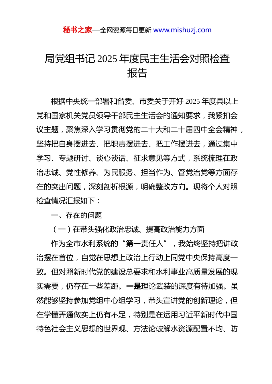 秘书之家—全网资源每日更新 www.mishuzj.com局党组书记 2025 年度民主生活会对照检查报告 根据中央统一部署和省委、市委关于开好 2025 年度县以上党和国家机关党员领导干部民主生活会的通知要求,我紧扣会议主题,聚焦深入学习贯彻党的二十大和二十届四中全会精神,坚持把自身摆进去、把职责摆进去、把工作摆进去,通过集中学习、专题研讨、谈心谈话、征求意见等方式,系统梳理在政治忠诚、党性修养、为民服务、担当作为、管党治党等方面存在的突出问题,深刻剖析根源,明确整改方向。现将个人对照检查情况汇报如下:一、存在的问题(一)在带头强化政治忠诚、提高政治能力方面作为全市水利系统的“第一责任人”,我始终坚持把讲政治摆在首位,自觉在思想上政治上行动上同党中央保持高度一致。但对照新时代党的建设总要求和水利事业高质量发展的现实需要,仍存在一些差距。一是理论武装的深度有待加强。虽然能够坚持参加党组中心组学习,带头宣讲党的创新理论,但在学懂弄通做实上仍有不足,特别是在运用习近平新时代中国特色社会主义思想的世界观、方法论破解水资源配置不均、防秘书之家—全网资源每日更新 www.mishuzj.com洪排涝体系薄弱等深层次矛盾时,思路不够开阔,转化不够精准。例如,在推进跨流域调水工程过程中,对如何统筹生态保护与民生保障的关系把握还不够全面,反映出战略思维和系统观念还需进一步提升。二是政治判断力、政治领悟力、政治执行力需持续锤炼。面对极端天气频发带来的防汛抗旱新形势,有时更多从技术层面应对,未能第一时间从保障国家水安全、维护人民群众生命财产安全的政治高度进行统筹谋划。个别时候对上级决策部署的理解还停留在“完成任务”层面,缺乏结合本地实际创造性落实的主动意识。三是贯彻落实党中央重大决策部署的闭环机制不够健全。比如在推进河湖长制走深走实过程中,虽然建立了巡查督导制度,但对发现问题整改的跟踪问效力度不够,部分河段“清四乱”反弹现象仍然存在,暴露出政治执行力上的温差、落差。(二)在带头固本培元、增强党性方面始终牢记共产党员的第一身份,注重加强党性锻炼,坚定理想信念。但在长期工作中,也出现了一些苗头性、倾向性问题。一是宗旨意识有所弱化。随着职务提升和事务性工作增多,深入基层一线调研的时间相对减少。2025 年全年下基层调研共计 47 天,其中赴偏远山区农村饮水安全项目点仅 9 次,与群众面对面交流少,导致对部分群众反映强烈的季节性缺水、管网秘书之家—全网资源每日更新 www.mishuzj.com老化等问题掌握不及时、解决不彻底。有群众在谈心谈话中指出:“领导来得多是看工程进度,很少坐下来听听我们用水的实际困难。”这一意见让我深受触动。二是斗争精神有所减退。面对水利工程建设中的历史遗留问题,如某灌区产权纠纷长达十余年未决的问题,存在“新官不理旧账”的消极心态,推动化解的韧劲不足。在处理个别干部作风松散问题时,有时碍于情面,批评教育多、动真碰硬少,没有完全做到严管与厚爱相结合。三是自我革命精神有待强化。在组织生活会上开展批评与自我批评时,对自身问题的查摆多集中在工作层面,触及思想灵魂深处不够,存在“怕伤和气、怕丢面子”的心理障碍。对分管领域出现的个别“微腐败”苗头,提醒警示多,深挖根源少,未能真正做到防微杜渐。(三)在带头敬畏人民、敬畏组织、敬畏法纪方面始终坚持人民至上理念,严守党的纪律规矩。但在具体实践中仍有短板。一是群众工作方式方法不够精细。在推进城乡供水一体化项目中,虽进行了公开听证和民意调查,但对不同群体特别是老年人、低收入家庭的差异化需求考虑不周,导致部分地区水价调整后引发一定争议。事后复盘发现,前期政策解读不到位,宣传材料专业术语过多,群众“看不懂、算不清”,影响了政策落地温度。二是组织观念需进一步强化。在秘书之家—全网资源每日更新 www.mishuzj.com重大事项决策中,尽管严格执行民主集中制,但在个别议题讨论时,听取班子成员特别是年轻干部意见建议不够充分,存在“先入为主”“定调子”现象。如在研究智慧水利平台建设方案时,过于依赖专家团队意见,对基层技术人...