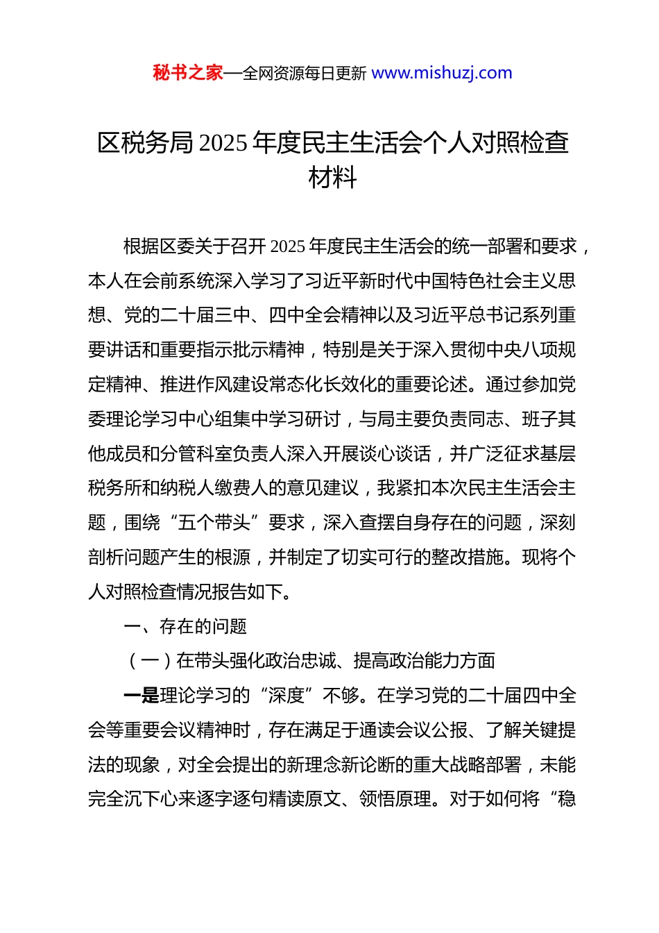 秘书之家—全网资源每日更新 www.mishuzj.com区税务局 2025 年度民主生活会个人对照检查材料 根据区委关于召开 2025 年度民主生活会的统一部署和要求,本人在会前系统深入学习了习近平新时代中国特色社会主义思想、党的二十届三中、四中全会精神以及习近平总书记系列重要讲话和重要指示批示精神,特别是关于深入贯彻中央八项规定精神、推进作风建设常态化长效化的重要论述。通过参加党委理论学习中心组集中学习研讨,与局主要负责同志、班子其他成员和分管科室负责人深入开展谈心谈话,并广泛征求基层税务所和纳税人缴费人的意见建议,我紧扣本次民主生活会主题,围绕“五个带头”要求,深入查摆自身存在的问题,深刻剖析问题产生的根源,并制定了切实可行的整改措施。现将个人对照检查情况报告如下。一、存在的问题(一)在带头强化政治忠诚、提高政治能力方面一是理论学习的“深度”不够。在学习党的二十届四中全会等重要会议精神时,存在满足于通读会议公报、了解关键提法的现象,对全会提出的新理念新论断的重大战略部署,未能完全沉下心来逐字逐句精读原文、领悟原理。对于如何将“稳秘书之家—全网资源每日更新 www.mishuzj.com预期、增信心、激活力”的宏观政策要求,转化为税收工作的具体思路和举措,缺乏系统性、前瞻性的思考,导致对税收工作政治属性的认识停留在宏观层面,未能完全内化为指导具体业务的行动自觉。二是政策转化的“速度”不快。对中央大政方针的政治领悟力和执行穿透力有待加强。例如,2025 年,中央经济工作会议明确提出要加大对“专精特新”企业的支持力度,但我分管的征管和纳税服务部门,直到第 2 季度才正式出台针对性的“一户一策”精准辅导方案。虽然最终为我区 15 家“专精特新”企业提供了服务,但相比兄弟区县晚了近两个月,这反映出我在推动顶层设计与基层实践相结合上,主动性和敏锐性不强,未能第一时间将中央精神转化为服务高质量发展的具体税收实践,影响了政策红利的即时释放。三是政治判断的“锐度”不足。在面对复杂舆情和意识形态斗争时,政治敏锐性和鉴别力不够强。2025 年 9 月,网络上出现关于我区即将试点某项财产类税收政策的不实传言,引发了部分群众和企业的焦虑。作为分管领导,我最初的反应是组织业务骨干从税法专业角度准备辟谣材料,强调其技术上的不可行性,而忽视了第一时间从维护社会稳定、安定人心的政治高度去研判和应对。这种重业务、轻政治的惯性思维,导致我秘书之家—全网资源每日更新 www.mishuzj.com们在引导舆论、消除社会疑虑的斗争中一度陷入被动。(二)在带头固本培元、增强党性方面一是价值追求的“坐标”有偏移。在世界观、人生观、价值观这个“总开关”问题上,存在不自觉地以事务主义代替党性原则的倾向。在工作中,有时片面追求税收收入、征管效率等显性指标,而对税收工作背后的人民性体悟不深。2025 年第三季度组织税费收入期间,为确保完成当期收入目标,我曾催促征管部门加紧对**科技有限公司的历史欠税进行清缴。该公司当时正面临供应链中断的短期流动性困难,虽然我们的执法行为完全合法合规,但简单化的处理方式险些成为压垮这家雇佣了 50 多名员工的企业的“最后一根稻草”。这件事深刻暴露了我在践行“为民收税”理念时,未能完全站稳人民立场。二是组织生活的“炉温”不够高。对参加双重组织生活的重要性认识不足,有时以工作繁忙为由,思想上不自觉地将业务会议置于组织生活之上。经查,2025 年度,我所在的第一党支部共组织了 12 次主题党日活动和专题学习,我因参加上级会议、处理紧急公务等原因请假 2 次,虽然履行了请假手续,但反映出我未能正确处理工学矛盾,没有把参加组织生活作为加强党性锻炼、接受党员监督的硬约束,党员的先锋模范作用发挥不充分。秘书之家—全网资源每日更新 www.mishuzj.com三是自我革命的“刀锋”不够利。在开展批评和自我批评时,存在“爱惜羽毛”的思想,剖析自身问题不够深入、不够彻底。在年终总结和述职述廉报告中,往往讲成绩头头是道,摆问题则点到为止,多以客观因素作为解释,缺少主动揭短亮丑、深挖思想根源的勇气。...