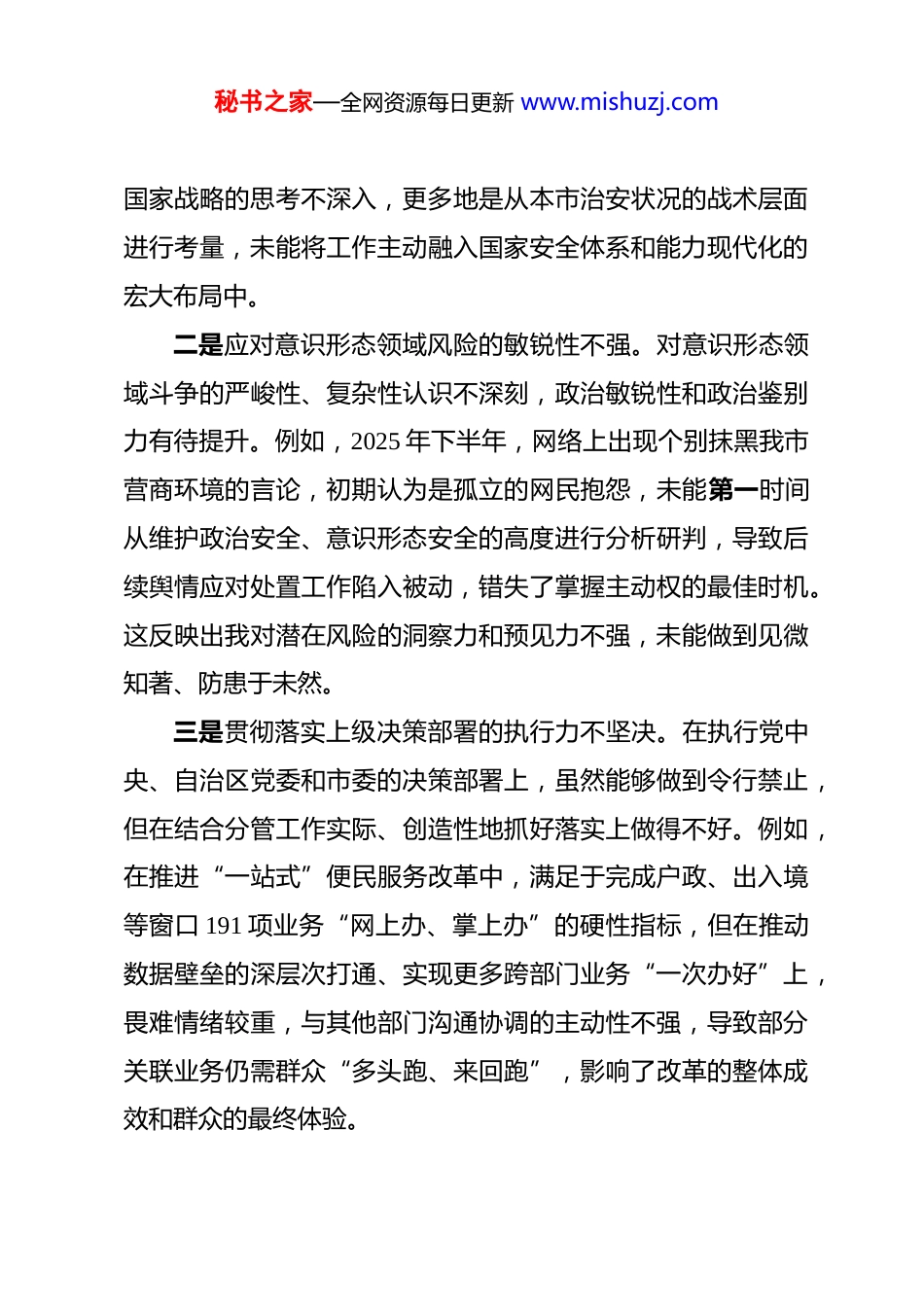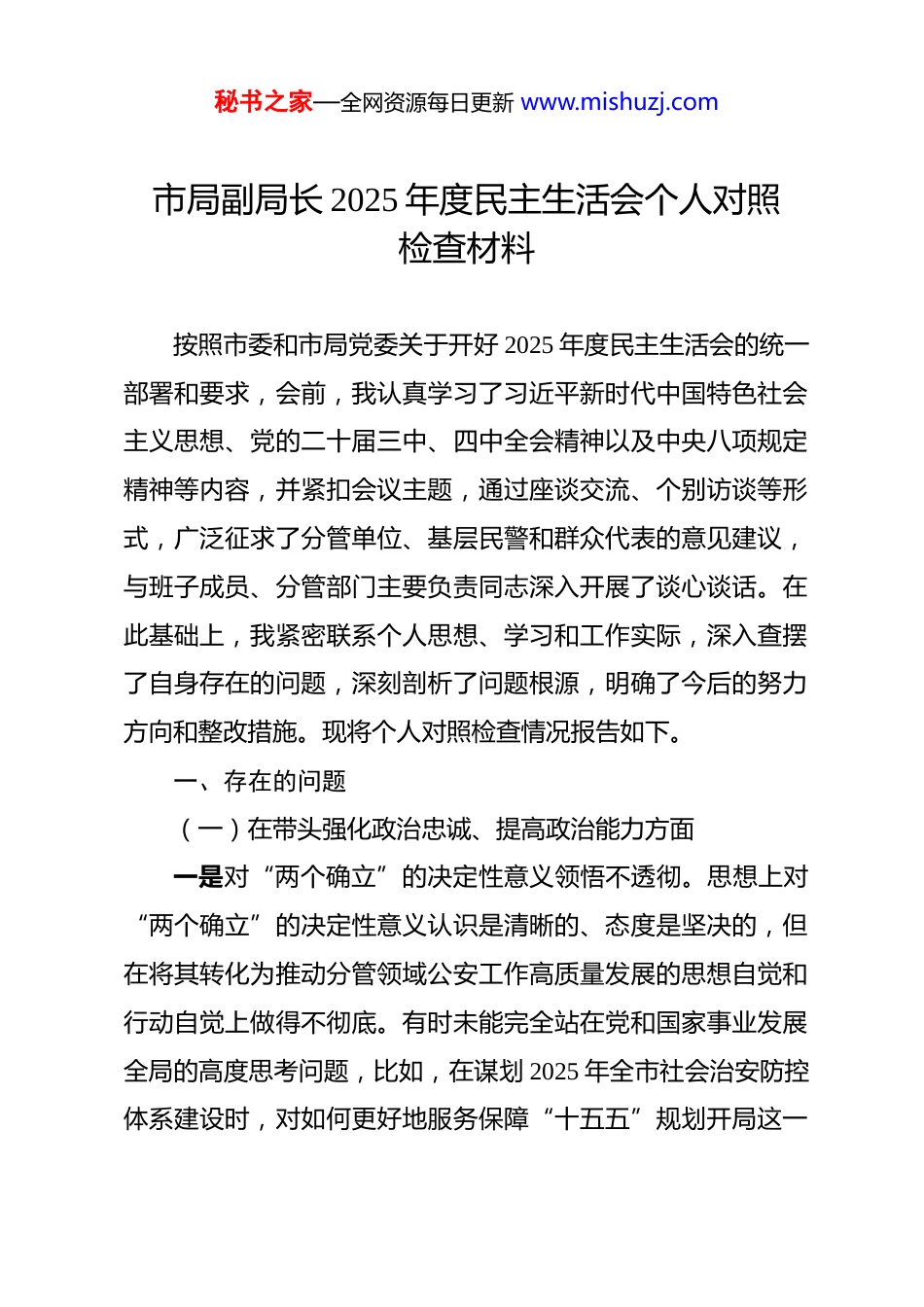 秘书之家—全网资源每日更新 www.mishuzj.com市局副局长 2025 年度民主生活会个人对照检查材料 按照市委和市局党委关于开好 2025 年度民主生活会的统一部署和要求,会前,我认真学习了习近平新时代中国特色社会主义思想、党的二十届三中、四中全会精神以及中央八项规定精神等内容,并紧扣会议主题,通过座谈交流、个别访谈等形式,广泛征求了分管单位、基层民警和群众代表的意见建议,与班子成员、分管部门主要负责同志深入开展了谈心谈话。在此基础上,我紧密联系个人思想、学习和工作实际,深入查摆了自身存在的问题,深刻剖析了问题根源,明确了今后的努力方向和整改措施。现将个人对照检查情况报告如下。一、存在的问题(一)在带头强化政治忠诚、提高政治能力方面一是对“两个确立”的决定性意义领悟不透彻。思想上对“两个确立”的决定性意义认识是清晰的、态度是坚决的,但在将其转化为推动分管领域公安工作高质量发展的思想自觉和行动自觉上做得不彻底。有时未能完全站在党和国家事业发展全局的高度思考问题,比如,在谋划 2025 年全市社会治安防控体系建设时,对如何更好地服务保障“十五五”规划开局这一秘书之家—全网资源每日更新 www.mishuzj.com国家战略的思考不深入,更多地是从本市治安状况的战术层面进行考量,未能将工作主动融入国家安全体系和能力现代化的宏大布局中。二是应对意识形态领域风险的敏锐性不强。对意识形态领域斗争的严峻性、复杂性认识不深刻,政治敏锐性和政治鉴别力有待提升。例如,2025 年下半年,网络上出现个别抹黑我市营商环境的言论,初期认为是孤立的网民抱怨,未能第一时间从维护政治安全、意识形态安全的高度进行分析研判,导致后续舆情应对处置工作陷入被动,错失了掌握主动权的最佳时机。这反映出我对潜在风险的洞察力和预见力不强,未能做到见微知著、防患于未然。三是贯彻落实上级决策部署的执行力不坚决。在执行党中央、自治区党委和市委的决策部署上,虽然能够做到令行禁止,但在结合分管工作实际、创造性地抓好落实上做得不好。例如,在推进“一站式”便民服务改革中,满足于完成户政、出入境等窗口 191 项业务“网上办、掌上办”的硬性指标,但在推动数据壁垒的深层次打通、实现更多跨部门业务“一次办好”上,畏难情绪较重,与其他部门沟通协调的主动性不强,导致部分关联业务仍需群众“多头跑、来回跑”,影响了改革的整体成效和群众的最终体验。秘书之家—全网资源每日更新 www.mishuzj.com(二)在带头固本培元、增强党性方面一是理论学习与实践运用结合不紧密。在学习习近平新时代中国特色社会主义思想时,系统性、全面性做得不好,存在“干什么学什么、缺什么补什么”的实用主义倾向。对党的二十届四中全会提出的“健全全面从严治党体系”等新论断新要求的学习,停留在通读公报、听取传达的层面,但在如何指导分管的经侦、禁毒等队伍建设,构建权责清晰、运行高效的内部监督体系方面,缺乏深入研究和具体举措,导致理论学习与公安实践“两张皮”现象依然存在。二是党性锤炼的自觉性主动性不高。作为一名在公安战线工作多年的老党员,有时会产生“歇歇脚、松口气”的念头,自我革命精神有所懈怠。党性分析和自我剖析的“辣味”不浓,习惯于“隔靴搔痒”,不愿真正触及思想深处的矛盾和问题。在参加党支部组织生活时,更多地是以领导身份作指导、提要求,而以普通党员身份接受教育、接受监督的自觉性不强,批评与自我批评的武器运用得不好。三是价值观念的“总开关”拧得不牢固。在世界观、人生观、价值观的改造上自我要求不严格,艰苦奋斗、勤俭节约的意识有所淡化。例如,在审批分管部门的经费预算时,对于一些可开可不开的会议、可搞可不搞的活动,有时考虑到“提振秘书之家—全网资源每日更新 www.mishuzj.com士气”“搞好关系”,把关不严,审批放行。这反映出我在思想深处对享乐主义、奢靡之风的危害性认识不足,未能时时刻刻用共产党员的标准严格要求自己,防微杜渐的堤坝筑得不牢。(三)在带头敬畏人民、敬畏组织、敬畏法纪方面一是践行群众路线的方式方法不深入。落实“四下基层”制度不扎实,存...