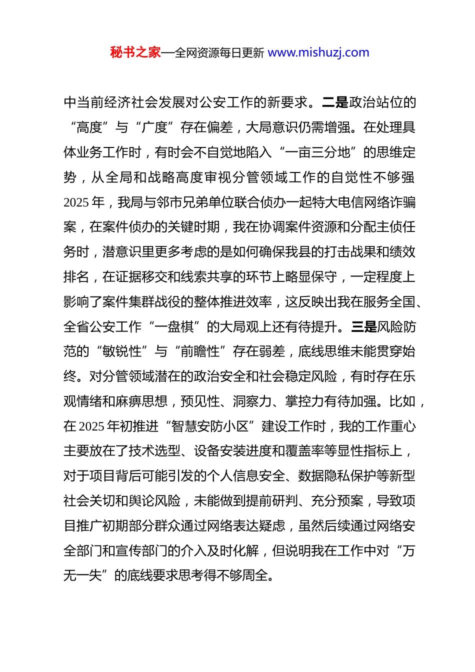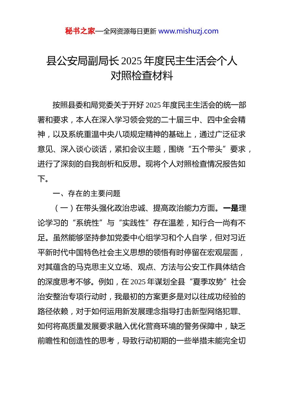 秘书之家—全网资源每日更新 www.mishuzj.com县公安局副局长 2025 年度民主生活会个人对照检查材料 按照县委和局党委关于开好 2025 年度民主生活会的统一部署和要求,本人在深入学习领会党的二十届三中、四中全会精神,以及系统重温中央八项规定精神的基础上,通过广泛征求意见、深入谈心谈话,紧扣会议主题,围绕“五个带头”要求,进行了深刻的自我剖析和反思。现将个人对照检查情况报告如下。一、存在的主要问题(一)在带头强化政治忠诚、提高政治能力方面。一是理论学习的“系统性”与“实践性”存在温差,知行合一尚有不足。虽然能够坚持参加党委中心组学习和个人自学,但对习近平新时代中国特色社会主义思想的领悟有时停留在宏观层面,对其蕴含的马克思主义立场、观点、方法与公安工作具体结合的深度思考不够。例如,在 2025 年谋划全县“夏季攻势”社会治安整治专项行动时,我最初的方案更多是对以往成功经验的路径依赖,对于如何运用新发展理念指导打击新型网络犯罪、如何将高质量发展要求融入优化营商环境的警务保障中,缺乏前瞻性和创造性的思考,导致行动初期的一些举措未能完全切秘书之家—全网资源每日更新 www.mishuzj.com中当前经济社会发展对公安工作的新要求。二是政治站位的“高度”与“广度”存在偏差,大局意识仍需增强。在处理具体业务工作时,有时会不自觉地陷入“一亩三分地”的思维定势,从全局和战略高度审视分管领域工作的自觉性不够强2025 年,我局与邻市兄弟单位联合侦办一起特大电信网络诈骗案,在案件侦办的关键时期,我在协调案件资源和分配主侦任务时,潜意识里更多考虑的是如何确保我县的打击战果和绩效排名,在证据移交和线索共享的环节上略显保守,一定程度上影响了案件集群战役的整体推进效率,这反映出我在服务全国、全省公安工作“一盘棋”的大局观上还有待提升。三是风险防范的“敏锐性”与“前瞻性”存在弱差,底线思维未能贯穿始终。对分管领域潜在的政治安全和社会稳定风险,有时存在乐观情绪和麻痹思想,预见性、洞察力、掌控力有待加强。比如,在 2025 年初推进“智慧安防小区”建设工作时,我的工作重心主要放在了技术选型、设备安装进度和覆盖率等显性指标上,对于项目背后可能引发的个人信息安全、数据隐私保护等新型社会关切和舆论风险,未能做到提前研判、充分预案,导致项目推广初期部分群众通过网络表达疑虑,虽然后续通过网络安全部门和宣传部门的介入及时化解,但说明我在工作中对“万无一失”的底线要求思考得不够周全。秘书之家—全网资源每日更新 www.mishuzj.com(二)在带头固本培元、增强党性方面。一是理想信念扎根不深,思想改造偶有松懈。在繁重复杂的日常工作压力下,有时产生了“以干代学”的错误倾向,认为只要把业务工作抓好了,就是对党最好的忠诚。因此,对党性修养的持续锤炼有所放松,用理论武装改造主观世界的自觉性、主动性下降。偶尔因为白天处理紧急警情、夜晚加班研究案情,就放松了当天的“学习强国”积分任务,认为这是“情有可原”的小事,实质上反映出内心深处对“理论滋养”和“精神补钙”的极端重要性认识出现了弱化。二是党性锤炼标准不高,自我要求偶有降低。在党内政治生活中,有时存在“老好人”思想,自我批评“怕揭短”,批评同志“怕伤人”。在分管部门的组织生活会上,对于一些同志发言中存在的避重就轻、泛泛而谈的现象,有时只是点到为止,没有“红脸出汗”的辣味的问题。2025 年审阅一份下级单位报送的社区警务工作创新举措汇报材料时,发现其中存在一些套话空话、照搬照抄的痕迹,我虽然在口头上提出了批评,但考虑到该单位近期任务繁重,最终没有严令其推倒重来,这实际上是在工作标准和自我要求上打了折扣。三是宗旨意识践行不力,为民情怀偶有淡化。随着职务的提升和工作领域的转变,深入一线、直面群众的机会相对减少,对群众的所思所想、所急所盼的感知不如从前真切。在落实“局秘书之家—全网资源每日更新 www.mishuzj.com长接待日”制度时,虽然能够做到认真倾听、耐心记录,但有时将问题批转给相关警种部门后,便认为完成了任务。例如,2025 年夏天,有群...