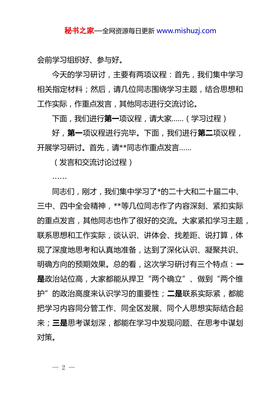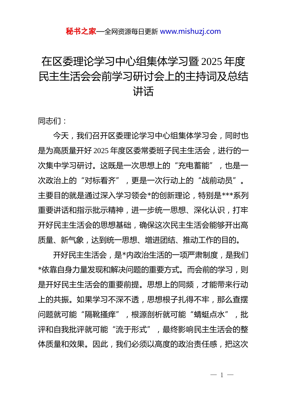 秘书之家—全网资源每日更新 www.mishuzj.com在区委理论学习中心组集体学习暨 2025 年度民主生活会会前学习研讨会上的主持词及总结讲话同志们:今天,我们召开区委理论学习中心组集体学习会,同时也是为高质量开好 2025 年度区委常委班子民主生活会,进行的一次集中学习研讨。这既是一次思想上的“充电蓄能”,也是一次政治上的“对标看齐”,更是一次行动上的“战前动员”。主要目的就是通过深入学习领会*的创新理论,特别是***系列重要讲话和指示批示精神,进一步统一思想、深化认识,打牢开好民主生活会的思想基础,确保这次民主生活会能够开出高质量、新气象,达到统一思想、增进团结、推动工作的目的。开好民主生活会,是*内政治生活的一项严肃制度,是我们*依靠自身力量发现和解决问题的重要方式。而会前的学习,则是开好民主生活会的重要前提。思想上的同频,才能带来行动上的共振。如果学习不深不透,思想根子扎得不牢,那么查摆问题就可能“隔靴搔痒”,根源剖析就可能“蜻蜓点水”,批评和自我批评就可能“流于形式”,最终影响民主生活会的整体质量和效果。因此,我们必须以高度的政治责任感,把这次— 1 —秘书之家—全网资源每日更新 www.mishuzj.com会前学习组织好、参与好。今天的学习研讨,主要有两项议程:首先,我们集中学习相关指定材料;然后,请几位同志围绕学习主题,结合思想和工作实际,作重点发言,其他同志进行交流讨论。下面,我们进行第一项议程,请大家……(学习过程)好,第一项议程进行完毕。下面,我们进行第二项议程,开展学习研讨。首先,请**同志作重点发言……(发言和交流讨论过程)……同志们,刚才,我们集中学习了*的二十大和二十届二中、三中、四中全会精神,**等几位同志作了内容深刻、紧扣实际的重点发言,其他同志也作了很好的交流。大家紧扣学习主题,联系思想和工作实际,谈认识、讲体会、找差距、说打算,体现了深度地思考和认真地准备,达到了深化认识、凝聚共识、明确方向的预期效果。总的看,这次学习研讨有三个特点:一是政治站位高,大家都能从捍卫“两个确立”、做到“两个维护”的政治高度来认识学习的重要性;二是联系实际紧,都能把学习内容同分管工作、同全区发展、同个人思想实际结合起来;三是思考谋划深,都能在学习中发现问题、在思考中谋划对策。— 2 —秘书之家—全网资源每日更新 www.mishuzj.com开好民主生活会,是检验我们政治能力和*性修养的“试金石”。这次学习研讨,只是一个开始。下面,我结合今天的学习和同志们的发言,再讲三点意见,既是对这次学习的总结,也是对下一步开好民主生活会的具体要求。一、深化思想认识,筑牢开好民主生活会的“压舱石”思想是行动的先导,理论是实践的指南。通过今天的学习研讨,我们必须在思想认识上达到新的高度,为开好民主生活会奠定坚实的思想基础。(一)在深学细悟中,进一步铸牢了“绝对忠诚”的政治品格。旗帜鲜明讲政治、保证*的团结和集中统一是*的生命,也是我们*能成为百年大*、创造世纪伟业的关键所在。通过重温***的重要论述,我们更加深刻地认识到,“两个确立”是新时代取得一切成就最根本的保证。对*忠诚,不是抽象的口号,而是具体的、实践的。它体现在我们坚决贯彻*中央决策部署的实际行动中,体现在我们驾驭复杂局面、应对风险挑战的政治能力上,体现在我们日常的一言一行、一举一动中。我们必须把对“两个确立”决定性意义的深刻领悟,转化为做到“两个维护”的高度自觉,时时刻刻在思想上政治上行动上同以***同志为核心的*中央保持高度一致,确保我区的各项事业始终沿着正确的政治方向前进。— 3 —秘书之家—全网资源每日更新 www.mishuzj.com(二)在深学细悟中,进一步厚植了“人民至上”的执政情怀。“江山就是人民,人民就是江山。”***的谆谆教诲,是我们一切工作的出发点和落脚点。回顾过去一年的工作,我们推动了城区老旧管网改造工程,惠及群众超过 3.5 万户;我们新建和改扩建了 3 所学校,增加了*个优质学位;我们推动了医联体建设,让群众在家门口就能享受到更优质的医疗服务。这些成绩的取得,正是我们践行以人民...