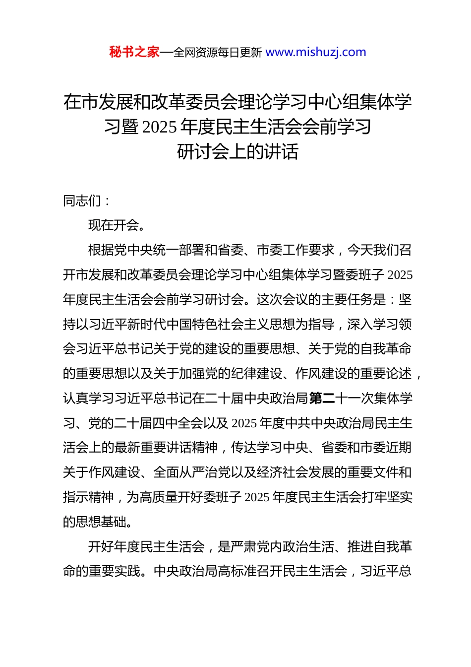 秘书之家—全网资源每日更新 www.mishuzj.com在市发展和改革委员会理论学习中心组集体学习暨 2025 年度民主生活会会前学习研讨会上的讲话 同志们:现在开会。根据党中央统一部署和省委、市委工作要求,今天我们召开市发展和改革委员会理论学习中心组集体学习暨委班子 2025年度民主生活会会前学习研讨会。这次会议的主要任务是:坚持以习近平新时代中国特色社会主义思想为指导,深入学习领会习近平总书记关于党的建设的重要思想、关于党的自我革命的重要思想以及关于加强党的纪律建设、作风建设的重要论述,认真学习习近平总书记在二十届中央政治局第二十一次集体学习、党的二十届四中全会以及 2025 年度中共中央政治局民主生活会上的最新重要讲话精神,传达学习中央、省委和市委近期关于作风建设、全面从严治党以及经济社会发展的重要文件和指示精神,为高质量开好委班子 2025 年度民主生活会打牢坚实的思想基础。开好年度民主生活会,是严肃党内政治生活、推进自我革命的重要实践。中央政治局高标准召开民主生活会,习近平总秘书之家—全网资源每日更新 www.mishuzj.com书记发表重要讲话,为全党树立了标杆、作出了示范。我们必须深刻认识开好这次民主生活会的重大意义,将其作为一项重要的政治任务来抓。会前,委班子成员按照要求,认真自学了《习近平谈治国理政》第五卷、党章、《中国共产党纪律处分条例》以及习近平总书记系列重要论述和指示精神,为集中研讨作了充分准备。今天的会议共有四项议程。下面,进行第一项议程:由我简要通报近期理论学习中心组自学总体情况,并就重点学习内容谈几点认识和体会。近期,委班子成员紧紧围绕民主生活会主题,聚焦规定的学习篇目,开展了系统深入的自学。大家坚持读原著、学原文、悟原理,重点学习了习近平总书记关于党的自我革命的重要思想。这一思想是我们党坚持“两个结合”推进理论创新取得的新成果,深刻阐释了我们党为何要自我革命、为何能自我革命、怎样推进自我革命等重大课题,其核心要义集中体现为“九个以”的实践要求。通过学习,我们更加深刻地认识到,自我革命是我们党跳出治乱兴衰历史周期率的第二个答案,全面从严治党是新时代党的自我革命最鲜明的特征和最伟大的实践。我们必须以永远在路上的坚韧和执着,把党的伟大自我革命进行到底。秘书之家—全网资源每日更新 www.mishuzj.com我们深入学习了习近平总书记在二十届中央政治局第二十一次集体学习时的重要讲话精神。习近平总书记鲜明提出推进党的自我革命要做到“五个进一步到位”的重要要求,即对党的自我革命认识要进一步到位、党员干部增强党性要进一步到位、权力规范运行要进一步到位、从严监督执纪要进一步到位、落实管党治党责任要进一步到位。这“五个进一步到位”,是对新征程上推进党的自我革命的再动员、再部署,为我们深化自我革命指明了具体路径和着力点。对于发展和改革工作而言,每一项决策、每一个项目、每一笔资金都关系到经济社会发展大局和人民群众切身利益,必须将“五个进一步到位”的要求贯穿于管党治党和业务工作全过程,确保权力在阳光下运行,项目在规范中推进。我们持续学习了党章和《中国共产党纪律处分条例》。党章是党的根本大法,是全党必须遵循的总规矩。《条例》是规范党组织和党员行为的基础性法规。通过学习,大家进一步明确了党的纪律规矩是什么,弄明白了能干什么、不能干什么,增强了政治定力、纪律定力、道德定力、抵腐定力。我们深刻体会到,党的纪律是党的生命线,严明的纪律是维护党的团结统一、完成党的任务的根本保证。作为经济综合管理部门干部,必须带头学纪、知纪、明纪、守纪,始终做到忠诚干净担当。秘书之家—全网资源每日更新 www.mishuzj.com我们重温了中央八项规定及其实施细则精神。中央八项规定是长期有效的铁规矩、硬杠杠。今年在全党开展的深入贯彻中央八项规定精神学习教育,是习近平总书记亲自点题、亲自部署的一项重要工作。通过学习,我们更加清醒地认识到,作风问题本质上是党性问题,核心是党同人民群众的关系问题。发改部门虽然不是窗口单位,但我们的政策制定、规划编制、项目审批直接关...