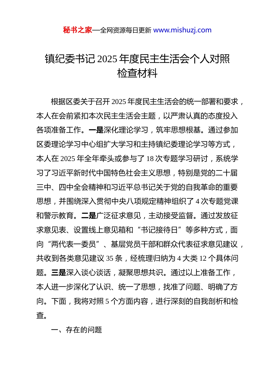 秘书之家—全网资源每日更新 www.mishuzj.com镇纪委书记 2025 年度民主生活会个人对照检查材料 根据区委关于召开 2025 年度民主生活会的统一部署和要求,本人在会前紧扣本次民主生活会主题,以严肃认真的态度投入各项准备工作。一是深化理论学习,筑牢思想根基。通过参加区委理论学习中心组扩大学习和主持镇纪委理论学习等方式,本人在 2025 年全年牵头或参与了 18 次专题学习研讨,系统学习了习近平新时代中国特色社会主义思想,特别是党的二十届三中、四中全会精神和习近平总书记关于党的自我革命的重要思想,并围绕深入贯彻中央八项规定精神组织了 4 次专题党课和警示教育。二是广泛征求意见,主动接受监督。通过发放征求意见表、设置线上意见箱和“书记接待日”等多种方式,面向“两代表一委员”、基层党员干部和群众代表征求意见建议,共收到各类意见建议 35 条,经梳理归纳为 4 大类 12 个具体问题。三是深入谈心谈话,凝聚思想共识。通过以上准备工作,本人进一步深化了认识、统一了思想,找准了问题、明确了方向。下面,我将对照 5 个方面内容,进行深刻的自我剖析和检查。一、存在的问题秘书之家—全网资源每日更新 www.mishuzj.com(一)带头强化政治忠诚方面,理论武装的“深度”有欠缺,政治能力的“锐度”有待磨砺一是理论学习的转化效果不实。虽然能够按时完成各项学习任务,但在将党的创新理论与纪检监察工作实践深度融合上思考不深,未能完全将学习成果转化为推动高质量发展的监督效能。二是政治风险的洞察能力不强。对一些苗头性、倾向性问题背后的政治因素、政治影响认识不足,未能做到见微知著、防患未然。三是政治斗争的攻坚精神不足。在原则问题上能够做到立场坚定,但在面对一些盘根错节、阻力较大的“老大难”问题时,有时会滋生求稳怕乱的思想,斗争的彻底性不够。(二)带头固本培元方面,党性修养的“纯度”有欠缺,理想信念的“硬度”有待锤炼一是党内政治生活的熔炉作用发挥不好。作为纪委书记,在参加镇党委班子民主生活会或以普通党员身份参加支部组织生活会时,开展相互批评有时还“辣味”不足。更多的是谈工作、谈现象,怕伤和气、怕影响团结,对于一些同志思想深处的问题点得不深、不透。比如,在去年的组织生活会上,我对一位班子成员的批评意见是“联系基层有时不够密切”,但没秘书之家—全网资源每日更新 www.mishuzj.com有进一步指出其根源是群众立场树得不牢、官本位思想尚未根除的问题。二是精神追求的境界标准要求不高。随着工作阅历的增长,有时会不自觉地产生“歇歇脚”的念头,在改造主观世界上所下的功夫有所减弱。满足于事务性工作多,静下心来读原著、学原文、悟原理的时间被挤占,导致理论素养和精神境界的提升进入了“平台期”。2025 年,我给自己定下了通读《习近平著作选读》第二卷的目标,但至今仍有近三分之一的篇目未完成精读,学习笔记仅记录了不到 2 万字。三是为民服务的宗旨情怀扎根不深。虽然也经常下基层,但有时存在“被动下访”多、“主动解题”少的情况。对于群众反映强烈的诉置,有时未能做到第一时间响应、全过程跟踪。2025 年 10 月,有群众多次通过便民热线反映**社区一处建筑垃圾清运不及时、影响环境的问题。我虽然批示给了相关部门办理,但没有亲自到现场督办核实,导致问题拖延了近 20 天才得到彻底解决,反映出我“马上就办、真抓实干”的作风还不够扎实。(三)带头敬畏人民组织法纪方面,群众路线的“温度”有欠缺,权力观念的“准度”有待校正一是践行“四下基层”制度不主动。全年虽然下到村(社秘书之家—全网资源每日更新 www.mishuzj.com区)开展调研、信访接待等工作合计超过 40 次,但真正带着问题、沉到一线“解剖麻雀”式的深度调研不多。例如,在推进“清廉村居”建设工作中,我更多的是在会议上作部署、听汇报,但在 2025 年,我仅选取了 2 个村作为联系点进行蹲点调研,对全镇**个村(社区)在建设中遇到的普遍性困难和个性化问题掌握得不够全面、不够精准,导致后续出台的一些指导性文件针对性不强。二是执行民主集中制的自觉性不好。在纪委内部的...