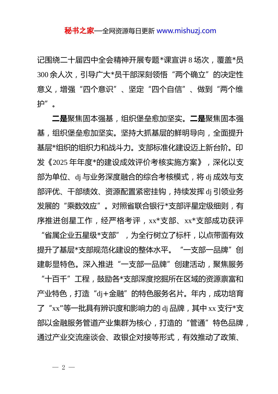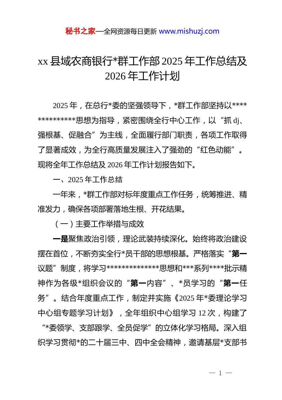 秘书之家—全网资源每日更新 www.mishuzj.comxx 县域农商银行*群工作部 2025 年工作总结及2026 年工作计划2025 年,在总行*委的坚强领导下,*群工作部坚持以**************思想为指导,紧密围绕全行中心工作,以“抓 dj、强根基、促融合”为主线,全面履行部门职责,各项工作取得了显著成效,为全行高质量发展注入了强劲的“红色动能”。现将全年工作总结及 2026 年工作计划报告如下。一、2025 年工作总结一年来,*群工作部对标年度重点工作任务,统筹推进、精准发力,确保各项部署落地生根、开花结果。(一)主要工作举措与成效一是聚焦政治引领,理论武装持续深化。始终将政治建设摆在首位,不断夯实全行*员干部的思想根基。严格落实“第一议题”制度,将学习**************思想和***系列****批示精神作为各级*组织会议的“第一内容”、*员学习的“第一任务”。结合年度重点工作,制定并实施《2025 年*委理论学习中心组专题学习计划》,全年组织中心组学习 12 次,构建了“*委领学、支部跟学、全员促学”的立体化学习格局。深入组织学习贯彻*的二十届三中、四中全会精神,邀请基层*支部书— 1 —秘书之家—全网资源每日更新 www.mishuzj.com记围绕二十届四中全会精神开展专题*课宣讲 8 场次,覆盖*员300 余人次,引导广大*员干部深刻领悟“两个确立”的决定性意义,增强“四个意识”、坚定“四个自信”、做到“两个维护”。二是聚焦固本强基,组织堡垒愈加坚实。二是聚焦固本强基,组织堡垒愈加坚实。坚持大抓基层的鲜明导向,全面提升基层*组织的组织力和战斗力。支部标准化建设迈上新台阶。印发《2025 年年度*的建设成效评价考核实施方案》,深化以支部为单位、dj 与业务深度融合的综合考核模式,将 dj 成效与支部评优、干部绩效、资源配置紧密挂钩,持续发挥 dj 引领业务发展的“乘数效应”。对照省联合银行*支部评星定级细则,有序推进创星工作,经严格考评,xx*支部、xx*支部成功获评“省属企业五星级*支部”,为全行树立了标杆,以点带面有效提升了基层*支部规范化建设的整体水平。“一支部一品牌”创建彰显特色。深入推进“一支部一品牌”创建活动,聚焦服务“十百千”工程,鼓励各*支部深度挖掘所在区域的资源禀富和产业特色,打造“dj+金融”的特色服务名片。年内,成功培育了“xx”等一批具有辨识度和影响力的 dj 品牌,其中 xx 支行*支部以金融服务管道产业集群为核心,打造的“管通”特色品牌,通过产业交流座谈会、政银企对接等形式,有效推动了政策、— 2 —秘书之家—全网资源每日更新 www.mishuzj.com资金与产业的精准对接,助力地方产业集群做大做强。三是聚焦文化铸魂,品牌形象焕发新彩。将企业文化建设作为增强队伍凝聚力和品牌影响力的重要抓手。年度重点项目dj 行史馆建设工作稳步推进。目前,已正式成立由多部门组成的专项工作小组,明确了职责分工和时间节点。为丰富馆藏内容,面向全行员工及退休职工广泛征集历史资料,截至目前已征集到各类票据、印章、算盘、工服等老物件 38 件;同步开展老员工口述史访谈 15 人次,记录了大量珍贵的一手资料。为博采众长,工作小组已组织赴周边 3 家兄弟农商行进行了现场参观和深度交流。下阶段,将积极配合相关部门,依规完成 dj 行史馆设计与施工的招标工作,力争将其打造为传承红色基因、展现农商精神的重要载体。四是聚焦从严治*,纪律作风持续向好。坚定不移推进全面从严治*,营造风清气正的政治生态。扎实开展中央八项规定精神学习教育,制定印发学习教育实施方案,指导各*支部制定详细学习计划,全年下发工作提示 13 期,开展 2 轮全覆盖督导检查。总行*委班子成员带头深入基层开展调查研究,累计搜集意见建议 71 条,领导班子查摆问题 8 条,为精准整改提供了依据。同时,严把*员“入口关”,注重在业务一线和青年员工中发展*员,全年完成 6 名预备*员的转正和发展工作,为*组织注入了— 3 —秘书之家—全网资源每日更新 www.mishuzj.com新鲜血液。五是聚焦意识形态,思想阵地坚固牢靠。严格落实意识形态工作责任制,将其纳入年度基层 dj 工作培训...