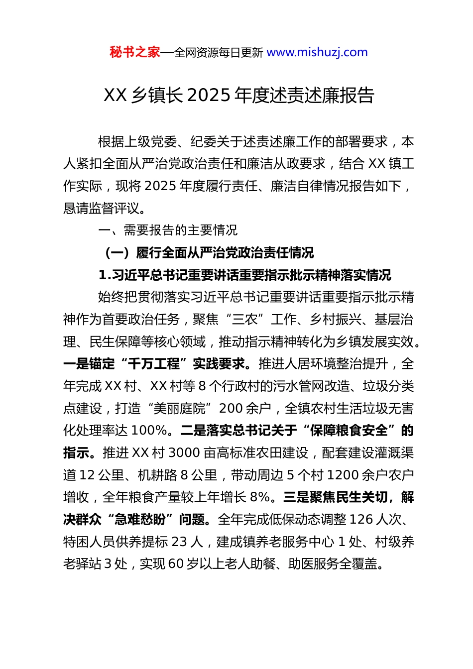 秘书之家—全网资源每日更新 www.mishuzj.comXX 乡镇长 2025 年度述责述廉报告根据上级党委、纪委关于述责述廉工作的部署要求,本人紧扣全面从严治党政治责任和廉洁从政要求,结合 XX 镇工作实际,现将 2025 年度履行责任、廉洁自律情况报告如下,恳请监督评议。一、需要报告的主要情况(一)履行全面从严治党政治责任情况1.习近平总书记重要讲话重要指示批示精神落实情况 始终把贯彻落实习近平总书记重要讲话重要指示批示精神作为首要政治任务,聚焦“三农”工作、乡村振兴、基层治理、民生保障等核心领域,推动指示精神转化为乡镇发展实效。一是锚定“千万工程”实践要求。推进人居环境整治提升,全年完成 XX 村、XX 村等 8 个行政村的污水管网改造、垃圾分类点建设,打造“美丽庭院”200 余户,全镇农村生活垃圾无害化处理率达 100%。二是落实总书记关于“保障粮食安全”的指示。推进 XX 村 3000 亩高标准农田建设,配套建设灌溉渠道 12 公里、机耕路 8 公里,带动周边 5 个村 1200 余户农户增收,全年粮食产量较上年增长 8%。三是聚焦民生关切,解决群众“急难愁盼”问题。全年完成低保动态调整 126 人次、特困人员供养提标 23 人,建成镇养老服务中心 1 处、村级养老驿站 3 处,实现 60 岁以上老人助餐、助医服务全覆盖。秘书之家—全网资源每日更新 www.mishuzj.com2.“第一议题”制度落实情况 严格执行党委会议“第一议题”制度,将学习习近平新时代中国特色社会主义思想、党的二十届四中全会精神作为每次党委会“开篇内容”,全年组织“第一议题”学习 24 次,其中专题学习党的二十届四中全会精神 6 次。为推动学习走深走实,牵头制定《XX 镇学习贯彻党的二十届四中全会精神实施方案》,组织班子成员、村党组织书记开展“送学下村”活动12 场,覆盖党员干部、群众代表 3200 余人;围绕全会提出的“完善基层治理体系”“健全乡村振兴保障机制”等部署,召开专题研讨会 4 次,梳理形成《XX 镇 2025 年重点工作任务清单》,明确产业发展、基层治理等 5 大类 28 项具体任务,逐项落实责任领导、责任科室和完成时限,目前已完成 25 项,剩余 3 项均按进度推进。3.“三重一大”事项决策情况 严格遵守民主集中制,全年共研究“三重一大”事项 15项(涉及重大项目 8 项、大额资金使用 4 项、重要人事任免 3项),均严格执行“会前酝酿、会上讨论、集体决策、会后公示”流程。例如,在 XX 镇污水处理厂建设项目(总投资 500万元)决策中,会前通过座谈会、入户走访等形式征求周边 6个村群众意见 132 条,邀请环保专家对项目方案进行论证;会上组织党委班子成员逐一发表意见,形成一致决议后,在镇政务公开栏、“XX 镇发布”公众号公示 7 天,无异议后启动招标。秘书之家—全网资源每日更新 www.mishuzj.com全年所有“三重一大”事项均未出现决策失误或群众投诉,涉及的 800 余万元资金全部按规定纳入国库集中支付,全程接受镇纪委监督。4.监督发现问题整改情况 针对 2025 年上半年上级巡察反馈的“民生服务窗口效率低”“XX 产业园区项目推进滞后”“村级财务核算不规范”3 类问题,牵头成立整改工作专班,制定《整改任务台账》,明确整改措施、责任人和完成时限。一是优化民生服务流程。将镇政务服务大厅 12 个窗口整合为“综合服务窗口”,推行“一窗通办”,配备 2 名导办员,群众办事平均时长从 40分钟缩短至 20 分钟,满意度达 98%。二是建立项目推进“周调度、月通报”机制。每周召开项目推进会,协调解决征地拆迁、资金拨付等问题,XX 产业园区项目于 10 月底按期完工,比原计划提前 1 个月。三是开展村级财务专项培训。邀请县财政局专家授课 2 次,覆盖全镇 15 个村的会计、报账员,同时规范报销流程,要求村级支出需经村务监督委员会审核签字,全年未再出现财务核算问题。目前 3 类问题已全部整改到位,通过上级巡察“回头看”验收。5.以案促改情况 结合周边乡镇发生的“村干部虚报种粮补贴”“违规处置集体资产”等典型案例,组织全镇干部开展以案促改警示教...