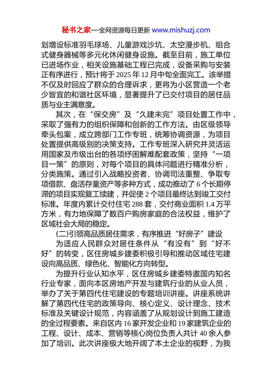 秘书之家—全网资源每日更新 www.mishuzj.comxx 单位 2025 年度住房城乡建设工作情况报告为深入贯彻落实中央城市工作会议精神,严格执行市委、市政府的决策部署及区委、区政府的年度工作安排,xx 区住房城乡建设委员会紧密结合本区发展实际,以提升人民群众生活品质为核心目标,系统性、多维度地扎实推进住房城乡建设领域的各项重点工作。一、2025 年度主要工作开展情况2025 年是推进城乡融合发展、提升城市功能品质的关键之年。区住房城乡建委围绕“稳地产、惠民生、提品质保安全”的工作主线,统筹推进各项任务,取得了阶段性成效。(一)聚焦房地产市场平稳健康发展,全力攻坚保交楼保交房面对房地产市场深度调整的宏观背景,区住房城乡建委始终将维护购房群众合法权益、防范化解房地产领域风险置于首要位置,集中力量打好保交房收官战及“久建未完”项目攻坚战。首先,在“保交楼”项目善后工作中,建立了常态化“回头看”工作机制。工作重心从确保项目竣工交付,延伸至交付后的品质提升与诉求解决,着力做好“后半篇文章”。例如,针对佳兆业樾伴山项目,在项目交付后,部分业主反映小区公共休闲活动区域配套设施不完备,未能满足全年龄段居民的活动需求。区领导高度重视,迅速召集区住房城乡建委、区文化旅游委、璧泉街道等相关部门单位,成立专项工作组,现场勘查并听取业主代表意见。通过专题会议研究,制定了详尽的整改提升方案。方案规秘书之家—全网资源每日更新 www.mishuzj.com划增设标准羽毛球场、儿童游戏沙坑、太空漫步机、组合式健身器械等多元化休闲健身设施。截至目前,施工单位已进场作业,相关设施基础工程已完成,设备采购与安装正有序进行,预计将于 2025 年 12 月中旬全面完工。该举措不仅及时回应了群众的合理诉求,更将为小区营造一个老少皆宜的和谐社区环境,显著提升了已交付项目的居住品质与业主满意度。其次,在“保交房”及“久建未完”项目处置工作中,采取了强有力的组织保障和创新的工作方法。由区级领导牵头包案,成立跨部门工作专班,统筹协调资源,为项目处置提供高级别的决策支持。工作专班深入研究并灵活运用国家及市级出台的各项纾困解难配套政策,坚持“一项目一策”的原则,对每个项目的具体问题进行精准分析,分类施策。通过引入战略投资者、协调司法重整、争取专项借款、盘活存量资产等多种方式,成功推动了 6 个长期停滞的项目实现复工续建,并促使 2 个项目最终达到竣工交付标准。年度内累计交付住宅 288 套,交付商业面积 1.4 万平方米,有力地保障了数百户购房家庭的合法权益,维护了区域社会大局的稳定。(二)引领高品质居住需求,有序推进“好房子”建设为适应人民群众对居住条件从“有没有”到“好不好”的转变,区住房城乡建委积极引导和推动区域住宅建设向高品质、绿色化、智能化方向转型。为提升行业认知水平,区住房城乡建委特邀国内知名行业专家,面向本区房地产开发与建筑行业的从业人员,举办了关于第四代住宅建设的专题培训讲座。讲座系统讲解了第四代住宅的政策导向、核心定义、设计理念、技术标准及关键设计规范,内容涵盖了从规划设计到施工建造的全过程要素。来自区内 16 家开发企业和 19 家建筑企业的工程、设计、成本、营销等核心岗位负责人共计 40 余人参加了培训。此次讲座极大地开阔了本土企业的视野,为我秘书之家—全网资源每日更新 www.mishuzj.com区推广庭院式、立体生态等新型住宅模式奠定了理论基础有效加快了我区“好房子”的建设进程。为吸引优质资本和先进开发理念,区住房城乡建委牵头组织了“2025 年 xx 区城市价值暨高品质建设用地推介会议”。会议全面展示了 xx 区的区位优势、产业基础、生态环境和未来规划,重点推介了一批区位优越、配套完善、适宜打造高品质住宅的建设用地。此举成功吸引了多家国内知名品牌房地产企业的关注与投资意向,为促进我区“好房子”建设、引入更多高水平开发项目创造了良好条件,从而推动 xx 城市能级的整体提升,为市民创造更高品质的生活空间。(三)完善住房保障体系,切实保障群众安居宜居区住房城乡建委持续健全以配售型保障性...