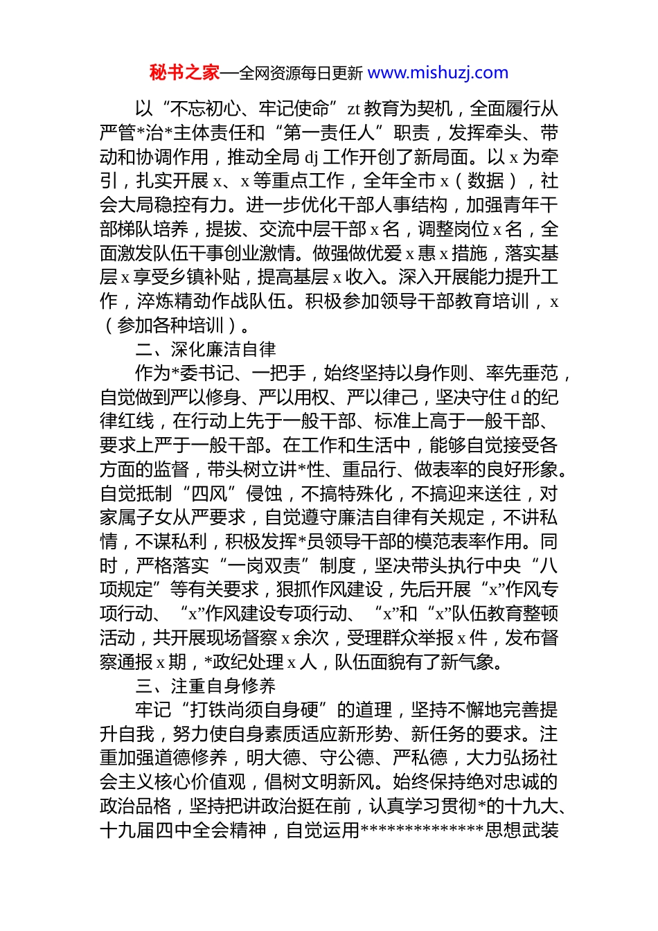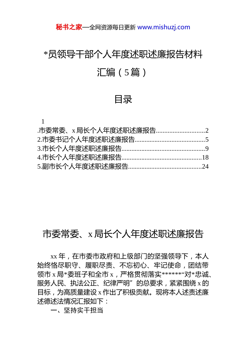 秘书之家—全网资源每日更新 www.mishuzj.com*员领导干部个人年度述职述廉报告材料汇编(5 篇)目录1.市委常委、x 局长个人年度述职述廉报告.............................22.市委书记个人年度述职述廉报告..........................................53.市长个人年度述职述廉报告..................................................94.市长个人年度述职述廉报告................................................185.副市长个人年度述职述廉报告............................................24市委常委、x 局长个人年度述职述廉报告xx 年,在市委市政府和上级部门的坚强领导下,本人始终恪尽职守、履职尽责、不忘初心、牢记使命,团结带领市 x 局*委班子和全市 x,严格贯彻落实******“对*忠诚、服务人民、执法公正、纪律严明”的总要求,紧紧围绕 x 的目标,为高质量建设 x 作出了积极贡献。现将本人述责述廉述德述法情况汇报如下:一、坚持实干担当秘书之家—全网资源每日更新 www.mishuzj.com以“不忘初心、牢记使命”zt 教育为契机,全面履行从严管*治*主体责任和“第一责任人”职责,发挥牵头、带动和协调作用,推动全局 dj 工作开创了新局面。以 x 为牵引,扎实开展 x、x 等重点工作,全年全市 x(数据),社会大局稳控有力。进一步优化干部人事结构,加强青年干部梯队培养,提拔、交流中层干部 x 名,调整岗位 x 名,全面激发队伍干事创业激情。做强做优爱 x 惠 x 措施,落实基层 x 享受乡镇补贴,提高基层 x 收入。深入开展能力提升工作,淬炼精劲作战队伍。积极参加领导干部教育培训,x(参加各种培训)。二、深化廉洁自律作为*委书记、一把手,始终坚持以身作则、率先垂范,自觉做到严以修身、严以用权、严以律己,坚决守住 d 的纪律红线,在行动上先于一般干部、标准上高于一般干部、要求上严于一般干部。在工作和生活中,能够自觉接受各方面的监督,带头树立讲*性、重品行、做表率的良好形象。自觉抵制“四风”侵蚀,不搞特殊化,不搞迎来送往,对家属子女从严要求,自觉遵守廉洁自律有关规定,不讲私情,不谋私利,积极发挥*员领导干部的模范表率作用。同时,严格落实“一岗双责”制度,坚决带头执行中央“八项规定”等有关要求,狠抓作风建设,先后开展“x”作风专项行动、“x”作风建设专项行动、“x”和“x”队伍教育整顿活动,共开展现场督察 x 余次,受理群众举报 x 件,发布督察通报 x 期,*政纪处理 x 人,队伍面貌有了新气象。三、注重自身修养牢记“打铁尚须自身硬”的道理,坚持不懈地完善提升自我,努力使自身素质适应新形势、新任务的要求。注重加强道德修养,明大德、守公德、严私德,大力弘扬社会主义核心价值观,倡树文明新风。始终保持绝对忠诚的政治品格,坚持把讲政治挺在前,认真学习贯彻*的十九大、十九届四中全会精神,自觉运用**************思想武装秘书之家—全网资源每日更新 www.mishuzj.com头脑、指导实践,推动工作,牢固树立“四个意识”,坚定“四个自信”,做到“两个维护”,在政治上、思想上和行动上自觉地同*中央保持高度一致。时刻坚持*的基本理论、基本路线不动摇,自觉维护中央的权威,坚决抵制各种违反*的政治纪律、影响*的团结统一、损害*的形象的言行。对各级*委的决策部署,做到迅速、准确、不折不扣的贯彻执行。坚持以一名普通*员的身份,积极参加 x*支部组织的活动,过实过好双重组织生活,充分利用民主生活会、组织生活会,认真开展*性“体检”,坚持批评与自我批评,不断锤炼*性修养。主动在思想上划出红线,在行为上明确界限,坚决防止“七个有之”。认真贯彻民主集中制,认真执行请示报告制度,切实维护班子团结。四、推进法治建设重视*委中心组集体学法制度建设,坚持集中学习与个人自学相结合,重点学习贯彻*的十九大、十九届四中全会精神和**************思想,学习宪法、*内法规和行政、刑事法律法规,并按规定完成领导干部年度法律知识学习考试。(内部关于自身部门法制工作内容,略)。市委书记个人年度述职述廉报告一年来,在 x 坚强领导下,团结带领全市...