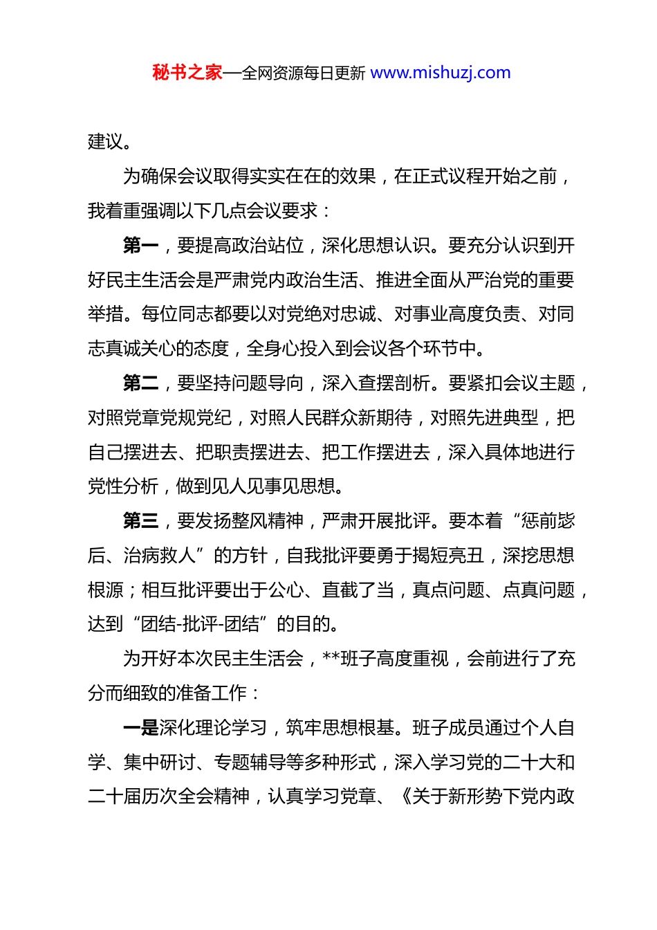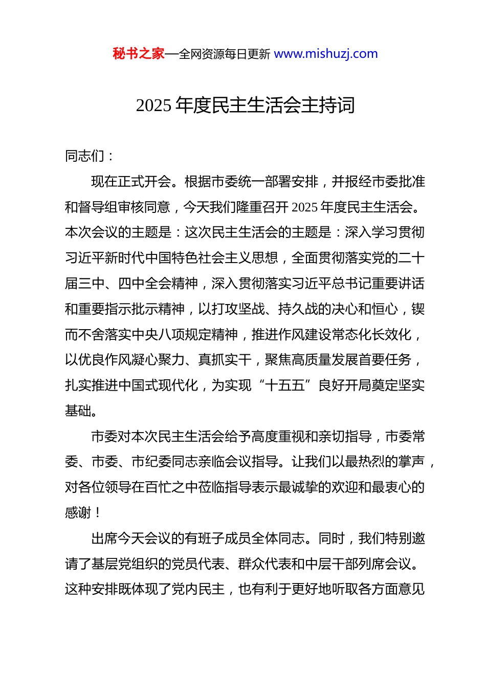 秘书之家—全网资源每日更新 www.mishuzj.com2025 年度民主生活会主持词 同志们:现在正式开会。根据市委统一部署安排,并报经市委批准和督导组审核同意,今天我们隆重召开 2025 年度民主生活会。本次会议的主题是:这次民主生活会的主题是:深入学习贯彻习近平新时代中国特色社会主义思想,全面贯彻落实党的二十届三中、四中全会精神,深入贯彻落实习近平总书记重要讲话和重要指示批示精神,以打攻坚战、持久战的决心和恒心,锲而不舍落实中央八项规定精神,推进作风建设常态化长效化,以优良作风凝心聚力、真抓实干,聚焦高质量发展首要任务,扎实推进中国式现代化,为实现“十五五”良好开局奠定坚实基础。市委对本次民主生活会给予高度重视和亲切指导,市委常委、市委、市纪委同志亲临会议指导。让我们以最热烈的掌声,对各位领导在百忙之中莅临指导表示最诚挚的欢迎和最衷心的感谢!出席今天会议的有班子成员全体同志。同时,我们特别邀请了基层党组织的党员代表、群众代表和中层干部列席会议。这种安排既体现了党内民主,也有利于更好地听取各方面意见秘书之家—全网资源每日更新 www.mishuzj.com建议。为确保会议取得实实在在的效果,在正式议程开始之前,我着重强调以下几点会议要求:第一,要提高政治站位,深化思想认识。要充分认识到开好民主生活会是严肃党内政治生活、推进全面从严治党的重要举措。每位同志都要以对党绝对忠诚、对事业高度负责、对同志真诚关心的态度,全身心投入到会议各个环节中。第二,要坚持问题导向,深入查摆剖析。要紧扣会议主题,对照党章党规党纪,对照人民群众新期待,对照先进典型,把自己摆进去、把职责摆进去、把工作摆进去,深入具体地进行党性分析,做到见人见事见思想。第三,要发扬整风精神,严肃开展批评。要本着“惩前毖后、治病救人”的方针,自我批评要勇于揭短亮丑,深挖思想根源;相互批评要出于公心、直截了当,真点问题、点真问题,达到“团结-批评-团结”的目的。为开好本次民主生活会,**班子高度重视,会前进行了充分而细致的准备工作:一是深化理论学习,筑牢思想根基。班子成员通过个人自学、集中研讨、专题辅导等多种形式,深入学习党的二十大和二十届历次全会精神,认真学习党章、《关于新形势下党内政秘书之家—全网资源每日更新 www.mishuzj.com治生活的若干准则》等党内法规,重点研读习近平总书记在中央政治局民主生活会上的重要讲话精神、习近平总书记在二十届中纪委五次全会重要讲话精神以及关于全面从严治党、加强作风建设的重要论述。通过学习,进一步深化了认识、统一了思想,为开好民主生活会奠定了坚实的思想基础。二是广泛征求意见,倾听群众呼声。我们坚持开门搞活动,通过发放征求意见函、设置意见箱、召开座谈会、个别访谈、新媒体平台留言等多种渠道,广泛征求了各乡镇(街道)、市直各部门、部分“两代表一委员”、离退休老同志、基层党员干部和群众代表的意见建议。征集到原始意见建议,经梳理归纳,形成对班子的意见建议,对班子成员的个人意见建议。所有意见建议均已原汁原味反馈给班子和每位成员。三是深入谈心谈话,增进思想交流。严格落实“四必谈”要求,我与班子成员之间、班子成员相互之间、班子成员与分管单位主要负责同志、与本人组织关系所在党支部党员代表都开展了面对面、一对一的谈心谈话。大家敞开心扉、交流思想,既谈了工作也谈了思想,既肯定了成绩也指出了不足,增进了理解,消除了隔阂,凝聚了共识。四是认真撰写材料,深刻对照检查。在深入学习、广泛征求意见、深入谈心谈话的基础上,我主持起草了班子对照检查秘书之家—全网资源每日更新 www.mishuzj.com材料,班子成员都认真撰写了个人发言提纲。大家紧扣主题,重点围绕五个带头方面,深入查找突出问题,深刻剖析问题根源,明确了努力方向和整改措施。本次会议共有五项议程:第一项,由我通报班子上一年度民主生活会整改措施落实情况和本次民主生活会征求意见情况;第二项,由我代表班子作对照检查;第三项,班子成员逐一进行个人对照检查,并相互开展批评;第四项,请市委督导组领导讲话;第五项,由我代表班子作...