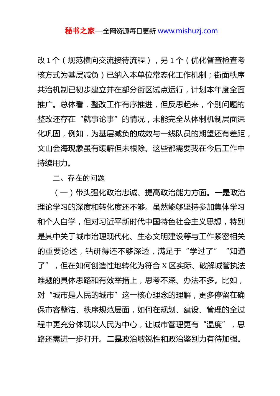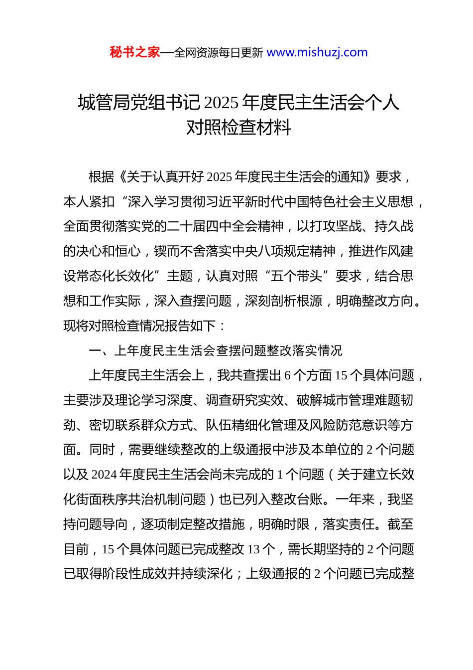 秘书之家—全网资源每日更新 www.mishuzj.com城管局党组书记 2025 年度民主生活会个人对照检查材料 根据《关于认真开好 2025 年度民主生活会的通知》要求,本人紧扣“深入学习贯彻习近平新时代中国特色社会主义思想,全面贯彻落实党的二十届四中全会精神,以打攻坚战、持久战的决心和恒心,锲而不舍落实中央八项规定精神,推进作风建设常态化长效化”主题,认真对照“五个带头”要求,结合思想和工作实际,深入查摆问题,深刻剖析根源,明确整改方向。现将对照检查情况报告如下:一、上年度民主生活会查摆问题整改落实情况上年度民主生活会上,我共查摆出 6 个方面 15 个具体问题,主要涉及理论学习深度、调查研究实效、破解城市管理难题韧劲、密切联系群众方式、队伍精细化管理及风险防范意识等方面。同时,需要继续整改的上级通报中涉及本单位的 2 个问题以及 2024 年度民主生活会尚未完成的 1 个问题(关于建立长效化街面秩序共治机制问题)也已列入整改台账。一年来,我坚持问题导向,逐项制定整改措施,明确时限,落实责任。截至目前,15 个具体问题已完成整改 13 个,需长期坚持的 2 个问题已取得阶段性成效并持续深化;上级通报的 2 个问题已完成整秘书之家—全网资源每日更新 www.mishuzj.com改 1 个(规范横向交流接待流程),另 1 个(优化督查检查考核方式为基层减负)已纳入本单位常态化工作机制;街面秩序共治机制已初步建立并在部分街区试点运行,计划本年度全面推广。总体看,整改工作有序推进,但反思起来,个别问题的整改还存在“就事论事”的情况,未能完全从体制机制层面深化巩固,例如,为基层减负的成效与一线队员的期望还有差距,文山会海现象虽有缓解但未根除。这些都需要我在今后工作中持续用力。二、存在的问题(一)带头强化政治忠诚、提高政治能力方面。一是政治理论学习的深度和转化度还不够。虽然能够坚持参加集体学习和个人自学,但对习近平新时代中国特色社会主义思想,特别是其中关于城市治理现代化、生态文明建设等与工作紧密相关的重要论述,钻研得还不够深透,满足于“学过了”“知道了”,但在如何创造性地转化为符合 X 区实际、破解城管执法难题的具体思路和有效举措上,思考不深、办法不多。比如,对“城市是人民的城市”这一核心理念的理解,更多停留在确保市容整洁、秩序规范层面,如何在规划、建设、管理的全过程中更充分体现以人民为中心,让城市管理更有“温度”,思路还需进一步打开。二是政治敏锐性和政治鉴别力有待加强。秘书之家—全网资源每日更新 www.mishuzj.com对社会上一些错误思潮、网络谣言虽然能做到不信不传,但缺乏主动亮剑、坚决斗争的自觉性和锐气。在复杂敏感的执法场景中,有时过于考虑执法流程的规范性,对事件背后可能存在的政治风险考量不足,从政治高度观察、分析和处理复杂城市管理问题的能力还需提升。比如,在处理涉及民族、宗教等特殊群体的占道经营问题时,有时过于谨慎,担心引发负面舆情,未能很好地将严格执法与维护民族团结、社会稳定有机结合。三是贯彻执行上级决策部署的创造性有待增强。对中央、省委、市委和区委的决策部署能够做到不折不扣执行,但在结合 X 区地域特点、发展阶段和群众需求进行“本土化”落实上,有时存在“上下一般粗”现象。比如,在落实上级关于优化营商环境、支持“地摊经济”发展要求时,前期对如何划定区域、如何规范管理、如何平衡市容与繁荣关系等研究不够透彻,导致一度出现“一管就死、一放就乱”的被动局面,反映出在把握政策“时度效”上还需下更大功夫。(二)带头固本培元、增强党性方面。一是党性锻炼的主动性自觉性有所减弱。随着职务提升和工作繁忙,有时不自觉地放松了对主观世界的持续改造,以事务工作代替党性锤炼。参加组织生活有时存在“例行公事”想法,批评和自我批评的“辣味”不足,担心批评尖锐了影响班子团结,对自身存在的秘书之家—全网资源每日更新 www.mishuzj.com问题也是遮遮掩掩,未能真正做到“刀刃向内”。比如,在支部组织生活会上,自我批评多是“学习不够”“调研不深”等老生常谈的问题,对内心深处...