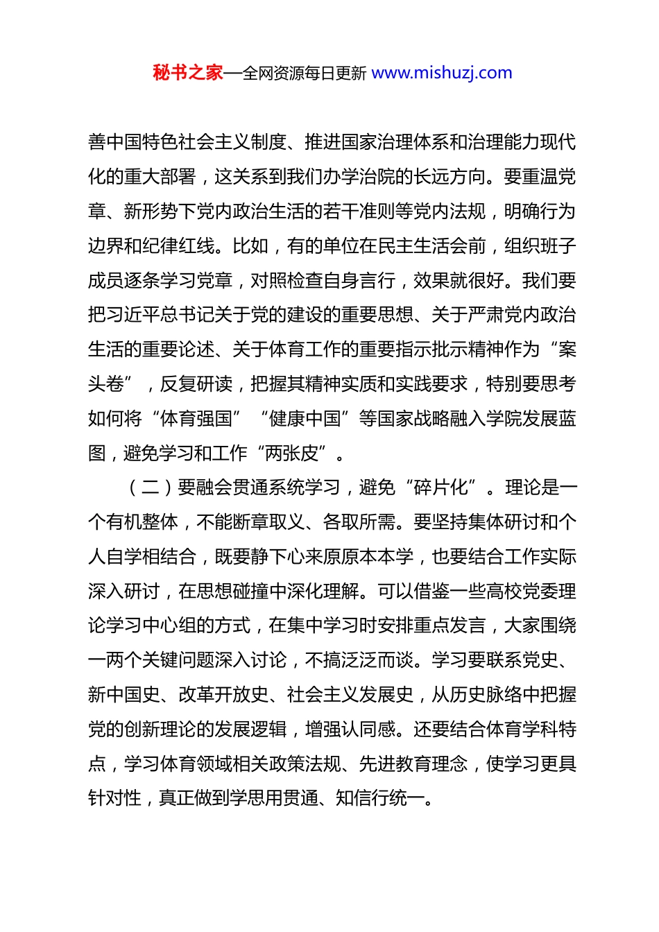 秘书之家—全网资源每日更新 www.mishuzj.com党委书记在 2025 年度民主生活会筹备会议上的讲话 同志们:今天,我们召开 X 党委 2025 年度民主生活会筹备会议,主要目的是统一思想、明确任务,为开好高质量的民主生活会打牢基础。刚才,会议已经传达了上级精神,部署了筹备工作的初步安排,大家也谈了认识,体现了很高的政治觉悟。下面,我围绕如何扎实做好筹备工作,讲四点意见。一、筑牢思想根基,把稳政治方向民主生活会是党内政治生活的重要内容,是发扬党内民主加强党内监督、依靠领导班子自身力量解决矛盾和问题的重要方式。开好民主生活会,首要的是打牢思想基础,确保方向不偏、焦点不散。这就好比盖房子,地基不牢,地动山摇;思想不统一,会议就容易流于形式。我们必须把学习贯穿筹备工作始终,让党的创新理论入脑入心,成为检视问题、剖析根源的“显微镜”和“导航仪”。(一)要深学细悟核心要义,防止“浅尝辄止”。学习不能浮在表面,满足于读过了、学过了,而要钻进去、悟透彻。要重点学习党的二十届四中全会精神,深刻领会关于坚持和完秘书之家—全网资源每日更新 www.mishuzj.com善中国特色社会主义制度、推进国家治理体系和治理能力现代化的重大部署,这关系到我们办学治院的长远方向。要重温党章、新形势下党内政治生活的若干准则等党内法规,明确行为边界和纪律红线。比如,有的单位在民主生活会前,组织班子成员逐条学习党章,对照检查自身言行,效果就很好。我们要把习近平总书记关于党的建设的重要思想、关于严肃党内政治生活的重要论述、关于体育工作的重要指示批示精神作为“案头卷”,反复研读,把握其精神实质和实践要求,特别要思考如何将“体育强国”“健康中国”等国家战略融入学院发展蓝图,避免学习和工作“两张皮”。(二)要融会贯通系统学习,避免“碎片化”。理论是一个有机整体,不能断章取义、各取所需。要坚持集体研讨和个人自学相结合,既要静下心来原原本本学,也要结合工作实际深入研讨,在思想碰撞中深化理解。可以借鉴一些高校党委理论学习中心组的方式,在集中学习时安排重点发言,大家围绕一两个关键问题深入讨论,不搞泛泛而谈。学习要联系党史、新中国史、改革开放史、社会主义发展史,从历史脉络中把握党的创新理论的发展逻辑,增强认同感。还要结合体育学科特点,学习体育领域相关政策法规、先进教育理念,使学习更具针对性,真正做到学思用贯通、知信行统一。秘书之家—全网资源每日更新 www.mishuzj.com(三)要带着问题靶向学习,切忌“空对空”。学习的目的全在于应用。要带着筹备民主生活会上需要查摆的问题去学,增强学习的针对性。比如,针对学院在“十四五”规划执行中遇到的瓶颈问题,就要重点学习新发展理念、高质量发展等相关论述;针对师生反映强烈的作风问题,就要深入学习中央八项规定及其实施细则精神,学习警示教育案例。像有的高校在主题教育中,针对科研经费管理问题,专门组织学习相关制度规定,为深入剖析奠定了基础。我们要把学习的过程变成发现问题、思考问题、解决问题的过程,为下一步对照检查提供理论武器和思想指引。二、广开言路纳谏,凝聚集体智慧民主生活会开得好不好,关键看问题找得准不准。而问题往往隐藏在基层、存在于群众中。如果征求意见搞“体内循环”、闭门造车,听到的只能是“过滤”后的声音,甚至是一片赞扬。我们必须放下身段,敞开大门,真心实意听取各方面意见,把群众的“心声”作为检验我们工作的“镜子”。这就像医生看病,只有望闻问切,全面了解病情,才能对症下药。(一)要拓宽渠道“全方位”听,不搞“选择性”收听。征求意见不能仅限于发个通知、开个座谈会了事,要创新方式方法,线上线下结合。要深入教研室、训练场、学生班级、宿秘书之家—全网资源每日更新 www.mishuzj.com舍一线,通过个别访谈、设置意见箱、发放征求意见表、召开座谈会、开通网络信箱等多种形式,“面对面”与“背靠背”相结合,既听取党员干部的意见,也广泛收集普通教师、学生代表,特别是教学科研骨干、优秀运动员、困难职工等群体的心声。可以学习一些地方的做法,开展“第三方”调...