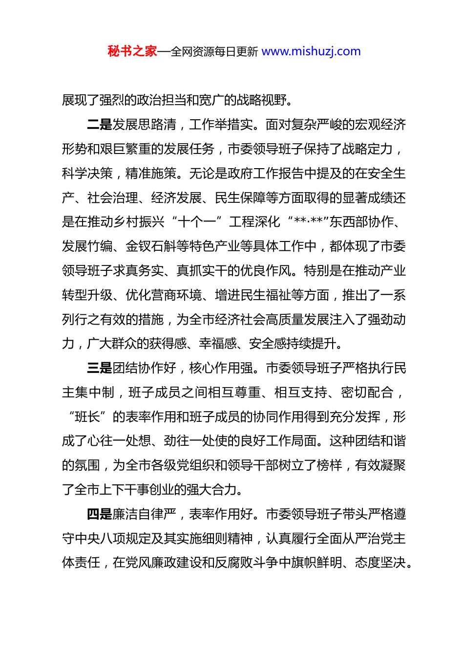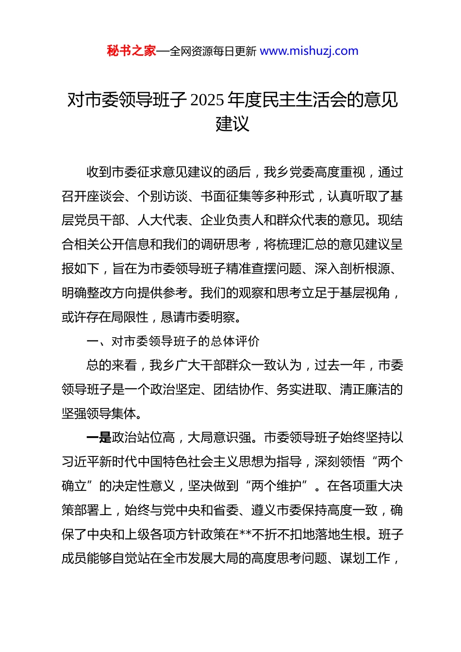 秘书之家—全网资源每日更新 www.mishuzj.com对市委领导班子 2025 年度民主生活会的意见建议 收到市委征求意见建议的函后,我乡党委高度重视,通过召开座谈会、个别访谈、书面征集等多种形式,认真听取了基层党员干部、人大代表、企业负责人和群众代表的意见。现结合相关公开信息和我们的调研思考,将梳理汇总的意见建议呈报如下,旨在为市委领导班子精准查摆问题、深入剖析根源、明确整改方向提供参考。我们的观察和思考立足于基层视角,或许存在局限性,恳请市委明察。一、对市委领导班子的总体评价总的来看,我乡广大干部群众一致认为,过去一年,市委领导班子是一个政治坚定、团结协作、务实进取、清正廉洁的坚强领导集体。一是政治站位高,大局意识强。市委领导班子始终坚持以习近平新时代中国特色社会主义思想为指导,深刻领悟“两个确立”的决定性意义,坚决做到“两个维护”。在各项重大决策部署上,始终与党中央和省委、遵义市委保持高度一致,确保了中央和上级各项方针政策在**不折不扣地落地生根。班子成员能够自觉站在全市发展大局的高度思考问题、谋划工作,秘书之家—全网资源每日更新 www.mishuzj.com展现了强烈的政治担当和宽广的战略视野。二是发展思路清,工作举措实。面对复杂严峻的宏观经济形势和艰巨繁重的发展任务,市委领导班子保持了战略定力,科学决策,精准施策。无论是政府工作报告中提及的在安全生产、社会治理、经济发展、民生保障等方面取得的显著成绩还是在推动乡村振兴“十个一”工程深化“**·**”东西部协作、发展竹编、金钗石斛等特色产业等具体工作中,都体现了市委领导班子求真务实、真抓实干的优良作风。特别是在推动产业转型升级、优化营商环境、增进民生福祉等方面,推出了一系列行之有效的措施,为全市经济社会高质量发展注入了强劲动力,广大群众的获得感、幸福感、安全感持续提升。三是团结协作好,核心作用强。市委领导班子严格执行民主集中制,班子成员之间相互尊重、相互支持、密切配合,“班长”的表率作用和班子成员的协同作用得到充分发挥,形成了心往一处想、劲往一处使的良好工作局面。这种团结和谐的氛围,为全市各级党组织和领导干部树立了榜样,有效凝聚了全市上下干事创业的强大合力。四是廉洁自律严,表率作用好。市委领导班子带头严格遵守中央八项规定及其实施细则精神,认真履行全面从严治党主体责任,在党风廉政建设和反腐败斗争中旗帜鲜明、态度坚决。秘书之家—全网资源每日更新 www.mishuzj.com班子成员以身作则,率先垂范,展现了共产党人清正廉洁的政治本色,在全市营造了风清气正的良好政治生态。总体而言,市委领导班子是一个让党放心、让人民满意的领导集体。全市经济社会的平稳健康发展和各项事业的不断进步,是市委坚强领导、科学决策的结果。二、带头强化政治忠诚、提高政治能力方面的建议市委领导班子始终将政治建设摆在首位,旗帜鲜明讲政治在筑牢政治忠诚、提升政治能力方面为全市党员干部作出了表率。尽管如此,对照新时代新征程对领导干部政治能力提出的更高要求,我们基层干部群众本着“知无不言、言无不尽”的态度,认为在以下方面或许还存在提升空间,意见建议:1.建议深化“课题式”调研学习。围绕**高质量发展中的重点难点问题,如“竹产业的现代化升级”、“康养旅游与乡村振兴的深度融合”、“如何有效增加城乡居民收入”等,由市委领导班子成员牵头,组建专题研究小组,带着课题深入学习党的创新理论,深入基层一线解剖麻雀,最终形成高质量的调研报告和政策建议。这既能推动理论学习往深里走、往实里走,又能直接服务于科学决策,实现学思用贯通、知信行统一。2.建议建立健全风险研判与应对机制。定期组织召开政治安全和经济社会发展风险研判会,邀请相关领域的专家学者、秘书之家—全网资源每日更新 www.mishuzj.com经验丰富的基层干部、企业家代表等共同参与,对全市在政治、经济、社会、生态等领域可能面临的风险进行系统性评估和预判。通过“头脑风暴”和“压力测试”,不断提升领导班子见微知著、驾驭复杂局面的能力,确保在关键时刻站得稳、看得远、辨得清。3.建议加强对下级“...