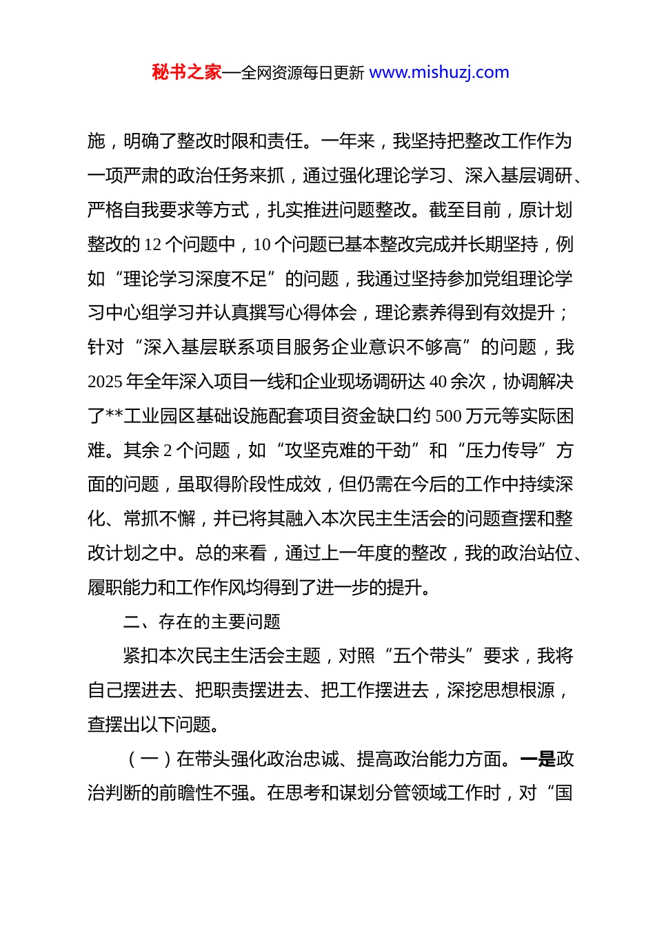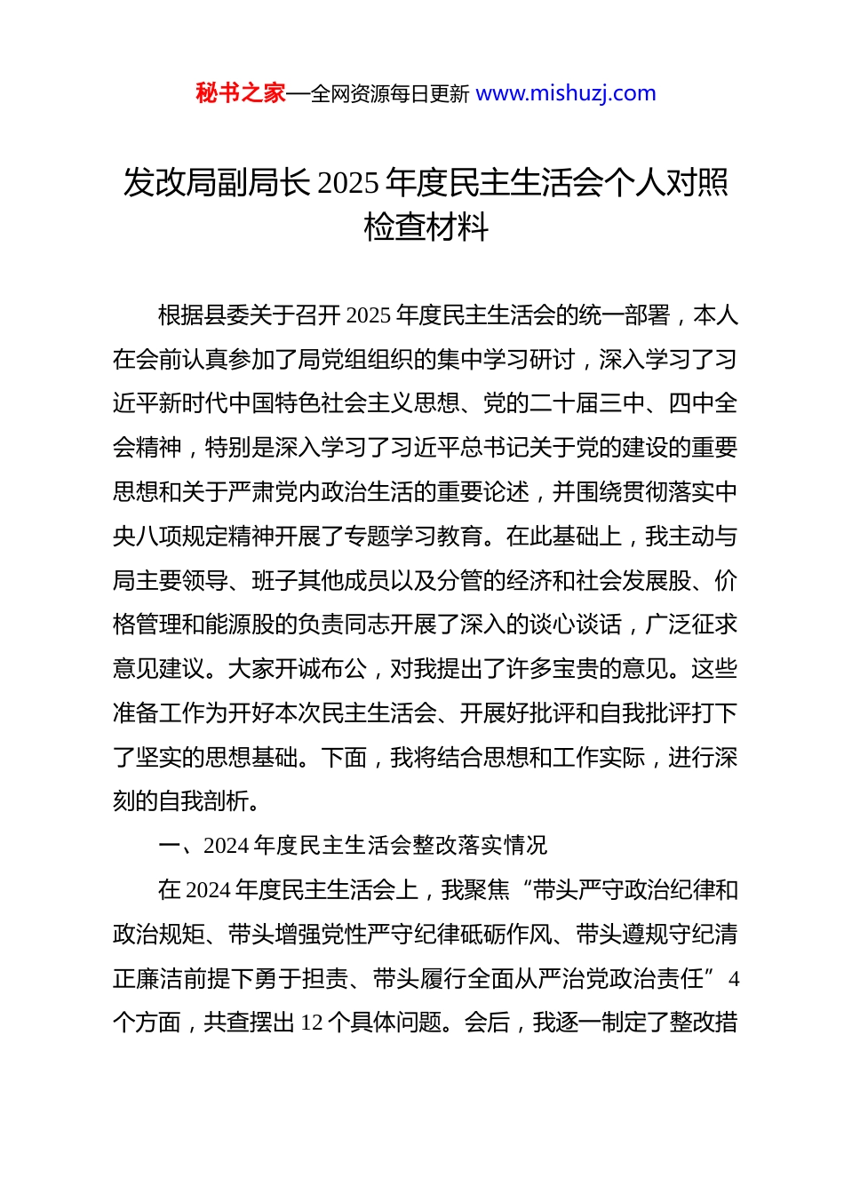 秘书之家—全网资源每日更新 www.mishuzj.com发改局副局长 2025 年度民主生活会个人对照检查材料 根据县委关于召开 2025 年度民主生活会的统一部署,本人在会前认真参加了局党组组织的集中学习研讨,深入学习了习近平新时代中国特色社会主义思想、党的二十届三中、四中全会精神,特别是深入学习了习近平总书记关于党的建设的重要思想和关于严肃党内政治生活的重要论述,并围绕贯彻落实中央八项规定精神开展了专题学习教育。在此基础上,我主动与局主要领导、班子其他成员以及分管的经济和社会发展股、价格管理和能源股的负责同志开展了深入的谈心谈话,广泛征求意见建议。大家开诚布公,对我提出了许多宝贵的意见。这些准备工作为开好本次民主生活会、开展好批评和自我批评打下了坚实的思想基础。下面,我将结合思想和工作实际,进行深刻的自我剖析。一、2024 年度民主生活会整改落实情况在 2024 年度民主生活会上,我聚焦“带头严守政治纪律和政治规矩、带头增强党性严守纪律砥砺作风、带头遵规守纪清正廉洁前提下勇于担责、带头履行全面从严治党政治责任”4个方面,共查摆出 12 个具体问题。会后,我逐一制定了整改措秘书之家—全网资源每日更新 www.mishuzj.com施,明确了整改时限和责任。一年来,我坚持把整改工作作为一项严肃的政治任务来抓,通过强化理论学习、深入基层调研、严格自我要求等方式,扎实推进问题整改。截至目前,原计划整改的 12 个问题中,10 个问题已基本整改完成并长期坚持,例如“理论学习深度不足”的问题,我通过坚持参加党组理论学习中心组学习并认真撰写心得体会,理论素养得到有效提升;针对“深入基层联系项目服务企业意识不够高”的问题,我2025 年全年深入项目一线和企业现场调研达 40 余次,协调解决了**工业园区基础设施配套项目资金缺口约 500 万元等实际困难。其余 2 个问题,如“攻坚克难的干劲”和“压力传导”方面的问题,虽取得阶段性成效,但仍需在今后的工作中持续深化、常抓不懈,并已将其融入本次民主生活会的问题查摆和整改计划之中。总的来看,通过上一年度的整改,我的政治站位、履职能力和工作作风均得到了进一步的提升。二、存在的主要问题紧扣本次民主生活会主题,对照“五个带头”要求,我将自己摆进去、把职责摆进去、把工作摆进去,深挖思想根源,查摆出以下问题。(一)在带头强化政治忠诚、提高政治能力方面。一是政治判断的前瞻性不强。在思考和谋划分管领域工作时,对“国秘书之家—全网资源每日更新 www.mishuzj.com之大者”的领会和把握不够精准,未能完全跳出“就发改看发改”的局限。在 2025 年初参与编制全县国民经济和社会发展年度计划时,我分管的经济和社会发展股提交的初稿中,对固定资产投资增速、工业增加值等传统经济指标的权重考虑过多,而对单位 GDP 能耗、生态环保等体现高质量发展的约束性指标研究不深,未能充分预判国家宏观调控政策对高耗能产业的潜在影响,导致计划的部分内容与绿色发展的要求存在偏差,后经局党组会议讨论才得以修正。二是政治领悟的穿透力不深。对党中央的决策部署和省市的工作要求,存在“知其然,但不知其所以然”的情况,满足于字面学习和一般性理解,未能从政治高度上进行深层次的思考和领悟。例如,在推进能源领域“双碳”工作时,我虽然组织价格管理和能源股制定了相关方案,但在推动**镇分布式光伏整镇试点项目时,仅仅将其作为一项增加清洁能源供给的业务工作来抓,对该项目在优化区域能源结构、保障能源安全、探索共同富裕实现路径等方面的深远政治意义领悟不透,导致在协调自然资源、林业等部门解决土地、林地指标问题时,政策解释和沟通协调的力度不够,影响了项目进度。三是政治执行的彻底性不够。在贯彻落实上级决策部署时,有时存在结合实际不够、行动迟缓的问题,未能做到令行禁止、不折不扣。2025 年三季度,市里发文要求强化秘书之家—全网资源每日更新 www.mishuzj.com对重要民生商品的价格监测和调控,特别是针对可能出现的季节性价格波动要做到提前预警、提前介入。但我对此项工作的紧迫性认识不足,仅要求价格管理和能源股按常...