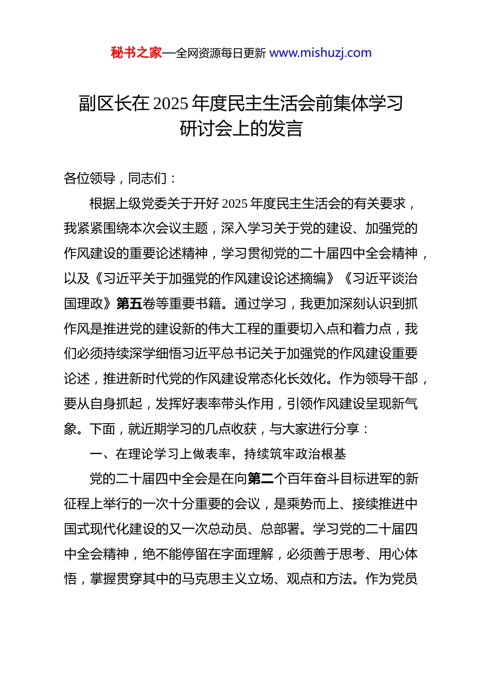 秘书之家—全网资源每日更新 www.mishuzj.com副区长在 2025 年度民主生活会前集体学习研讨会上的发言 各位领导,同志们:根据上级党委关于开好 2025 年度民主生活会的有关要求,我紧紧围绕本次会议主题,深入学习关于党的建设、加强党的作风建设的重要论述精神,学习贯彻党的二十届四中全会精神,以及《习近平关于加强党的作风建设论述摘编》《习近平谈治国理政》第五卷等重要书籍。通过学习,我更加深刻认识到抓作风是推进党的建设新的伟大工程的重要切入点和着力点,我们必须持续深学细悟习近平总书记关于加强党的作风建设重要论述,推进新时代党的作风建设常态化长效化。作为领导干部,要从自身抓起,发挥好表率带头作用,引领作风建设呈现新气象。下面,就近期学习的几点收获,与大家进行分享:一、在理论学习上做表率,持续筑牢政治根基党的二十届四中全会是在向第二个百年奋斗目标进军的新征程上举行的一次十分重要的会议,是乘势而上、接续推进中国式现代化建设的又一次总动员、总部署。学习党的二十届四中全会精神,绝不能停留在字面理解,必须善于思考、用心体悟,掌握贯穿其中的马克思主义立场、观点和方法。作为党员秘书之家—全网资源每日更新 www.mishuzj.com领导干部,要把学习宣传贯彻党的二十届四中全会精神作为重要政治任务,深刻理解全会精神的核心要义和实践要求,增强“四个意识”、坚定“四个自信”、做到“两个维护”,确保工作始终沿着正确的政治方向前进。(一)坚守政治立场,把准工作方向。习近平总书记指出,“理想信念是立党兴党之基,也是党员干部安身立命之本。”理想信念坚定是党员干部的第一标准,没有理想信念,理想信念不坚定,精神就会“缺钙”,就会得“软骨病”。作为领导干部,要坚持不懈用习近平新时代中国特色社会主义思想凝心铸魂,通过多思多想、学深悟透,全面领会这一重要思想蕴含的科学体系、精髓要义、实践要求,在真信真用中坚定政治立场,在深学笃行中锤炼党性修养,把理论武装转化为坚定理想、锤炼品格的内在力量。自觉做到向党中央看齐,始终同以习近平同志为核心的党中央保持高度一致,把对党绝对忠诚体现在贯彻落实党中央决策部署的行动上,体现在履职尽责、做好本职工作的实效上,体现在日常言行上,以实干实绩捍卫“两个确立”、做到“两个维护”。(二)领会全会精神,明晰工作路径。习近平总书记在党的二十届四中全会上的重要讲话,深刻阐明了“十五五”规划建议的主要考虑和基本内容,明确了推动未来五年乃至更长一秘书之家—全网资源每日更新 www.mishuzj.com段时期经济社会发展的一系列方向性、根本性重大问题,为学习贯彻全会精神、以高质量发展全面推进中国式现代化提供了科学指南和根本遵循。作为领导干部,要深刻领会“十五五”时期经济社会发展的主要目标,深刻领会“十五五”时期经济社会发展的重大战略任务,深刻领会“十五五”时期经济社会发展的根本保证,准确把握全会精神的核心要义。要聚焦高质量发展首要任务,谋划好发展思路,细化工作举措,把全会作出的重大决策部署转化为本地区本部门的具体行动方案。要抓项目保障,切实履行属地责任,强化与部门联动,为项目落地保驾护航。抓城市治理,坚持和发展新时代“枫桥经验”,依托“网格化”管理,把矛盾纠纷化解在基层。抓公共服务,在服务群众上要始终坚持高标准严要求,持续优化营商环境。(三)站稳人民立场,树牢正确政绩观。习近平总书记强调,“江山就是人民,人民就是江山”。要时刻警惕思想滑坡风险,始终践行以人民为中心的发展思想,经常对照党的理论、党章党规、初心使命和群众期待检视差距,永葆共产党人政治本色。严格落实并不断完善“四下基层”制度,增加“不发通知、不打招呼、不听汇报、不用陪同接待”的“四不两直”式调研比重,真正沉下身子、迈开步子,走进田间地头、深入街头巷尾,倾听群众最真实的声音,掌握第一手的资料。聚焦人秘书之家—全网资源每日更新 www.mishuzj.com民群众在民主、法治、公平、正义、安全、环境等方面的新要求新期待,全力推动解决一批群众反映强烈的急难愁盼问题,特别是在诉源治理、信访化解、公...