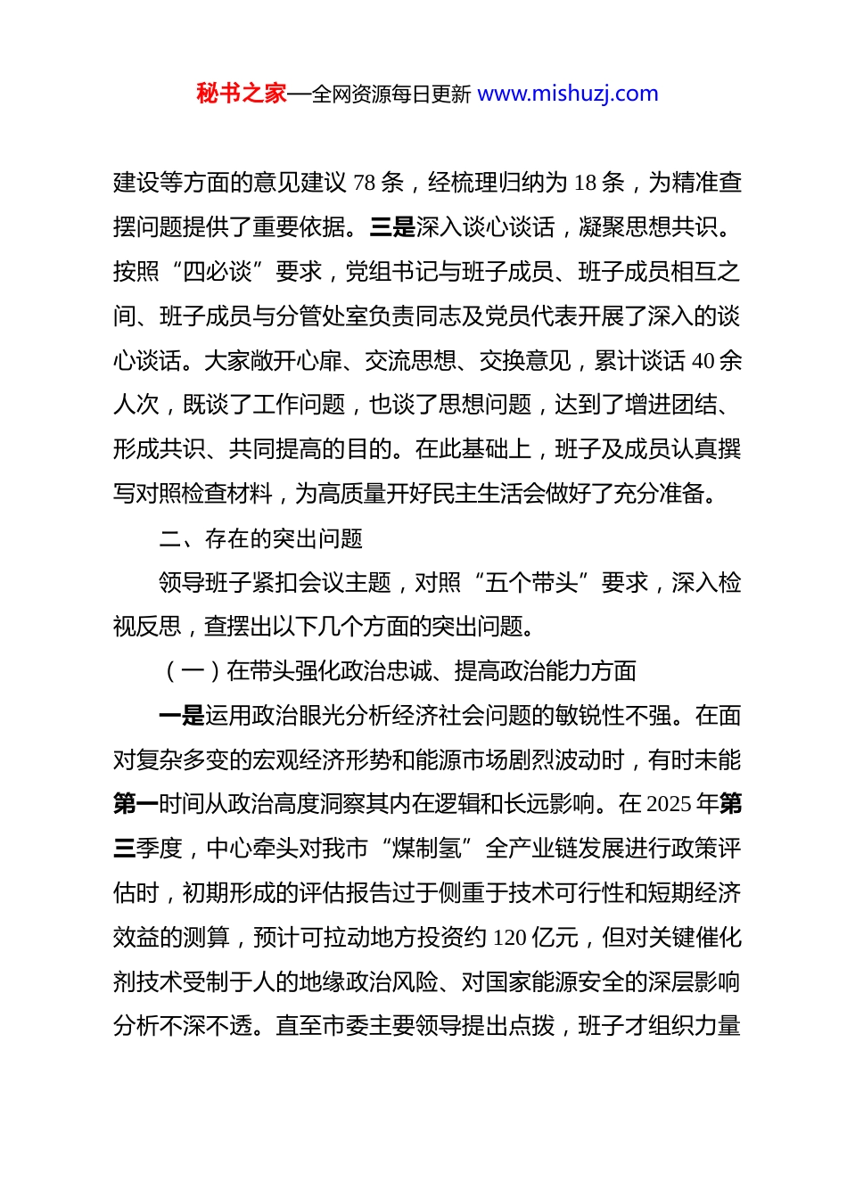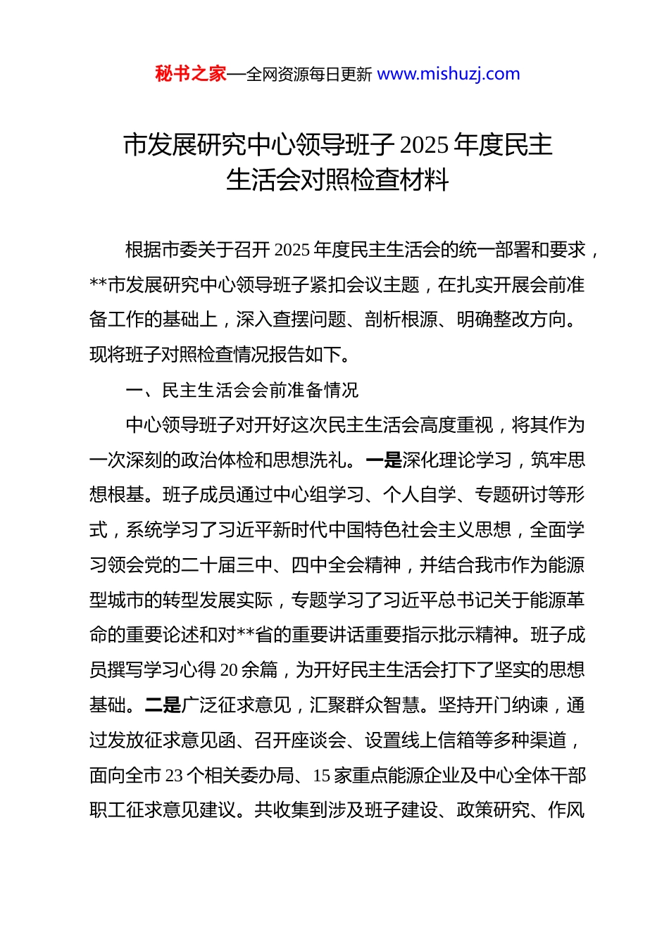 秘书之家—全网资源每日更新 www.mishuzj.com市发展研究中心领导班子 2025 年度民主生活会对照检查材料 根据市委关于召开 2025 年度民主生活会的统一部署和要求,**市发展研究中心领导班子紧扣会议主题,在扎实开展会前准备工作的基础上,深入查摆问题、剖析根源、明确整改方向。现将班子对照检查情况报告如下。一、民主生活会会前准备情况中心领导班子对开好这次民主生活会高度重视,将其作为一次深刻的政治体检和思想洗礼。一是深化理论学习,筑牢思想根基。班子成员通过中心组学习、个人自学、专题研讨等形式,系统学习了习近平新时代中国特色社会主义思想,全面学习领会党的二十届三中、四中全会精神,并结合我市作为能源型城市的转型发展实际,专题学习了习近平总书记关于能源革命的重要论述和对**省的重要讲话重要指示批示精神。班子成员撰写学习心得 20 余篇,为开好民主生活会打下了坚实的思想基础。二是广泛征求意见,汇聚群众智慧。坚持开门纳谏,通过发放征求意见函、召开座谈会、设置线上信箱等多种渠道,面向全市 23 个相关委办局、15 家重点能源企业及中心全体干部职工征求意见建议。共收集到涉及班子建设、政策研究、作风秘书之家—全网资源每日更新 www.mishuzj.com建设等方面的意见建议 78 条,经梳理归纳为 18 条,为精准查摆问题提供了重要依据。三是深入谈心谈话,凝聚思想共识。按照“四必谈”要求,党组书记与班子成员、班子成员相互之间、班子成员与分管处室负责同志及党员代表开展了深入的谈心谈话。大家敞开心扉、交流思想、交换意见,累计谈话 40 余人次,既谈了工作问题,也谈了思想问题,达到了增进团结、形成共识、共同提高的目的。在此基础上,班子及成员认真撰写对照检查材料,为高质量开好民主生活会做好了充分准备。二、存在的突出问题领导班子紧扣会议主题,对照“五个带头”要求,深入检视反思,查摆出以下几个方面的突出问题。(一)在带头强化政治忠诚、提高政治能力方面一是运用政治眼光分析经济社会问题的敏锐性不强。在面对复杂多变的宏观经济形势和能源市场剧烈波动时,有时未能第一时间从政治高度洞察其内在逻辑和长远影响。在 2025 年第三季度,中心牵头对我市“煤制氢”全产业链发展进行政策评估时,初期形成的评估报告过于侧重于技术可行性和短期经济效益的测算,预计可拉动地方投资约 120 亿元,但对关键催化剂技术受制于人的地缘政治风险、对国家能源安全的深层影响分析不深不透。直至市委主要领导提出点拨,班子才组织力量秘书之家—全网资源每日更新 www.mishuzj.com重构报告框架,补充了“战略安全”专章,体现了政治判断力的欠缺。二是将中央大政方针转化为地方具体实践的创造性不够。对党中央的决策部署,班子在思想上和行动上是坚决拥护的,但在结合我市实际、创造性地推动政策落地方面,前瞻性、主动性不足。例如,党的二十大报告和 2024 年底的中央经济工作会议均强调要“加快规划建设新型能源体系”,但中心在谋划 2025 年度重点研究课题时,反应不够迅速,直到 2025 年 3月才正式启动“**市传统能源产业数字化转型路径研究”重大课题,相较于其他兄弟地市,在为市委市政府提供“十五五”能源规划前期思路方面,晚了近一个季度,错失了政策研究的最佳“窗口期”。三是胸怀“国之大者”谋划发展蓝图的格局不高。在开展政策研究和决策咨询时,有时站位局限于本市“一亩三分地”,未能完全将**市的发展置于全国、全省发展大局中去考量。在 2025 年参与论证晋北采煤沉陷区新能源基地二期项目用地规划时,两名班子成员带队形成的初步咨询意见,主要篇幅集中在项目投资回报率、发电效率等技术经济指标上,而对项目如何与国家粮食安全战略、生态保护红线刚性约束相协调着墨不多,缺乏对“国之大者”的全面把握,导致该咨询意见在提交市政府前进行了重大修改。(二)在带头固本培元、增强党性方面秘书之家—全网资源每日更新 www.mishuzj.com一是理论学习往深里走、往实里走、往心里走不扎实。存在“为了学习而学习”的倾向,满足于完成“规定动作”,但在学懂弄通做实上下的功夫不深,理论学习...