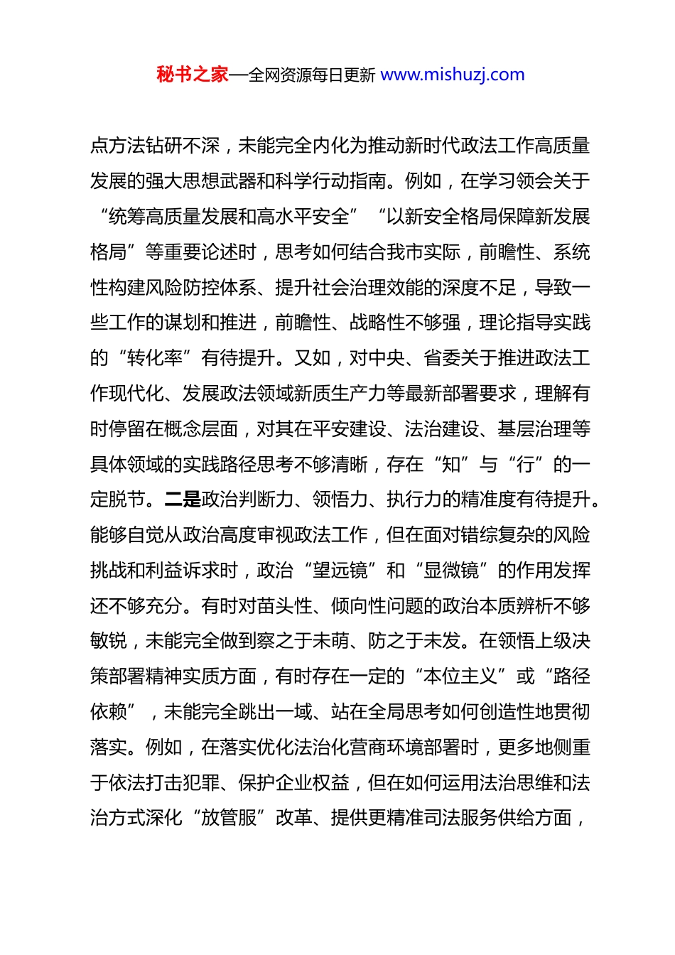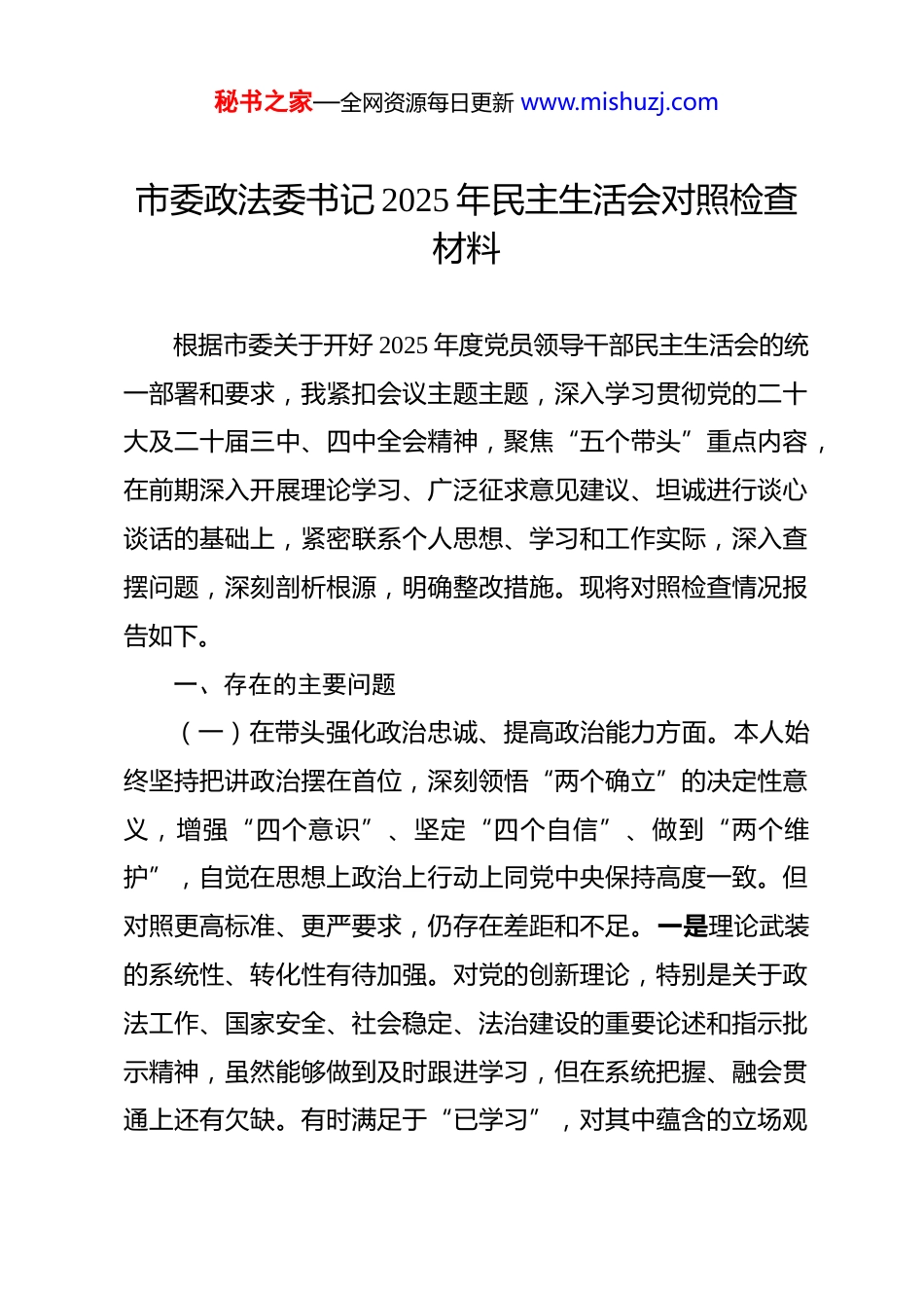 秘书之家—全网资源每日更新 www.mishuzj.com市委政法委书记 2025 年民主生活会对照检查材料 根据市委关于开好 2025 年度党员领导干部民主生活会的统一部署和要求,我紧扣会议主题主题,深入学习贯彻党的二十大及二十届三中、四中全会精神,聚焦“五个带头”重点内容,在前期深入开展理论学习、广泛征求意见建议、坦诚进行谈心谈话的基础上,紧密联系个人思想、学习和工作实际,深入查摆问题,深刻剖析根源,明确整改措施。现将对照检查情况报告如下。一、存在的主要问题(一)在带头强化政治忠诚、提高政治能力方面。本人始终坚持把讲政治摆在首位,深刻领悟“两个确立”的决定性意义,增强“四个意识”、坚定“四个自信”、做到“两个维护”,自觉在思想上政治上行动上同党中央保持高度一致。但对照更高标准、更严要求,仍存在差距和不足。一是理论武装的系统性、转化性有待加强。对党的创新理论,特别是关于政法工作、国家安全、社会稳定、法治建设的重要论述和指示批示精神,虽然能够做到及时跟进学习,但在系统把握、融会贯通上还有欠缺。有时满足于“已学习”,对其中蕴含的立场观秘书之家—全网资源每日更新 www.mishuzj.com点方法钻研不深,未能完全内化为推动新时代政法工作高质量发展的强大思想武器和科学行动指南。例如,在学习领会关于“统筹高质量发展和高水平安全”“以新安全格局保障新发展格局”等重要论述时,思考如何结合我市实际,前瞻性、系统性构建风险防控体系、提升社会治理效能的深度不足,导致一些工作的谋划和推进,前瞻性、战略性不够强,理论指导实践的“转化率”有待提升。又如,对中央、省委关于推进政法工作现代化、发展政法领域新质生产力等最新部署要求,理解有时停留在概念层面,对其在平安建设、法治建设、基层治理等具体领域的实践路径思考不够清晰,存在“知”与“行”的一定脱节。二是政治判断力、领悟力、执行力的精准度有待提升。能够自觉从政治高度审视政法工作,但在面对错综复杂的风险挑战和利益诉求时,政治“望远镜”和“显微镜”的作用发挥还不够充分。有时对苗头性、倾向性问题的政治本质辨析不够敏锐,未能完全做到察之于未萌、防之于未发。在领悟上级决策部署精神实质方面,有时存在一定的“本位主义”或“路径依赖”,未能完全跳出一域、站在全局思考如何创造性地贯彻落实。例如,在落实优化法治化营商环境部署时,更多地侧重于依法打击犯罪、保护企业权益,但在如何运用法治思维和法治方式深化“放管服”改革、提供更精准司法服务供给方面,秘书之家—全网资源每日更新 www.mishuzj.com创新举措不多,政策红利释放不够充分。在执行层面,有时存在“中梗阻”现象,对于一些涉及多部门协调、历史遗留的复杂问题,攻坚克难的锐气和一抓到底的韧劲有所减弱,导致部分工作推进节奏偏慢、效果未达预期,政治执行力在“最后一公里”存在温差。三是政治忠诚的实践性、纯粹性有待锤炼。能够做到大是大非面前立场坚定,但在一些具体工作和细微之处,政治忠诚的“纯度”和“硬度”仍有提升空间。例如,在贯彻落实《中国共产党政法工作条例》及我省实施细则方面,虽然能够坚持重大事项请示报告制度,但在推动党对政法工作绝对领导落实到基层政法单位、覆盖到执法司法各环节的机制建设上,思考谋划不够系统,督导检查不够经常,存在压力传导层层递减的情况。面对意识形态领域的复杂斗争,特别是在网络空间,对可能影响政治安全和社会稳定的错误思潮、负面言论,虽然能做到不信不传,但主动发声亮剑、进行有力批驳和引导的意识和行动还不够及时、不够有力,政治斗争的精神和本领有待加强。(二)在带头固本培元、增强党性方面。本人能够自觉加强党性锻炼,遵守党章党规,参加党的组织生活,履行党员义务。但对照党性修养的更高要求,仍感存在薄弱环节。一是理想信念的根基扎得不够深固。随着工作阅历增长,有时不自觉秘书之家—全网资源每日更新 www.mishuzj.com地放松了主观世界的持续改造,对马克思主义基本原理和党的创新理论的信仰,在“真懂真信”上还需进一步下功夫。面对政法工作任务重、压力大、风险高的特点,有时会产生缓...