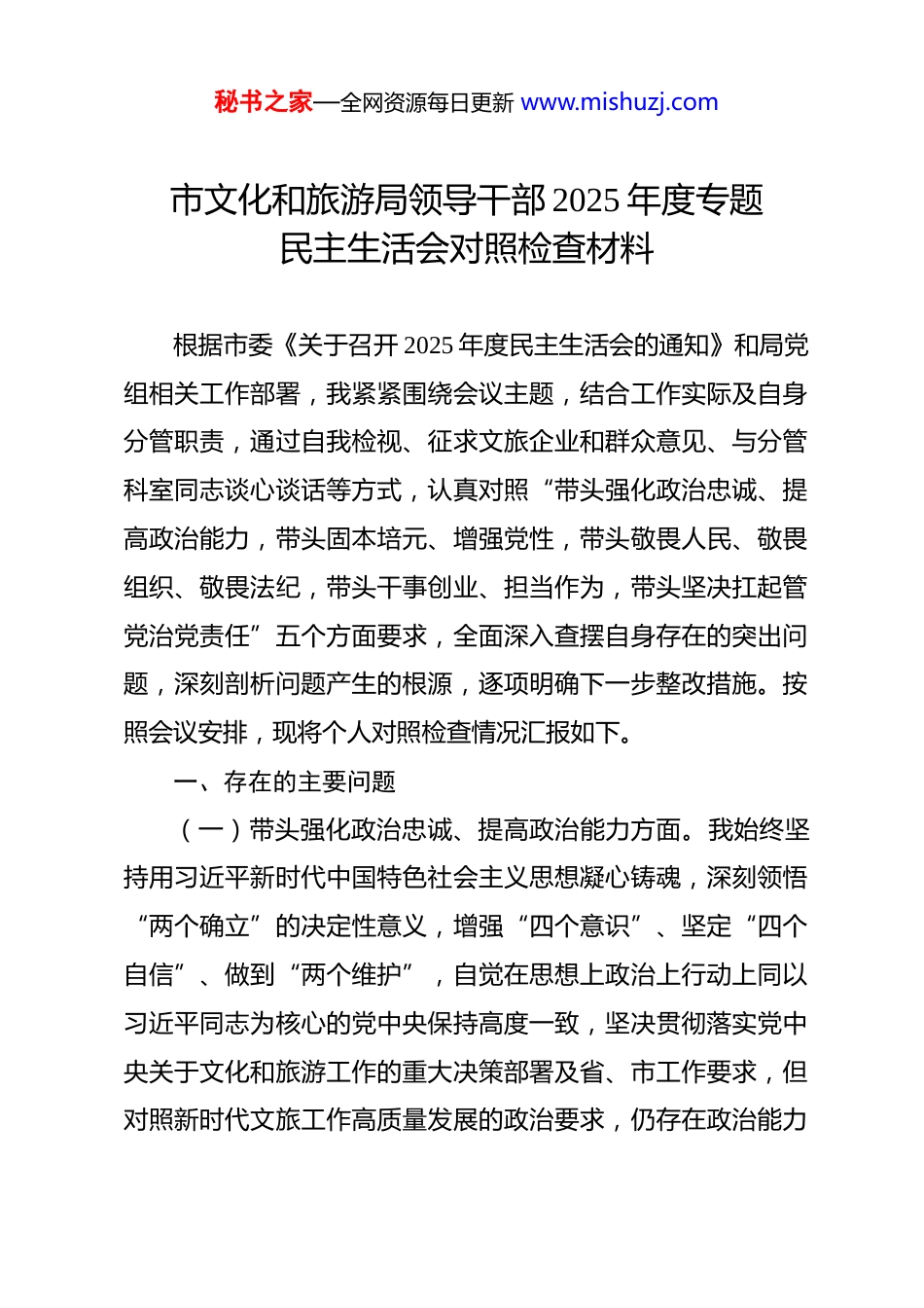秘书之家—全网资源每日更新 www.mishuzj.com市文化和旅游局领导干部 2025 年度专题民主生活会对照检查材料 根据市委《关于召开 2025 年度民主生活会的通知》和局党组相关工作部署,我紧紧围绕会议主题,结合工作实际及自身分管职责,通过自我检视、征求文旅企业和群众意见、与分管科室同志谈心谈话等方式,认真对照“带头强化政治忠诚、提高政治能力,带头固本培元、增强党性,带头敬畏人民、敬畏组织、敬畏法纪,带头干事创业、担当作为,带头坚决扛起管党治党责任”五个方面要求,全面深入查摆自身存在的突出问题,深刻剖析问题产生的根源,逐项明确下一步整改措施。按照会议安排,现将个人对照检查情况汇报如下。一、存在的主要问题(一)带头强化政治忠诚、提高政治能力方面。我始终坚持用习近平新时代中国特色社会主义思想凝心铸魂,深刻领悟“两个确立”的决定性意义,增强“四个意识”、坚定“四个自信”、做到“两个维护”,自觉在思想上政治上行动上同以习近平同志为核心的党中央保持高度一致,坚决贯彻落实党中央关于文化和旅游工作的重大决策部署及省、市工作要求,但对照新时代文旅工作高质量发展的政治要求,仍存在政治能力秘书之家—全网资源每日更新 www.mishuzj.com与职责使命不相匹配的问题。一是政治理论与文旅实践融合不够深入。对习近平总书记关于文化和旅游工作的重要论述学习不够系统全面,多停留在会议传达、文件学习的表面层面,未能深刻把握其核心要义与实践要求,在将理论学习成果转化为推动文旅融合发展的具体举措上存在差距。例如,在学习贯彻党的二十届四中全会关于“推动文化事业和文化产业繁荣发展”的部署要求时,仅满足于理解政策条文,未能结合我市文旅资源禀赋,深入思考如何将“文旅深度融合”“铸牢中华民族共同体意识”等要求融入景区打造、产品开发、活动策划全过程,导致部分文旅项目文化内涵挖掘不深,融合发展层次不高。2025 年推进的 XX 文化园升级项目中,因未能充分运用新发展理念破解文化资源整合难题,项目仍以传统观光为主,沉浸式体验、互动式消费等新业态占比不足 30%,与群众对高品质文旅产品的需求存在差距。二是政治敏锐性与意识形态把控能力不足。对文旅领域意识形态工作的极端重要性认识不够深刻,未能将意识形态工作责任制全面贯穿文旅产品审核、市场监管、活动组织等各个环节,对潜在的意识形态风险警惕性不高。例如,在审核部分景区宣传文案、文创产品设计时,过于关注商业价值和视觉效果,对其中蕴含的文化导向、价值导向把关不够严格,2025 年曾出现某景区文创产品因涉及不良文化秘书之家—全网资源每日更新 www.mishuzj.com暗示被群众投诉的情况;在监管乡村旅游点民俗活动时,对部分带有封建迷信色彩的活动发现不及时、处置不坚决,未能充分发挥文旅工作传播主流价值、弘扬优秀传统文化的作用。三是政治执行力与全局部署衔接不够顺畅。在贯彻落实上级关于文旅工作的决策部署时,存在机械执行、照搬照抄的情况,未能结合我市文旅发展实际细化实化举措,导致部分工作推进效果不佳。例如,在落实省文旅厅“关于加快推进公共文化服务体系标准化均等化建设”的要求时,仅满足于完成文化场馆建设、设施配备等硬性指标,对服务内容创新、服务质量提升等核心环节关注不够,2025 年我市乡镇综合文化站群众满意度测评中,有 3 个乡镇得分低于 85 分,反映出公共文化服务实效性不强的问题;在推进文化惠民工程时,对偏远乡村群众的文化需求调研不充分,组织的文化下乡活动存在“重场次、轻质量”的现象,全年开展的 60 余场文化下乡活动中,有 12 场因内容与群众需求不符导致参与度不高。(二)带头固本培元、增强党性方面。我始终将锤炼党性作为终身课题,自觉学习党章党规党纪,积极参加党内政治生活,但在将党性修养融入日常工作生活、转化为推动文旅工作发展的动力上仍存在不足,党性锤炼的经常性、持续性有待加强。一是党性修养锤炼不够常态化。未能将党性修养提升贯穿秘书之家—全网资源每日更新 www.mishuzj.com工作全过程,在面对文旅资源开发、项目审批、资金使用等重点工作时,偶尔会出现功...