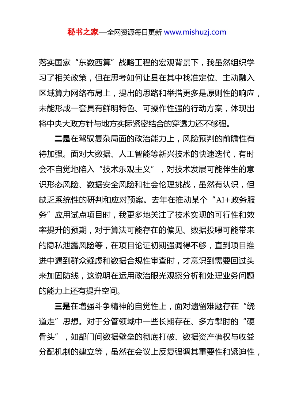 秘书之家—全网资源每日更新 www.mishuzj.com县局副局长 2025 年度民主生活会个人对照检查材料 根据县委关于召开 2025 年度民主生活会的统一部署,本人紧扣会议主题,在深入学习党的二十届三中、四中全会精神和习近平总书记系列重要讲话精神,特别是关于作风建设重要论述的基础上,通过群众提、自己找、上级点、互相帮等多种方式,广泛征求意见建议,并与班子成员深入开展谈心谈话。在此基础上,我严格对照“五个带头”要求,深入查摆自身存在的差距和不足,深刻剖析问题根源,明确了今后的努力方向和整改措施。现将个人对照检查情况报告如下。一、存在的主要问题(一)在带头强化政治忠诚、提高政治能力方面作为班子成员,我始终将政治忠诚摆在首位,但在将“两个确立”的决定性意义转化为履职尽责的实际行动中,仍存在一些需要深化和提升之处。一是在领悟上级决策部署时,有时存在“等高线”思维。习惯于将上级文件精神与我县大数据发展的现有框架进行对号入座,对于一些前瞻性、战略性的部署,如何在**县的特定环境下创造性地落地,缺乏更为深入的破题思考。例如,在贯彻秘书之家—全网资源每日更新 www.mishuzj.com落实国家“东数西算”战略工程的宏观背景下,我虽然组织学习了相关政策,但在思考如何让县在其中找准定位、主动融入区域算力网络布局上,提出的思路和举措更多是原则性的响应,未能形成一套具有鲜明特色、可操作性强的行动方案,体现出将中央大政方针与地方实际紧密结合的穿透力还不够强。二是在驾驭复杂局面的政治能力上,风险预判的前瞻性有待加强。面对大数据、人工智能等新兴技术的快速迭代,有时会不自觉地陷入“技术乐观主义”,对技术发展可能伴生的意识形态风险、数据安全风险和社会伦理挑战,虽然有认识,但缺乏系统性的研判和应对预案。去年在推动某个“AI+政务服务”应用试点项目时,我更多地关注了技术实现的可行性和效率提升的预期,对于算法可能存在的偏见、数据投喂可能带来的隐私泄露风险等,在项目论证初期强调得不够,直到项目推进中遇到群众疑虑和数据合规性审查时,才意识到需要回过头来加固防线,这说明在运用政治眼光观察分析和处理业务问题的能力上还有提升空间。三是在增强斗争精神的自觉性上,面对遗留难题存在“绕道走”思想。对于分管领域中一些长期存在、多方掣肘的“硬骨头”,如部门间数据壁垒的彻底打破、数据资产确权与收益分配机制的建立等,虽然在会议上反复强调其重要性和紧迫性,秘书之家—全网资源每日更新 www.mishuzj.com但在实际推动中,考虑到协调难度大、短期难见效,有时会不自觉地将工作重心更多地放在新建平台、开发应用等“显绩”上,对于啃“硬骨头”的韧劲和一抓到底的狠劲稍显不足,斗争的策略和艺术运用得还不够纯熟。(二)在带头固本培元、增强党性方面我深知党性修养是党员干部的立身之本,坚持参加理论学习中心组学习和个人自学,但在将理论学习成果内化为坚定党性的过程中,还存在学用结合不够紧密的问题。一是在理论学习的系统性和深入性上存在差距。对于习近平新时代中国特色社会主义思想,特别是关于网络强国、数字中国的重要论述,学习中更多地是关注与其直接相关的篇章和金句,缺乏一种“打通了学、联系着悟”的系统思维。例如,在学习党的二十届四中全会关于完善中国特色社会主义制度、推进国家治理体系和治理能力现代化的精神时,未能第一时间将其与我们正在推进的“城市大脑”建设、基层治理数字化转型等工作进行深度链接和思考,导致理论学习与业务实践在一定程度上“两张皮”,未能完全发挥出新思想指导新实践的强大威力。二是在践行党内政治生活的严肃性上有所松懈。作为班子成员,在参加组织生活时,有时满足于完成“规定动作”,在秘书之家—全网资源每日更新 www.mishuzj.com开展批评与自我批评时,虽然能够坦诚相见,但有时顾及情面,提出的批评意见“辣味”不足,多是点到为止的善意提醒,未能真正达到“红脸出汗、排毒治病”的效果。尤其是在一些技术研讨和项目评审会上,面对不同意见,我有时会为了维护团队和谐与项目进度,对一些不尽合理的方案或思路,没有旗帜鲜明地从党...