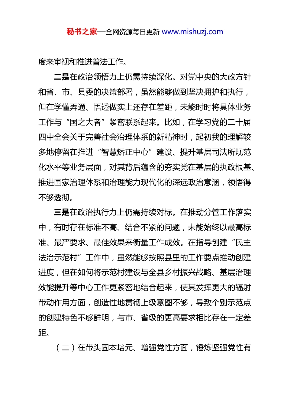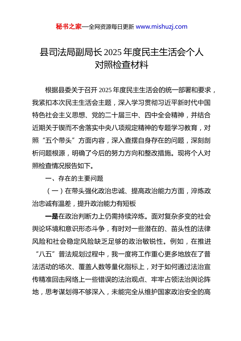 秘书之家—全网资源每日更新 www.mishuzj.com县司法局副局长 2025 年度民主生活会个人对照检查材料 根据县委关于召开 2025 年度民主生活会的统一部署和要求,我紧扣本次民主生活会主题,深入学习贯彻习近平新时代中国特色社会主义思想、党的二十届三中、四中全会精神,并结合近期关于锲而不舍落实中央八项规定精神的专题学习教育,对照“五个带头”方面内容,深入查摆自身存在的问题,深刻剖析问题根源,明确了今后的努力方向和整改措施。现将个人对照检查情况报告如下。一、存在的主要问题(一)在带头强化政治忠诚、提高政治能力方面,淬炼政治忠诚有温差,提升政治能力有短板一是在政治判断力上仍需持续淬炼。面对复杂多变的社会舆论环境和意识形态斗争,有时对一些潜在的、苗头性的法律风险和社会稳定风险缺乏足够的政治敏锐性。例如,在推进“八五”普法规划过程中,我一度将工作重心更多地放在了普法活动的场次、覆盖人数等量化指标上,对于如何通过法治宣传精准回击网络上一些错误的法治观点、牢牢占领法治舆论阵地,思考谋划得不够深入,未能完全从维护国家政治安全的高秘书之家—全网资源每日更新 www.mishuzj.com度来审视和推进普法工作。二是在政治领悟力上仍需持续深化。对党中央的大政方针和省、市、县委的决策部署,虽然能够做到坚决拥护和执行,但在学懂弄通、悟透做实上还存在差距,未能时时将具体业务工作与“国之大者”紧密联系起来。比如,在学习党的二十届四中全会关于完善社会治理体系的新精神时,起初我的理解较多地停留在推进“智慧矫正中心”建设、提升基层司法所规范化水平等业务层面,对其背后蕴含的夯实党在基层的执政根基、推进国家治理体系和治理能力现代化的深远政治意涵,领悟得不够透彻。三是在政治执行力上仍需持续对标。在推动分管工作落实中,有时存在标准不高、结合不紧的问题,未能始终以最高标准、最严要求、最佳效果来衡量工作成效。在指导创建“民主法治示范村”工作中,虽然能够按照县里的工作要点推动创建进度,但在如何将示范村建设与全县乡村振兴战略、基层治理效能提升等中心工作更紧密地结合起来,使其发挥更大的辐射带动作用方面,创造性地贯彻上级意图不够,导致个别示范点的创建特色不够鲜明,与市、省级的更高要求相比存在一定差距。(二)在带头固本培元、增强党性方面,锤炼坚强党性有秘书之家—全网资源每日更新 www.mishuzj.com惰性,筑牢思想根基有松动一是理论学习的系统性和穿透性不强。在学习习近平新时代中国特色社会主义思想上,有时满足于“任务式”学习,存在“用到才学、急用先学”的现象,缺乏“挤”和“钻”的劲头。例如,在筹备一次面向全县人民调解员的业务培训前,我会重点翻阅关于“枫桥经验”的论述,但未能将此与党的群众路线发展史、国家治理现代化等理论进行系统性关联思考,导致理论学习的深度和广度不足,未能完全将蕴含其中的立场、观点、方法转化为指导工作的强大思想武器。二是党性锤炼的自觉性主动性不够。在严格的党内政治生活中锻炼党性的自觉性还不够强,有时存在以事务性工作交流代替严肃思想交锋的情况。在一次讨论“智慧矫正中心”建设方案的党组会上,我的发言内容完全集中在技术参数、预算控制和施工进度上,而忽视了从这次技术革新出发,深入剖析自身在践行以人民为中心的执法理念、推动司法文明进步方面的党性要求和思想差距,党性剖析的“辣味”不足。三是价值追求的纯粹性坚定性偶有偏差。在政绩观上,未能完全摆脱“显性”与“隐性”的思维束缚,对一些打基础、利长远但短期内不易出成效的工作,投入的精力相对不足。相较于组织一场声势浩大的“法律八进”集中宣传活动,我有时秘书之家—全网资源每日更新 www.mishuzj.com对于逐一审核社区矫正对象的档案材料、耐心细致地开展个别化矫正这类基础性工作,在思想深处会不自觉地产生一丝懈怠,这反映出自己的世界观、人生观、价值观这个“总开关”拧得还不够紧。(三)在带头敬畏人民、敬畏组织、敬畏法纪方面,践行群众路线有距离,严守纪律规矩有差距一是深入基层联系群众未能真正“沉下去”。虽然能够坚持落实“四下基层”...