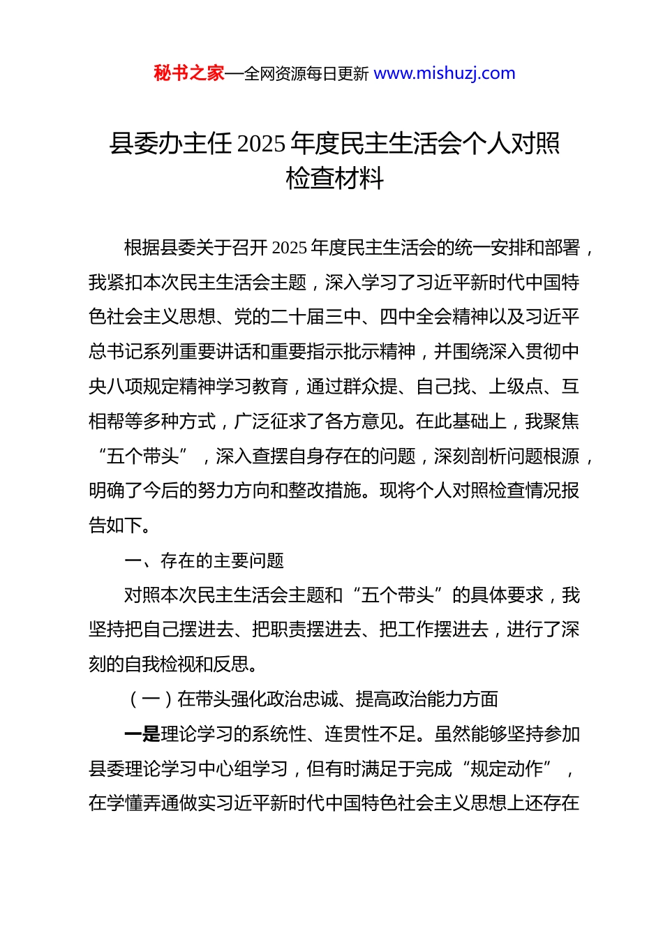 秘书之家—全网资源每日更新 www.mishuzj.com县委办主任 2025 年度民主生活会个人对照检查材料 根据县委关于召开 2025 年度民主生活会的统一安排和部署,我紧扣本次民主生活会主题,深入学习了习近平新时代中国特色社会主义思想、党的二十届三中、四中全会精神以及习近平总书记系列重要讲话和重要指示批示精神,并围绕深入贯彻中央八项规定精神学习教育,通过群众提、自己找、上级点、互相帮等多种方式,广泛征求了各方意见。在此基础上,我聚焦“五个带头”,深入查摆自身存在的问题,深刻剖析问题根源,明确了今后的努力方向和整改措施。现将个人对照检查情况报告如下。一、存在的主要问题对照本次民主生活会主题和“五个带头”的具体要求,我坚持把自己摆进去、把职责摆进去、把工作摆进去,进行了深刻的自我检视和反思。(一)在带头强化政治忠诚、提高政治能力方面一是理论学习的系统性、连贯性不足。虽然能够坚持参加县委理论学习中心组学习,但有时满足于完成“规定动作”,在学懂弄通做实习近平新时代中国特色社会主义思想上还存在秘书之家—全网资源每日更新 www.mishuzj.com差距。例如,在学习党的二十届四中全会的重大决策部署时,更多地停留在通读文件和会议精神层面,未能第一时间结合办公室“三服务”工作实际,系统思考如何将全会精神转化为优化办文办会办事流程、提升服务决策质效的具体方案和制度创新,导致学习成果向实践转化的效果不够理想。二是政治判断力、领悟力的敏锐性需进一步增强。作为县委的“坚强前哨”和“巩固后院”,对一些潜在的风险挑战预判不足。例如,去年在处理涉及我县某个重点项目推进过程中出现的网络负面声音时,我最初的关注点更多地放在了事件本身的事实核查和舆情应对上,对其背后可能关联的社会稳定风险、群众情绪疏导等政治层面的复杂性认识不够深刻,未能第一时间从维护全县政治安全和社会稳定大局的高度提出更为周全的应对预案,反映出从政治上看问题、想问题、作决策的能力仍需加强。三是贯彻执行上级决策部署存在结合不紧的问题。在推动中央和省、市委决策部署在**县落地落实的过程中,有时存在“上下一般粗”的现象,结合**县实际进行创造性落实的力度不够。比如,在根据上级要求起草关于推进乡村振兴战略的实施意见时,初期稿件对上级文件精神的“翻译”多于“转化”,对**县不同乡镇的产业基础、资源禀赋等差异化实际情况研究秘书之家—全网资源每日更新 www.mishuzj.com不透,提出的措施针对性和可操作性还不够强,导致文件在指导实践时效果打了折扣。(二)在带头固本培元、增强党性方面一是党性锻炼的主动性、自觉性有所减弱。日常忙于大量的会务组织、文稿起草、督查督办等具体事务,静下心来反躬自省、加强党性修养的时间相对减少。有时以工作忙为借口,参加党支部组织生活不够积极主动,与支部党员的谈心谈话多是围绕工作,深入了解思想动态、帮助解决实际困难方面做得不够,未能完全做到以普通党员身份接受党组织的教育和监督。二是批评与自我批评的“辣味”不足。在民主生活会或组织生活会上,有时存在“好人主义”思想,批评同志时多是谈工作建议,怕伤和气、怕影响团结,没有真正做到“红脸出汗、排毒治病”。比如,在一次讨论办公室内部工作流程优化的会议上,对个别同志办事拖沓、效率不高的问题,我没有当面严厉指出,而是采取了比较委婉的方式提醒,导致问题未能得到及时有效的纠正。三是艰苦奋斗的优良传统有所淡化。随着工作条件的改善,思想上不自觉地放松了对自己的严格要求。虽然能够严格遵守中央八项规定精神但在一些细节上做得还不够好。例如,在组织全县性大型会议时,有时会下意识地追求会场布置的“高标秘书之家—全网资源每日更新 www.mishuzj.com准”,对一些不必要的开支把关不严,虽然没有超标,但与“过紧日子”的要求相比,还有节约的空间。(三)在带头敬畏人民、敬畏组织、敬畏法纪方面一是调查研究存在“走马观花”现象。虽然经常下基层,但多数是陪同领导调研或开展专项督查真正带着问题、扑下身子、解剖麻雀式的深入调研较少。比如,去年在对全县“放管服”改革推进情况进行督查...
