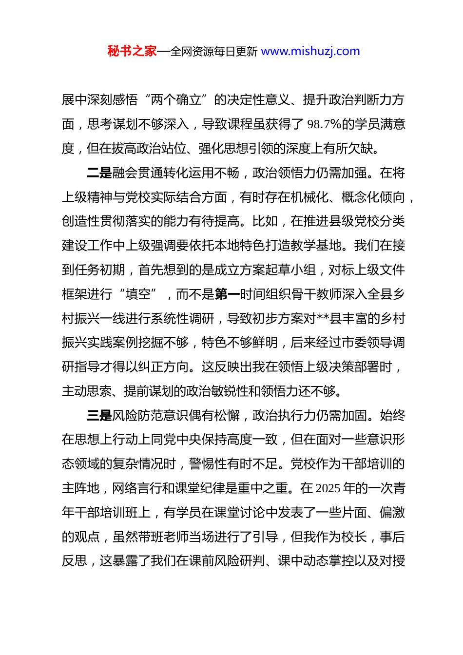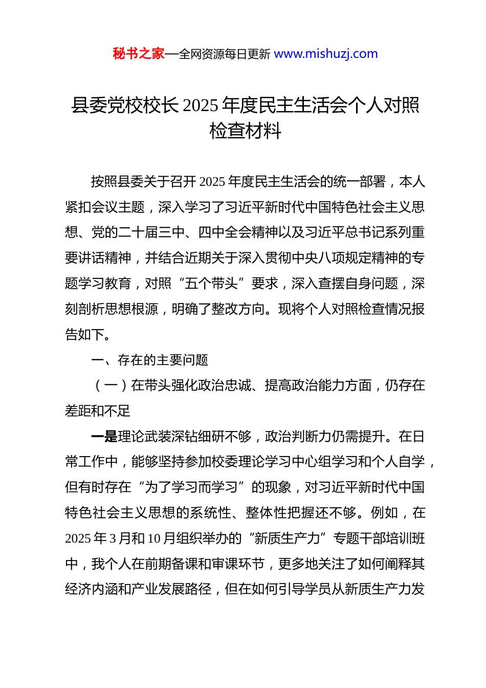 秘书之家—全网资源每日更新 www.mishuzj.com县委党校校长 2025 年度民主生活会个人对照检查材料 按照县委关于召开 2025 年度民主生活会的统一部署,本人紧扣会议主题,深入学习了习近平新时代中国特色社会主义思想、党的二十届三中、四中全会精神以及习近平总书记系列重要讲话精神,并结合近期关于深入贯彻中央八项规定精神的专题学习教育,对照“五个带头”要求,深入查摆自身问题,深刻剖析思想根源,明确了整改方向。现将个人对照检查情况报告如下。一、存在的主要问题(一)在带头强化政治忠诚、提高政治能力方面,仍存在差距和不足一是理论武装深钻细研不够,政治判断力仍需提升。在日常工作中,能够坚持参加校委理论学习中心组学习和个人自学,但有时存在“为了学习而学习”的现象,对习近平新时代中国特色社会主义思想的系统性、整体性把握还不够。例如,在2025 年 3 月和 10 月组织举办的“新质生产力”专题干部培训班中,我个人在前期备课和审课环节,更多地关注了如何阐释其经济内涵和产业发展路径,但在如何引导学员从新质生产力发秘书之家—全网资源每日更新 www.mishuzj.com展中深刻感悟“两个确立”的决定性意义、提升政治判断力方面,思考谋划不够深入,导致课程虽获得了 98.7%的学员满意度,但在拔高政治站位、强化思想引领的深度上有所欠缺。二是融会贯通转化运用不畅,政治领悟力仍需加强。在将上级精神与党校实际结合方面,有时存在机械化、概念化倾向,创造性贯彻落实的能力有待提高。比如,在推进县级党校分类建设工作中上级强调要依托本地特色打造教学基地。我们在接到任务初期,首先想到的是成立方案起草小组,对标上级文件框架进行“填空”,而不是第一时间组织骨干教师深入全县乡村振兴一线进行系统性调研,导致初步方案对**县丰富的乡村振兴实践案例挖掘不够,特色不够鲜明,后来经过市委领导调研指导才得以纠正方向。这反映出我在领悟上级决策部署时,主动思索、提前谋划的政治敏锐性和领悟力还不够。三是风险防范意识偶有松懈,政治执行力仍需加固。始终在思想上行动上同党中央保持高度一致,但在面对一些意识形态领域的复杂情况时,警惕性有时不足。党校作为干部培训的主阵地,网络言行和课堂纪律是重中之重。在 2025 年的一次青年干部培训班上,有学员在课堂讨论中发表了一些片面、偏激的观点,虽然带班老师当场进行了引导,但我作为校长,事后反思,这暴露了我们在课前风险研判、课中动态掌控以及对授秘书之家—全网资源每日更新 www.mishuzj.com课教师进行意识形态风险防范培训等方面还存在薄弱环节,政治执行的穿透力和覆盖面未能做到万无一失。(二)在带头固本培元、增强党性方面,仍存在短板和弱项一是理想信念淬炼不够经常,价值追求偶有蒙尘。能够坚守共产党人的精神追求,但在持之以恒解决世界观、人生观、价值观“总开关”问题上,有时标准不高、要求不严。习惯于通过集体学习、理论灌输等方式进行党性教育,但深入内心、触及灵魂的自我革命、自我剖析做得不够。在党校工作中,有时会不自觉地将干部培训班次的数量、学员的规模作为衡量工作成效的主要标准,而对于学员党性修养是否真正得到提升这一核心目标,缺乏更有效的量化评估和跟踪反馈机制,这实质上是政绩观出现细微偏差的表现。二是党性修养锤炼不够深入,精神谱系践行存有差距。对党章党规党纪能够做到熟知熟记,但将其内化为行为准则、外化为自觉行动的力度尚有不足。例如,在日常管理中,有时碍于情面,对一些同志出现的苗头性、倾向性问题,多以提醒谈话为主,批评的辣味不足,未能真正起到“红脸出汗”的效果。在弘扬伟大建党精神方面,满足于在课堂上讲、在文章中写,但在如何将其融入党校文化建设、教职工日常行为规范,营造秘书之家—全网资源每日更新 www.mishuzj.com浓厚党性锤炼氛围方面,创新举措不多,未能使之成为激励全体教职工奋发作为的强大精神动力。三是纪律规矩意识约束不够严格,自我净化能力有待增强。能够严守党的各项纪律,但在一些“小节”上存在认识模糊区。比如,在公务接待方面,虽然严格遵守中央八项规定精神和省市县实施细则,但...