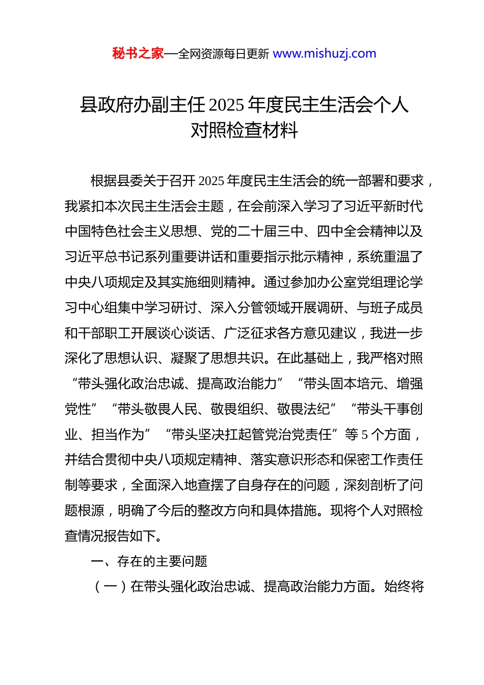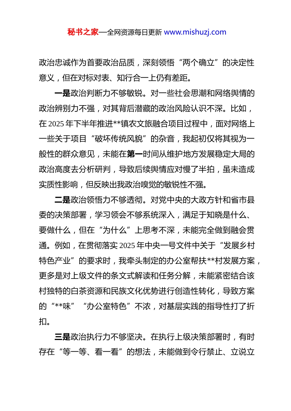 秘书之家—全网资源每日更新 www.mishuzj.com县政府办副主任 2025 年度民主生活会个人对照检查材料 根据县委关于召开 2025 年度民主生活会的统一部署和要求,我紧扣本次民主生活会主题,在会前深入学习了习近平新时代中国特色社会主义思想、党的二十届三中、四中全会精神以及习近平总书记系列重要讲话和重要指示批示精神,系统重温了中央八项规定及其实施细则精神。通过参加办公室党组理论学习中心组集中学习研讨、深入分管领域开展调研、与班子成员和干部职工开展谈心谈话、广泛征求各方意见建议,我进一步深化了思想认识、凝聚了思想共识。在此基础上,我严格对照“带头强化政治忠诚、提高政治能力”“带头固本培元、增强党性”“带头敬畏人民、敬畏组织、敬畏法纪”“带头干事创业、担当作为”“带头坚决扛起管党治党责任”等 5 个方面,并结合贯彻中央八项规定精神、落实意识形态和保密工作责任制等要求,全面深入地查摆了自身存在的问题,深刻剖析了问题根源,明确了今后的整改方向和具体措施。现将个人对照检查情况报告如下。一、存在的主要问题(一)在带头强化政治忠诚、提高政治能力方面。始终将秘书之家—全网资源每日更新 www.mishuzj.com政治忠诚作为首要政治品质,深刻领悟“两个确立”的决定性意义,但在对标对表、知行合一上仍有差距。一是政治判断力不够敏锐。对一些社会思潮和网络舆情的政治辨别力不强,对其背后潜藏的政治风险认识不深。比如,在 2025 年下半年推进**镇农文旅融合项目过程中,面对网络上一些关于项目“破坏传统风貌”的杂音,我起初仅将其视为一般性的群众意见,未能在第一时间从维护地方发展稳定大局的政治高度去分析研判,导致后续舆情应对慢了半拍,虽未造成实质性影响,但反映出我政治嗅觉的敏锐性不强。二是政治领悟力不够透彻。对党中央的大政方针和省市县委的决策部署,学习领会不够系统深入,满足于知晓是什么、要做什么,但在“为什么”上思考不深,未能完全做到融会贯通。例如,在贯彻落实 2025 年中央一号文件中关于“发展乡村特色产业”的要求时,我牵头制定的办公室帮扶**村发展方案,更多是对上级文件的条文式解读和任务分解,未能紧密结合该村独特的白茶资源和民族文化优势进行创造性转化,导致方案的“**味”“办公室特色”不浓,对基层实践的指导性打了折扣。三是政治执行力不够坚决。在执行上级决策部署时,有时存在“等一等、看一看”的想法,未能做到令行禁止、立说立秘书之家—全网资源每日更新 www.mishuzj.com行。2025 年 10 月,县委要求各单位报送数字化改革服务乡村振兴的典型案例,我考虑到当时办公室牵头的几个项目正处在攻坚期,数据和成效尚不突出,便将此事暂缓,想着等项目成熟了再报送,结果错过了最佳报送时机。这实质上是执行力打了折扣,缺乏“不等不靠、主动作为”的政治担当。(二)在带头固本培元、增强党性方面。坚持用习近平新时代中国特色社会主义思想凝心铸魂,但理论武装的系统性和实践性结合不紧。一是理论学习的深度不够。对新思想、新理论的学习,有时停留在“读过了”“学过了”的层面,系统性研读、钻研式思考不够。2025 年全年,我虽然完成了规定的学习任务,撰写了 4 篇学习心得,但对照检查发现,自己更多是关注了与分管工作直接相关的章节,对“五位一体”总体布局、“四个全面”战略布局中其他领域的理论学习投入精力不均,知识体系存在短板。二是党性锤炼的自觉性不强。在党性分析和自我剖析上对自己“下猛药”不够,有时以工作繁忙为由,参加支部组织生活的主动性打了折扣。去年第三季度,我因连续参与筹备全县几个重大会议,曾有 2 次未能全程参加所在党支部的“三会一课”,仅以书面形式请假,这反映出我在处理工学矛盾时,未秘书之家—全网资源每日更新 www.mishuzj.com能始终把加强党性锻炼摆在首位。三是理想信念的根基不牢。面对乡村振兴工作中的复杂矛盾和繁重任务,偶尔会产生畏难情绪和“歇歇脚”的念头。在推进**村集体经济发展项目时,初期因土地流转问题遇到部分村民阻力,连续开了几次协调会效果不彰,我一度产生了“这个项目是不是太急了”的动...