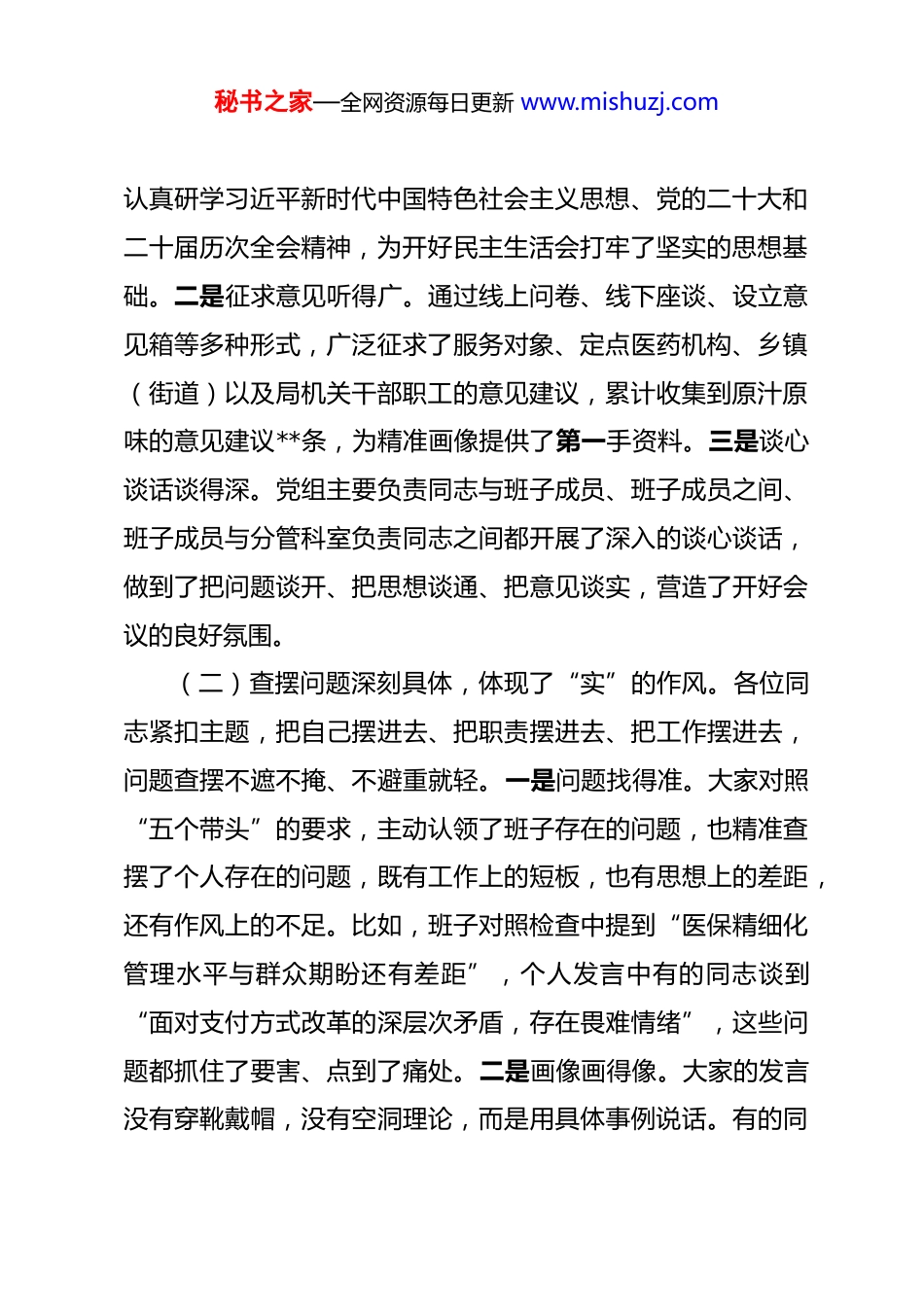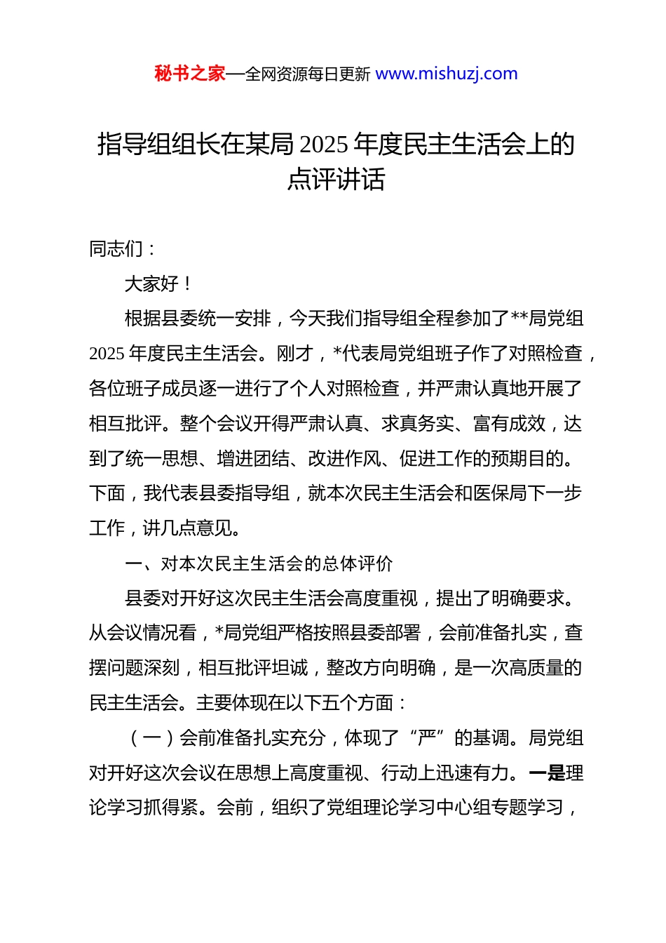 秘书之家—全网资源每日更新 www.mishuzj.com指导组组长在某局 2025 年度民主生活会上的点评讲话 同志们:大家好!根据县委统一安排,今天我们指导组全程参加了**局党组2025 年度民主生活会。刚才,*代表局党组班子作了对照检查,各位班子成员逐一进行了个人对照检查,并严肃认真地开展了相互批评。整个会议开得严肃认真、求真务实、富有成效,达到了统一思想、增进团结、改进作风、促进工作的预期目的。下面,我代表县委指导组,就本次民主生活会和医保局下一步工作,讲几点意见。一、对本次民主生活会的总体评价县委对开好这次民主生活会高度重视,提出了明确要求。从会议情况看,*局党组严格按照县委部署,会前准备扎实,查摆问题深刻,相互批评坦诚,整改方向明确,是一次高质量的民主生活会。主要体现在以下五个方面:(一)会前准备扎实充分,体现了“严”的基调。局党组对开好这次会议在思想上高度重视、行动上迅速有力。一是理论学习抓得紧。会前,组织了党组理论学习中心组专题学习,秘书之家—全网资源每日更新 www.mishuzj.com认真研学习近平新时代中国特色社会主义思想、党的二十大和二十届历次全会精神,为开好民主生活会打牢了坚实的思想基础。二是征求意见听得广。通过线上问卷、线下座谈、设立意见箱等多种形式,广泛征求了服务对象、定点医药机构、乡镇(街道)以及局机关干部职工的意见建议,累计收集到原汁原味的意见建议**条,为精准画像提供了第一手资料。三是谈心谈话谈得深。党组主要负责同志与班子成员、班子成员之间、班子成员与分管科室负责同志之间都开展了深入的谈心谈话,做到了把问题谈开、把思想谈通、把意见谈实,营造了开好会议的良好氛围。(二)查摆问题深刻具体,体现了“实”的作风。各位同志紧扣主题,把自己摆进去、把职责摆进去、把工作摆进去,问题查摆不遮不掩、不避重就轻。一是问题找得准。大家对照“五个带头”的要求,主动认领了班子存在的问题,也精准查摆了个人存在的问题,既有工作上的短板,也有思想上的差距,还有作风上的不足。比如,班子对照检查中提到“医保精细化管理水平与群众期盼还有差距”,个人发言中有的同志谈到“面对支付方式改革的深层次矛盾,存在畏难情绪”,这些问题都抓住了要害、点到了痛处。二是画像画得像。大家的发言没有穿靴戴帽,没有空洞理论,而是用具体事例说话。有的同秘书之家—全网资源每日更新 www.mishuzj.com志谈到在处理异地就医直接结算堵点问题时,亲自跟踪不够,导致问题解决周期较长;有的同志反思在推动药品集中采购政策落地时,对医疗机构的宣讲和培训深度不够。这些问题有血有肉,见人见事,个人形象立体鲜活。(三)根源剖析触及灵魂,体现了“深”的自觉。大家在剖析问题根源时,没有停留在表面现象,而是从世界观、人生观、价值观的深层次上找原因,从政治站位、党性修养、宗旨意识上挖根源。比如,对服务群众“最后一公里”问题,大家没有简单归结为人员少、任务重,而是深刻反思了以人民为中心的发展思想树得牢不牢,与群众的血肉联系保持得紧不紧。对工作中存在的“路径依赖”,大家深刻剖析了是否存在安于现状、不思进取的思想惰性,是否缺乏“敢为天下先”的改革锐气。这种刀刃向内的自我革命精神,难能可贵。(四)相互批评坦诚相见,体现了“真”的辣味。这次会议的相互批评环节,是真点问题、点真问题,有“辣味”、有“火药味”,真正起到了“红脸出汗、排毒治病”的效果。大家本着对组织、对同志、对事业高度负责的态度,开诚布公、直截了当。主要负责同志带头向班子成员提出批评意见,班子成员之间也开展了严肃的相互批评。批评意见既有工作业务上的提醒,比如“在基金监管上,运用大数据等现代化手段还不秘书之家—全网资源每日更新 www.mishuzj.com够,传统的人工核查占比仍然偏高”;也有思想作风上的警醒,比如“下基层调研时,到条件好的地方多,到情况复杂、矛盾突出的地方少,有‘盆景式’调研的倾向”。这些批评意见,是真正的关心和爱护,是同志式的帮助和提醒,大家都能虚心接受,并当场表态认领整改。(五)整改方向清晰明确,体现了“改”的决心。...