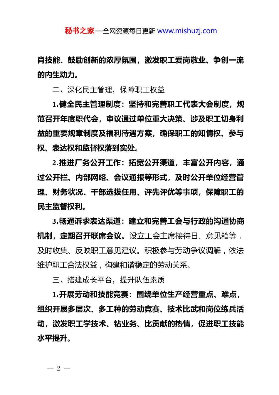 秘书之家—全网资源每日更新 www.mishuzj.comxx 单位基层工会工作总结202x 年,在上级工会和单位*组织的坚强领导下,在行政的大力支持下,本单位工会紧紧围绕中心工作,服务发展大局,切实履行“维护职工合法权益、竭诚服务职工群众”的基本职责,着力加强思想政治引领,深化民主管理,提升职工素质,做实关爱服务,丰富文化生活,团结动员全体职工为促进单位高质量发展作出了积极贡献。现将全年主要工作总结如下:一、强化思想引领,凝聚奋进共识1.坚持正确政治方向:深入学习贯彻*的创新理论及重要会议精神,通过专题学习、辅导报告、座谈交流等多种形式,引导广大职工深刻领悟“两个确立”的决定性意义,增强“四个意识”、坚定“四个自信”、做到“两个维护”,自觉在思想上政治上行动上同*中央保持高度一致。2.加强形势任务教育:结合单位年度目标任务和改革发展实际,持续开展形势政策教育、职业精神教育和法治宣传教育,引导职工认清形势、明确任务、坚定信心,把思想和行动统一到单位的决策部署上来。3.弘扬劳模工匠精神:积极选树和宣传先进典型,组织劳模、先进工作者分享成长经历和奋斗故事,营造尊重劳动、崇— 1 —秘书之家—全网资源每日更新 www.mishuzj.com尚技能、鼓励创新的浓厚氛围,激发职工爱岗敬业、争创一流的内生动力。二、深化民主管理,保障职工权益1.健全民主管理制度:坚持和完善职工代表大会制度,规范召开年度职代会,审议通过单位重大决策、涉及职工切身利益的重要规章制度及福利待遇方案,确保职工的知情权、参与权、表达权和监督权落到实处。2.推进厂务公开工作:拓宽公开渠道,丰富公开内容,通过公开栏、内部网络、会议通报等形式,及时公开单位经营管理、财务状况、干部选拔任用、评先评优等事项,保障职工的民主监督权利。3.畅通诉求表达渠道:建立和完善工会与行政的沟通协商机制,定期召开联席会议。设立工会主席接待日、意见箱等,及时收集、反映职工意见建议。积极参与劳动争议调解,依法维护职工合法权益,构建和谐稳定的劳动关系。三、搭建成长平台,提升队伍素质1.开展劳动和技能竞赛:围绕单位生产经营重点、难点,组织开展多层次、多工种的劳动竞赛、技术比武和岗位练兵活动,激发职工学技术、钻业务、比贡献的热情,促进职工技能水平提升。— 2 —秘书之家—全网资源每日更新 www.mishuzj.com2.支持职工创新创效:鼓励职工开展技术革新、发明创造、合理化建议等活动,建立相关激励机制,为职工施展才华、建功立业搭建平台,推动创新成果转化为现实生产力。3.加强职工教育培训:配合行政部门,开展各类适应性培训、技能提升培训和综合素质培训,关注职工职业生涯发展,努力建设知识型、技能型、创新型劳动者大军。四、做实服务关爱,传递组织温暖1.精准实施帮扶解困:建立健全困难职工档案,实行动态管理。持续开展“春送岗位、夏送清凉、金秋助学、冬送温暖”等品牌活动。对遭遇重大疾病、意外灾害等特殊困难的职工,及时给予救助,传递组织的关怀。2.关注职工身心健康:组织开展健康知识讲座、心理咨询服务。督促落实职工年度体检制度。积极开展工间操、趣味运动会等文体活动,促进职工身心健康。3.改善职工生产生活条件:积极反映职工诉求,推动改善工作环境、后勤保障等。关注职工福利待遇,依法监督相关政策的落实,努力提升职工的获得感、幸福感、安全感。五、丰富文化生活,激发组织活力1.建设职工文化阵地:加强“职工之家”实体化、标准化建设,完善活动设施,管理好、运用好各类文体活动场所,使— 3 —秘书之家—全网资源每日更新 www.mishuzj.com其成为凝聚职工、服务职工的重要阵地。2.组织开展文体活动:结合重要节日和职工需求,精心策划举办文艺汇演、体育比赛、读书分享、户外拓展等形式多样、内容健康的文体活动,丰富职工业余文化生活,增强工会组织的吸引力和凝聚力。3.培育特色文化品牌:结合单位实际,努力打造具有自身特色的职工文化品牌活动,营造积极向上、团结和谐的文化氛围。六、加强自身建设,提升履职能力1.规范工会组织建设:按期进行工会换届选举,配齐配强工会干部。加强工会会员管理...