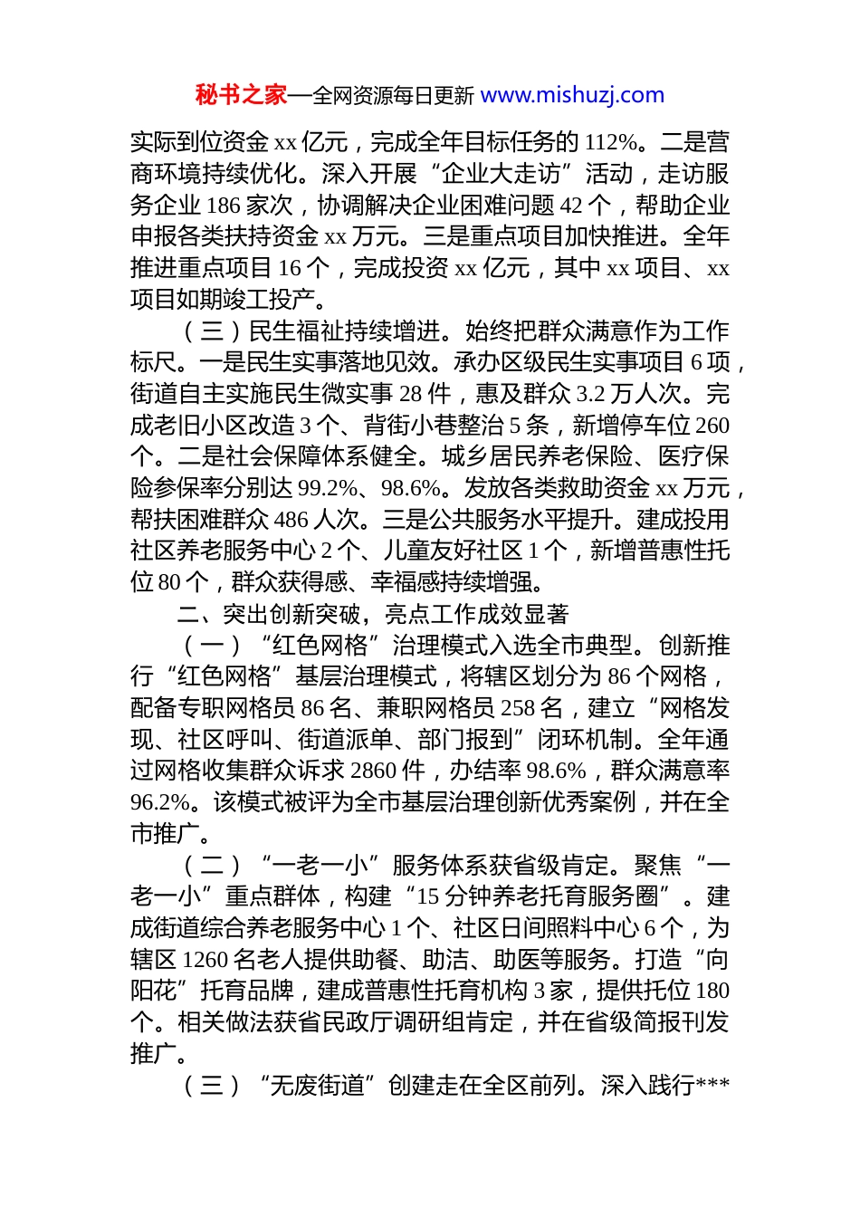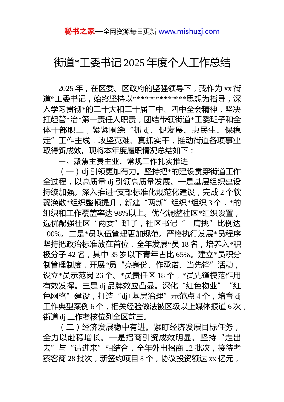 秘书之家—全网资源每日更新 www.mishuzj.com街道*工委书记 2025 年度个人工作总结2025 年,在区委、区政府的坚强领导下,我作为 xx 街道*工委书记,始终坚持以**************思想为指导,深入学习贯彻*的二十大和二十届三中、四中全会精神,坚决扛起管*治*第一责任人职责,团结带领街道*工委班子和全体干部职工,紧紧围绕“抓 dj、促发展、惠民生、保稳定”工作主线,攻坚克难、真抓实干,推动街道各项事业取得新成效。现将本年度履职情况总结如下:一、聚焦主责主业,常规工作扎实推进(一)dj 引领更加有力。坚持把*的建设贯穿街道工作全过程,以高质量 dj 引领高质量发展。一是基层组织建设持续加强。深入推进*支部标准化规范化建设,完成 2 个软弱涣散*组织整顿提升,新建“两新”组织*组织 3 个,*的组织和工作覆盖率达 98%以上。优化调整社区*组织设置,选优配强社区“两委”班子,社区书记“一肩挑”比例达100%。二是*员队伍管理更加规范。严格执行发展*员程序坚持把政治标准放在首位,全年发展*员 18 名,培养入*积极分子 42 名,其中 35 岁以下青年占比 65%。建立*员积分制管理制度,开展*员“亮身份、作承诺、当先锋”活动,设立*员示范岗 26 个、*员责任区 18 个,*员先锋模范作用有效发挥。三是 dj 品牌效应凸显。深化“红色物业”“红色网格”建设,打造“dj+基层治理”示范点 4 个,培育 dj工作典型案例 6 个,相关经验做法被区级以上媒体报道 6 次,街道 dj 工作考核位列全区前三。(二)经济发展稳中有进。紧盯经济发展目标任务,全力以赴稳增长。一是招商引资成效明显。坚持“走出去”与“请进来”相结合,全年外出招商 12 批次,接待考察客商 28 批次,新签约项目 8 个,协议投资额达 xx 亿元,秘书之家—全网资源每日更新 www.mishuzj.com实际到位资金 xx 亿元,完成全年目标任务的 112%。二是营商环境持续优化。深入开展“企业大走访”活动,走访服务企业 186 家次,协调解决企业困难问题 42 个,帮助企业申报各类扶持资金 xx 万元。三是重点项目加快推进。全年推进重点项目 16 个,完成投资 xx 亿元,其中 xx 项目、xx项目如期竣工投产。(三)民生福祉持续增进。始终把群众满意作为工作标尺。一是民生实事落地见效。承办区级民生实事项目 6 项,街道自主实施民生微实事 28 件,惠及群众 3.2 万人次。完成老旧小区改造 3 个、背街小巷整治 5 条,新增停车位 260个。二是社会保障体系健全。城乡居民养老保险、医疗保险参保率分别达 99.2%、98.6%。发放各类救助资金 xx 万元,帮扶困难群众 486 人次。三是公共服务水平提升。建成投用社区养老服务中心 2 个、儿童友好社区 1 个,新增普惠性托位 80 个,群众获得感、幸福感持续增强。二、突出创新突破,亮点工作成效显著(一)“红色网格”治理模式入选全市典型。创新推行“红色网格”基层治理模式,将辖区划分为 86 个网格,配备专职网格员 86 名、兼职网格员 258 名,建立“网格发现、社区呼叫、街道派单、部门报到”闭环机制。全年通过网格收集群众诉求 2860 件,办结率 98.6%,群众满意率96.2%。该模式被评为全市基层治理创新优秀案例,并在全市推广。(二)“一老一小”服务体系获省级肯定。聚焦“一老一小”重点群体,构建“15 分钟养老托育服务圈”。建成街道综合养老服务中心 1 个、社区日间照料中心 6 个,为辖区 1260 名老人提供助餐、助洁、助医等服务。打造“向阳花”托育品牌,建成普惠性托育机构 3 家,提供托位 180个。相关做法获省民政厅调研组肯定,并在省级简报刊发推广。(三)“无废街道”创建走在全区前列。深入践行***秘书之家—全网资源每日更新 www.mishuzj.com生态文明思想,率先开展“无废街道”创建。建成垃圾分类示范小区 12 个,生活垃圾分类覆盖率达 100%,资源化利用率达 62%。创新“垃圾分类积分兑换”机制,参与居民达 1.8 万户,累计兑换积分 86 万分。顺利通过市级“无废街道”验收,成为全区首个获此称号的街道。三、扛牢政治责任,从严治*纵深推进(一...