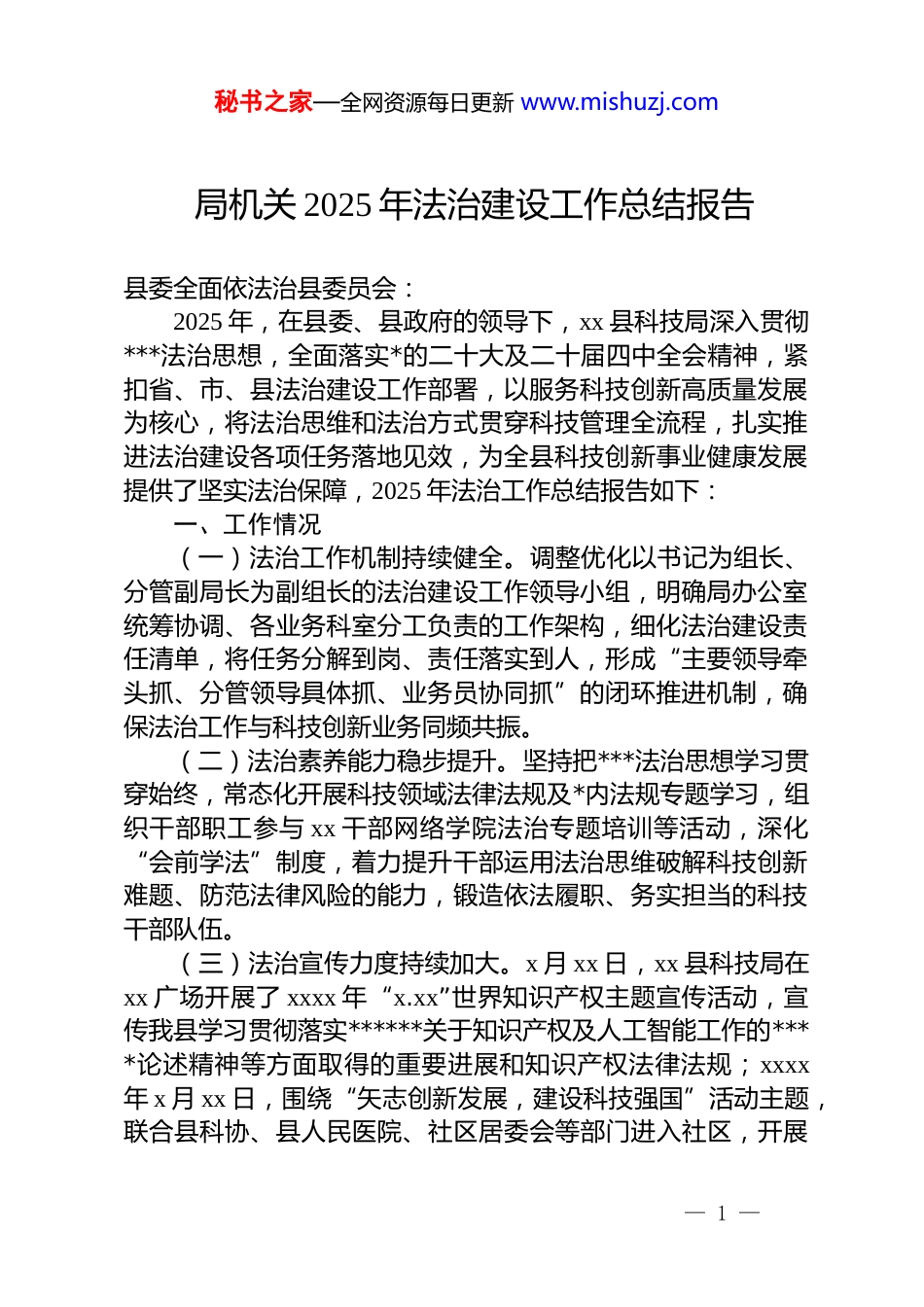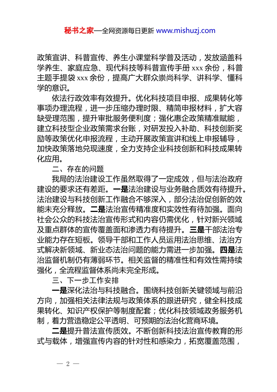 秘书之家—全网资源每日更新 www.mishuzj.com局机关 2025 年法治建设工作总结报告县委全面依法治县委员会:2025 年,在县委、县政府的领导下,xx 县科技局深入贯彻***法治思想,全面落实*的二十大及二十届四中全会精神,紧扣省、市、县法治建设工作部署,以服务科技创新高质量发展为核心,将法治思维和法治方式贯穿科技管理全流程,扎实推进法治建设各项任务落地见效,为全县科技创新事业健康发展提供了坚实法治保障,2025 年法治工作总结报告如下:一、工作情况(一)法治工作机制持续健全。调整优化以书记为组长、分管副局长为副组长的法治建设工作领导小组,明确局办公室统筹协调、各业务科室分工负责的工作架构,细化法治建设责任清单,将任务分解到岗、责任落实到人,形成“主要领导牵头抓、分管领导具体抓、业务员协同抓”的闭环推进机制,确保法治工作与科技创新业务同频共振。(二)法治素养能力稳步提升。坚持把***法治思想学习贯穿始终,常态化开展科技领域法律法规及*内法规专题学习,组织干部职工参与 xx 干部网络学院法治专题培训等活动,深化“会前学法”制度,着力提升干部运用法治思维破解科技创新难题、防范法律风险的能力,锻造依法履职、务实担当的科技干部队伍。(三)法治宣传力度持续加大。x 月 xx 日,xx 县科技局在xx 广场开展了 xxxx 年“x.xx”世界知识产权主题宣传活动,宣传我县学习贯彻落实******关于知识产权及人工智能工作的****论述精神等方面取得的重要进展和知识产权法律法规;xxxx年 x 月 xx 日,围绕“矢志创新发展,建设科技强国”活动主题,联合县科协、县人民医院、社区居委会等部门进入社区,开展— 1 —秘书之家—全网资源每日更新 www.mishuzj.com政策宣讲、科普宣传、养生小课堂科学普及活动,发放涵盖科学养生、家庭应急、现代科技等科普宣传手册 xxx 余份,科普主题手提袋 xxx 余份,提高广大群众崇尚科学、讲科学、懂科学的意识。依法行政效率有效提升。优化科技项目申报、成果转化等事项办理流程,进一步压缩办理时限、精简申报材料,扩大容缺受理范围,提升审批服务便利度;强化惠企政策精准赋能,建立科技型企业政策需求台账,对研发投入补助、科技创新奖励等政策优化申报流程,主动开展政策宣讲和线上申报辅导,加快政策落地兑现速度,全力支持企业科技创新和科技成果转化应用。二、存在的问题我局的法治建设工作虽然取得了一定成效,但与法治政府建设的要求还有差距。一是法治建设与业务融合质效有待提升。法治建设与科技创新工作融合不够深入,部分法治促创新的效能未充分释放。二是法治宣传精准度和实效性有待加强。面向社会公众的科技法治宣传形式和内容仍需优化,针对新兴领域及重点群体的宣传覆盖面和渗透力有待提升。三是干部法治专业能力存在短板。领导干部和工作人员运用法治思维、法治方式解决新领域、新业态法治问题的能力需进一步加强。四是法治监督机制仍有薄弱环节。相关监督的精准性和有效性需持续强化,全流程监督体系尚未完全形成。三、下一步工作安排一是深化法治与科技融合。围绕科技创新关键领域与前沿方向,加强相关法律法规与政策体系的跟进研究,健全科技成果转化、知识产权保护等制度配套;优化科技领域政务服务机制,着力营造稳定公平透明、可预期的法治化营商环境。二是提升普法宣传质效。不断创新科技法治宣传教育的形式与载体,增强宣传内容的针对性和感染力,拓宽覆盖范围,— 2 —秘书之家—全网资源每日更新 www.mishuzj.com提升社会影响力,积极推动科技法治理念深入人心、形成共识。三是加强法治能力建设。通过常态化开展法治专题培训与业务研讨,依托法律专家和骨干力量进行专业辅导,持续提升干部职工运用法治思维和法治方式服务科技创新的能力;加强法律顾问队伍建设,为科技研发与产业创新提供坚实法律支撑。— 3 —