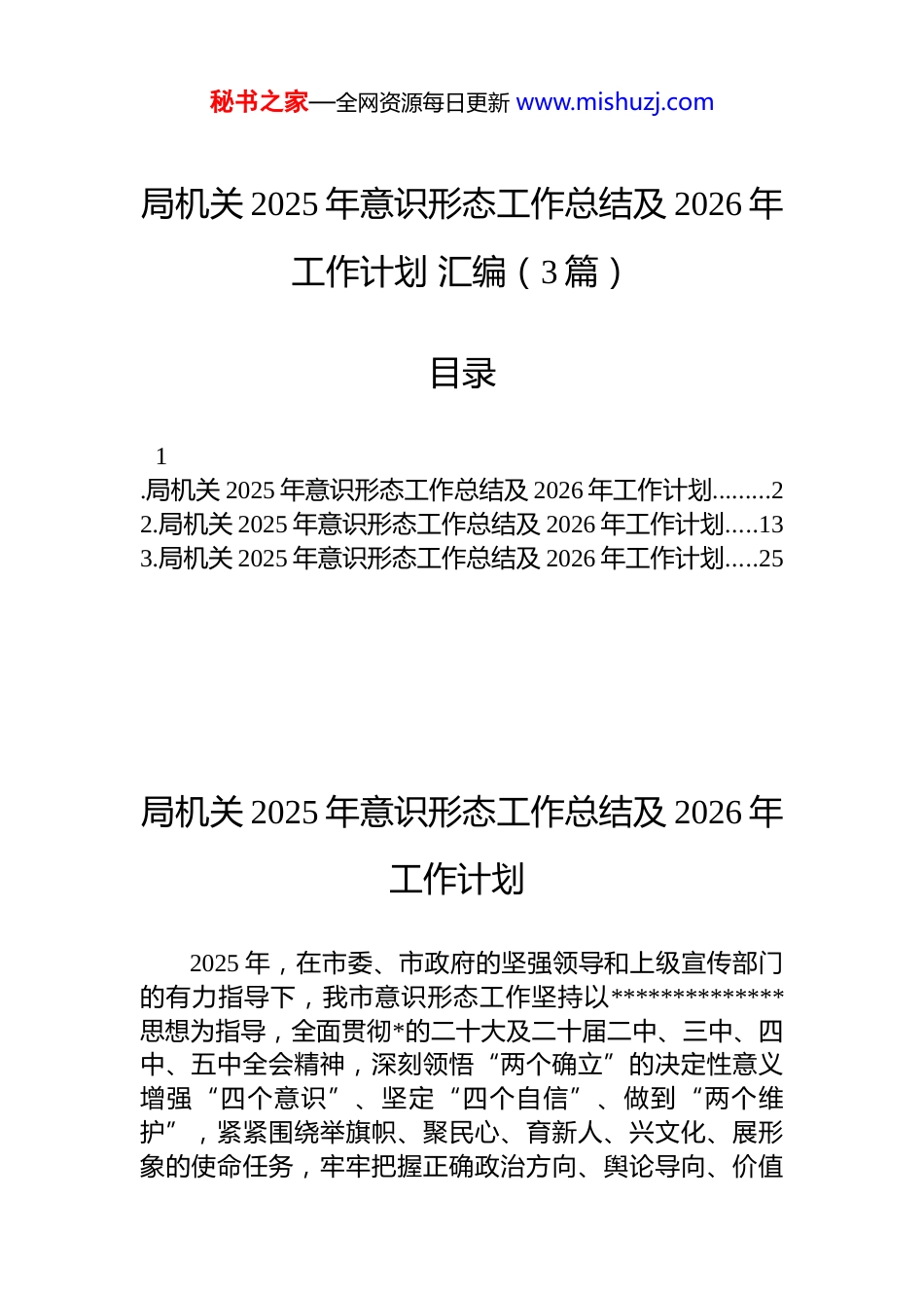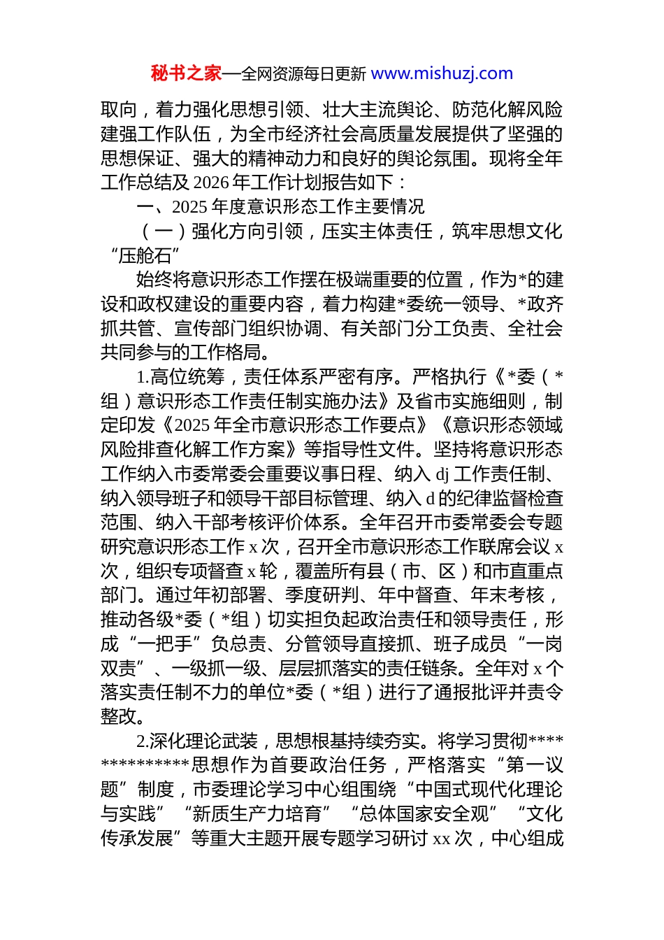 秘书之家—全网资源每日更新 www.mishuzj.com局机关 2025 年意识形态工作总结及 2026 年工作计划 汇编(3 篇)目录1.局机关 2025 年意识形态工作总结及 2026 年工作计划.........22.局机关 2025 年意识形态工作总结及 2026 年工作计划.....133.局机关 2025 年意识形态工作总结及 2026 年工作计划.....25局机关 2025 年意识形态工作总结及 2026 年工作计划 2025 年,在市委、市政府的坚强领导和上级宣传部门的有力指导下,我市意识形态工作坚持以**************思想为指导,全面贯彻*的二十大及二十届二中、三中、四中、五中全会精神,深刻领悟“两个确立”的决定性意义增强“四个意识”、坚定“四个自信”、做到“两个维护”,紧紧围绕举旗帜、聚民心、育新人、兴文化、展形象的使命任务,牢牢把握正确政治方向、舆论导向、价值秘书之家—全网资源每日更新 www.mishuzj.com取向,着力强化思想引领、壮大主流舆论、防范化解风险建强工作队伍,为全市经济社会高质量发展提供了坚强的思想保证、强大的精神动力和良好的舆论氛围。现将全年工作总结及 2026 年工作计划报告如下:一、2025 年度意识形态工作主要情况(一)强化方向引领,压实主体责任,筑牢思想文化“压舱石”始终将意识形态工作摆在极端重要的位置,作为*的建设和政权建设的重要内容,着力构建*委统一领导、*政齐抓共管、宣传部门组织协调、有关部门分工负责、全社会共同参与的工作格局。1.高位统筹,责任体系严密有序。严格执行《*委(*组)意识形态工作责任制实施办法》及省市实施细则,制定印发《2025 年全市意识形态工作要点》《意识形态领域风险排查化解工作方案》等指导性文件。坚持将意识形态工作纳入市委常委会重要议事日程、纳入 dj 工作责任制、纳入领导班子和领导干部目标管理、纳入 d 的纪律监督检查范围、纳入干部考核评价体系。全年召开市委常委会专题研究意识形态工作 x 次,召开全市意识形态工作联席会议 x次,组织专项督查 x 轮,覆盖所有县(市、区)和市直重点部门。通过年初部署、季度研判、年中督查、年末考核,推动各级*委(*组)切实担负起政治责任和领导责任,形成“一把手”负总责、分管领导直接抓、班子成员“一岗双责”、一级抓一级、层层抓落实的责任链条。全年对 x 个落实责任制不力的单位*委(*组)进行了通报批评并责令整改。2.深化理论武装,思想根基持续夯实。将学习贯彻**************思想作为首要政治任务,严格落实“第一议题”制度,市委理论学习中心组围绕“中国式现代化理论与实践”“新质生产力培育”“总体国家安全观”“文化传承发展”等重大主题开展专题学习研讨 xx 次,中心组成秘书之家—全网资源每日更新 www.mishuzj.com员撰写调研报告、理论文章 xx 余篇。组建“理响 xx”宣讲团,创新“理论+文艺”“理论+故事”“理论+云端”等宣讲模式,依托新时代文明实践中心(所、站)、县级融媒体中心、“学习强国”学习平台等阵地,深入机关、企业学校、社区、农村、网络开展对象化、分众化、互动化宣讲 xxxx 余场次,直接受众超 xxx 万人次。举办全市县处级领导干部学习贯彻*的二十大精神专题培训班 x 期,轮训干部 xxx 余人。推动*的创新理论进教材、进课堂、进头脑,大中小学思政课一体化建设取得新进展。3.压实阵地管理,主导权掌控有力。全面加强对各类意识形态阵地的建设和管理。严格新闻出版、广播影视、文化市场、社科机构、讲座论坛、报告会、研讨会等审批备案和内容把关。对全市历史遗址、纪念设施、博物馆、美术馆、图书馆、文化馆等公共文化服务场所进行规范管理深入挖掘地方红色文化、优秀传统文化资源,将其打造成为弘扬社会主义核心价值观、开展爱国主义教育的重要基地。健全“市—县—乡—村—网格”五级网络舆情监测预警和应急处置体系,配备专兼职网评员、网络监督员队伍全年监测处置涉及本地的重大敏感网络舆情 xx 起,有效引导社会情绪。深入开展“清朗”系列专项行动,依法约谈违规自媒体账号 xx 个,关闭散布谣言、违规采编的网站平台 x 个,查处网络谣言案件 x 起,行政处罚 x 人,刑...