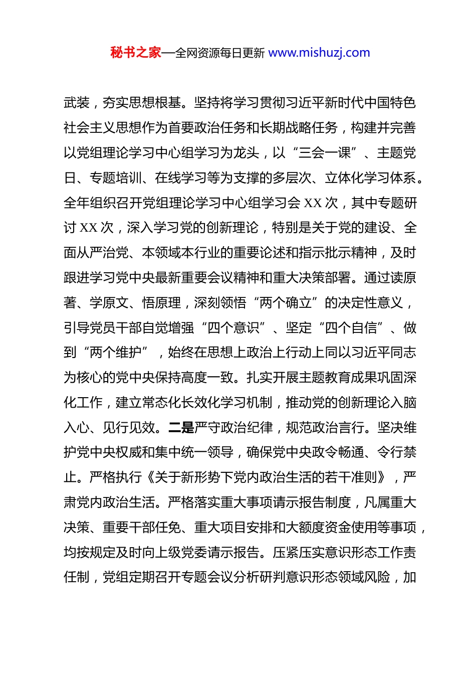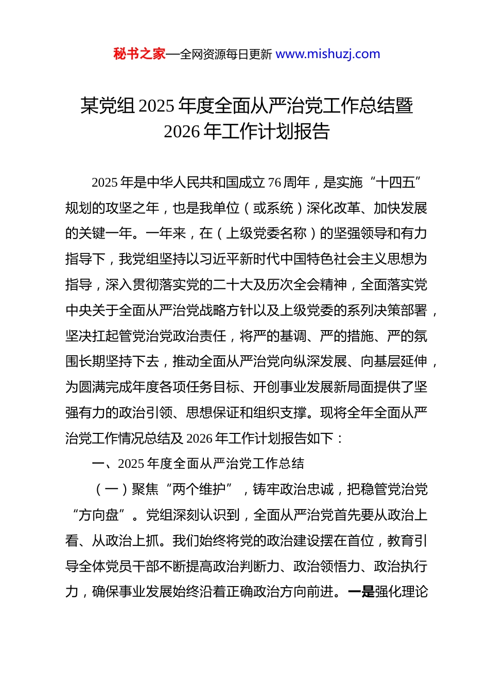 秘书之家—全网资源每日更新 www.mishuzj.com某党组 2025 年度全面从严治党工作总结暨2026 年工作计划报告 2025 年是中华人民共和国成立 76 周年,是实施“十四五”规划的攻坚之年,也是我单位(或系统)深化改革、加快发展的关键一年。一年来,在(上级党委名称)的坚强领导和有力指导下,我党组坚持以习近平新时代中国特色社会主义思想为指导,深入贯彻落实党的二十大及历次全会精神,全面落实党中央关于全面从严治党战略方针以及上级党委的系列决策部署,坚决扛起管党治党政治责任,将严的基调、严的措施、严的氛围长期坚持下去,推动全面从严治党向纵深发展、向基层延伸,为圆满完成年度各项任务目标、开创事业发展新局面提供了坚强有力的政治引领、思想保证和组织支撑。现将全年全面从严治党工作情况总结及 2026 年工作计划报告如下:一、2025 年度全面从严治党工作总结(一)聚焦“两个维护”,铸牢政治忠诚,把稳管党治党“方向盘”。党组深刻认识到,全面从严治党首先要从政治上看、从政治上抓。我们始终将党的政治建设摆在首位,教育引导全体党员干部不断提高政治判断力、政治领悟力、政治执行力,确保事业发展始终沿着正确政治方向前进。一是强化理论秘书之家—全网资源每日更新 www.mishuzj.com武装,夯实思想根基。坚持将学习贯彻习近平新时代中国特色社会主义思想作为首要政治任务和长期战略任务,构建并完善以党组理论学习中心组学习为龙头,以“三会一课”、主题党日、专题培训、在线学习等为支撑的多层次、立体化学习体系。全年组织召开党组理论学习中心组学习会 XX 次,其中专题研讨 XX 次,深入学习党的创新理论,特别是关于党的建设、全面从严治党、本领域本行业的重要论述和指示批示精神,及时跟进学习党中央最新重要会议精神和重大决策部署。通过读原著、学原文、悟原理,深刻领悟“两个确立”的决定性意义,引导党员干部自觉增强“四个意识”、坚定“四个自信”、做到“两个维护”,始终在思想上政治上行动上同以习近平同志为核心的党中央保持高度一致。扎实开展主题教育成果巩固深化工作,建立常态化长效化学习机制,推动党的创新理论入脑入心、见行见效。二是严守政治纪律,规范政治言行。坚决维护党中央权威和集中统一领导,确保党中央政令畅通、令行禁止。严格执行《关于新形势下党内政治生活的若干准则》,严肃党内政治生活。严格落实重大事项请示报告制度,凡属重大决策、重要干部任免、重大项目安排和大额度资金使用等事项,均按规定及时向上级党委请示报告。压紧压实意识形态工作责任制,党组定期召开专题会议分析研判意识形态领域风险,加秘书之家—全网资源每日更新 www.mishuzj.com强对本单位(系统)网站、刊物、讲座、论坛、新媒体平台等各类阵地的建设和管理,严把政治关、内容关、导向关,旗帜鲜明反对和抵制各种错误观点和思潮,牢牢掌握意识形态工作领导权主动权。教育引导党员干部自觉规范线上线下政治言行,不准散布违背党的理论和路线方针政策的言论,不准制造、传播政治谣言及丑化党和国家形象的言论。三是强化政治监督,保障决策部署落地。将贯彻落实习近平总书记重要指示批示精神和党中央重大决策部署作为政治监督的首要任务,建立台账管理、督查问责机制。围绕(结合本单位实际,列举 1-2 项重大国家战略或上级重点任务,例如:服务高质量发展、深化改革开放、防范化解重大风险等)开展专项监督检查,确保执行不偏向、不变通、不走样。加强对民主生活会、组织生活会查摆问题整改落实情况的监督,推动党内政治生活严起来、实起来。严明换届纪律,确保(如有)换届工作风清气正。(二)聚焦组织赋能,夯实基层基础,建强管党治党“战斗堡垒”。党组牢固树立大抓基层的鲜明导向,以提升组织力为重点,突出政治功能,着力把基层党组织建设成为有效实现党的领导的坚强战斗堡垒。一是健全组织体系,提升覆盖质量。优化基层党组织设置,确保党的组织和工作全覆盖、无盲区。结合机构改革、业务调整等情况,及时新建、调整、撤销党支秘书之家—全网资源每日更新 www.mishuzj.com部,选优配强党支部书记。深化党支部标准...