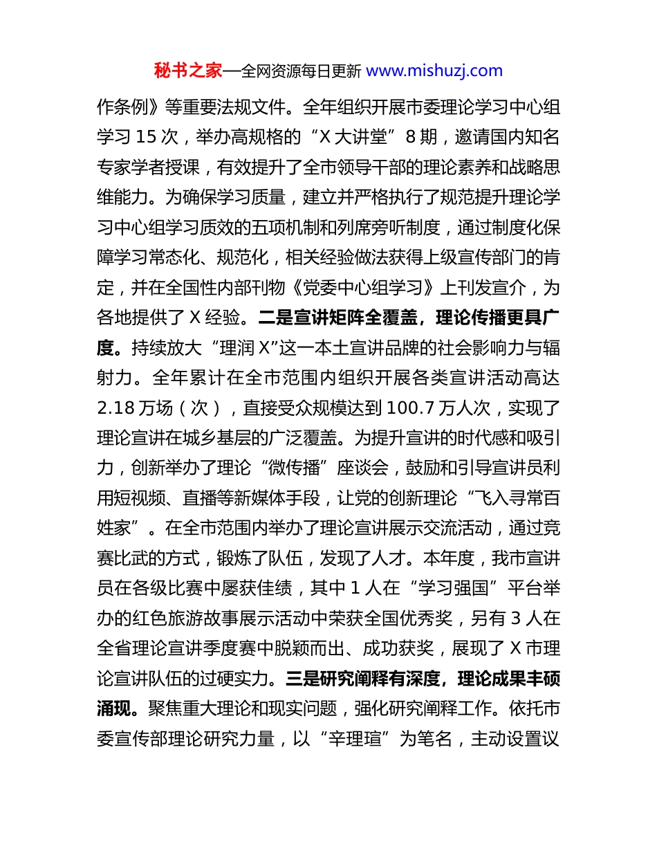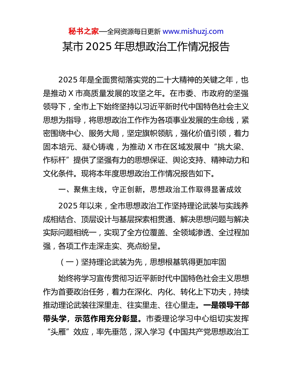 秘书之家—全网资源每日更新 www.mishuzj.com某市 2025 年思想政治工作情况报告2025 年是全面贯彻落实党的二十大精神的关键之年,也是推动 X 市高质量发展的攻坚之年。在市委、市政府的坚强领导下,全市上下始终坚持以习近平新时代中国特色社会主义思想为指导,将思想政治工作作为各项事业发展的生命线,紧密围绕中心、服务大局,坚定旗帜领航,强化价值引领,着力固本培元、凝心铸魂,为推动 X 市在区域发展中“挑大梁、作标杆”提供了坚强有力的思想保证、舆论支持、精神动力和文化条件。现将本年度思想政治工作情况报告如下。一、聚焦主线,守正创新,思想政治工作取得显著成效2025 年以来,全市思想政治工作坚持理论武装与实践养成相结合、顶层设计与基层探索相贯通、解决思想问题与解决实际问题相统一,实现了全方位覆盖、全领域渗透、全过程加强,各项工作走深走实、亮点纷呈。(一)坚持理论武装为先,思想根基筑得更加牢固始终将学习宣传贯彻习近平新时代中国特色社会主义思想作为首要政治任务,着力在深化、内化、转化上下功夫,持续推动理论武装往深里走、往实里走、往心里走。一是领导干部带头学,示范作用充分彰显。市委理论学习中心组切实发挥“头雁”效应,率先垂范,深入学习《中国共产党思想政治工秘书之家—全网资源每日更新 www.mishuzj.com作条例》等重要法规文件。全年组织开展市委理论学习中心组学习 15 次,举办高规格的“X 大讲堂”8 期,邀请国内知名专家学者授课,有效提升了全市领导干部的理论素养和战略思维能力。为确保学习质量,建立并严格执行了规范提升理论学习中心组学习质效的五项机制和列席旁听制度,通过制度化保障学习常态化、规范化,相关经验做法获得上级宣传部门的肯定,并在全国性内部刊物《党委中心组学习》上刊发宣介,为各地提供了 X 经验。二是宣讲矩阵全覆盖,理论传播更具广度。持续放大“理润 X”这一本土宣讲品牌的社会影响力与辐射力。全年累计在全市范围内组织开展各类宣讲活动高达2.18 万场(次),直接受众规模达到 100.7 万人次,实现了理论宣讲在城乡基层的广泛覆盖。为提升宣讲的时代感和吸引力,创新举办了理论“微传播”座谈会,鼓励和引导宣讲员利用短视频、直播等新媒体手段,让党的创新理论“飞入寻常百姓家”。在全市范围内举办了理论宣讲展示交流活动,通过竞赛比武的方式,锻炼了队伍,发现了人才。本年度,我市宣讲员在各级比赛中屡获佳绩,其中 1 人在“学习强国”平台举办的红色旅游故事展示活动中荣获全国优秀奖,另有 3 人在全省理论宣讲季度赛中脱颖而出、成功获奖,展现了 X 市理论宣讲队伍的过硬实力。三是研究阐释有深度,理论成果丰硕涌现。聚焦重大理论和现实问题,强化研究阐释工作。依托市委宣传部理论研究力量,以“辛理瑄”为笔名,主动设置议秘书之家—全网资源每日更新 www.mishuzj.com题,积极引导舆论,全年共推出深度理论文章 16 篇,在澄清谬误、明辨是非、凝聚共识方面发挥了重要作用。向“学习强国”全国平台报送的稿件中,有 86 篇被成功采用,有力地宣传了 X 市的发展成就和经验。在学术研究领域同样取得突破,成功获批省级人文社科项目 4 个,为地方经济社会发展提供了智力支持。同时,在社科普及方面,2 名讲解员在全省社科普及基地讲解员大赛中获奖,6 部作品在第三届全省社科普及短视频大赛中获奖,体现了 X 市在社科知识大众化、通俗化方面的积极探索和显著成效。(二)强化价值引领为核,社会文明新风尚日益浓厚坚持以社会主义核心价值观为引领,深入实施公民道德建设工程,大力弘扬时代新风,推动形成崇德向善、见贤思齐的社会氛围。一是核心价值观融入日常,思想共识持续凝聚。积极承办高层次的社会主义核心价值观 X 专题讲座,邀请权威专家深入解读,引导广大干部群众深刻理解其丰富内涵和实践要求。充分利用本地丰富的红色资源,成功策划并举办了“清明祭英烈重走长征路”大型思政教育主题实践活动,组织数千名党员干部、青少年学生重温革命历史,缅怀革命先烈,在庄严的仪式感和沉浸式体验中接受深刻的思想洗礼,让红色基因代代相...