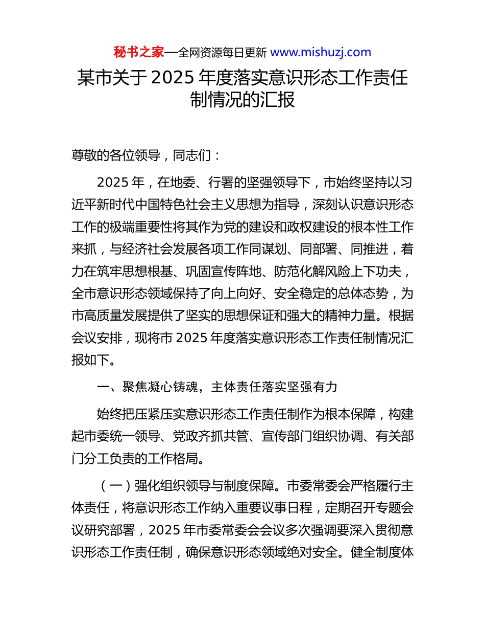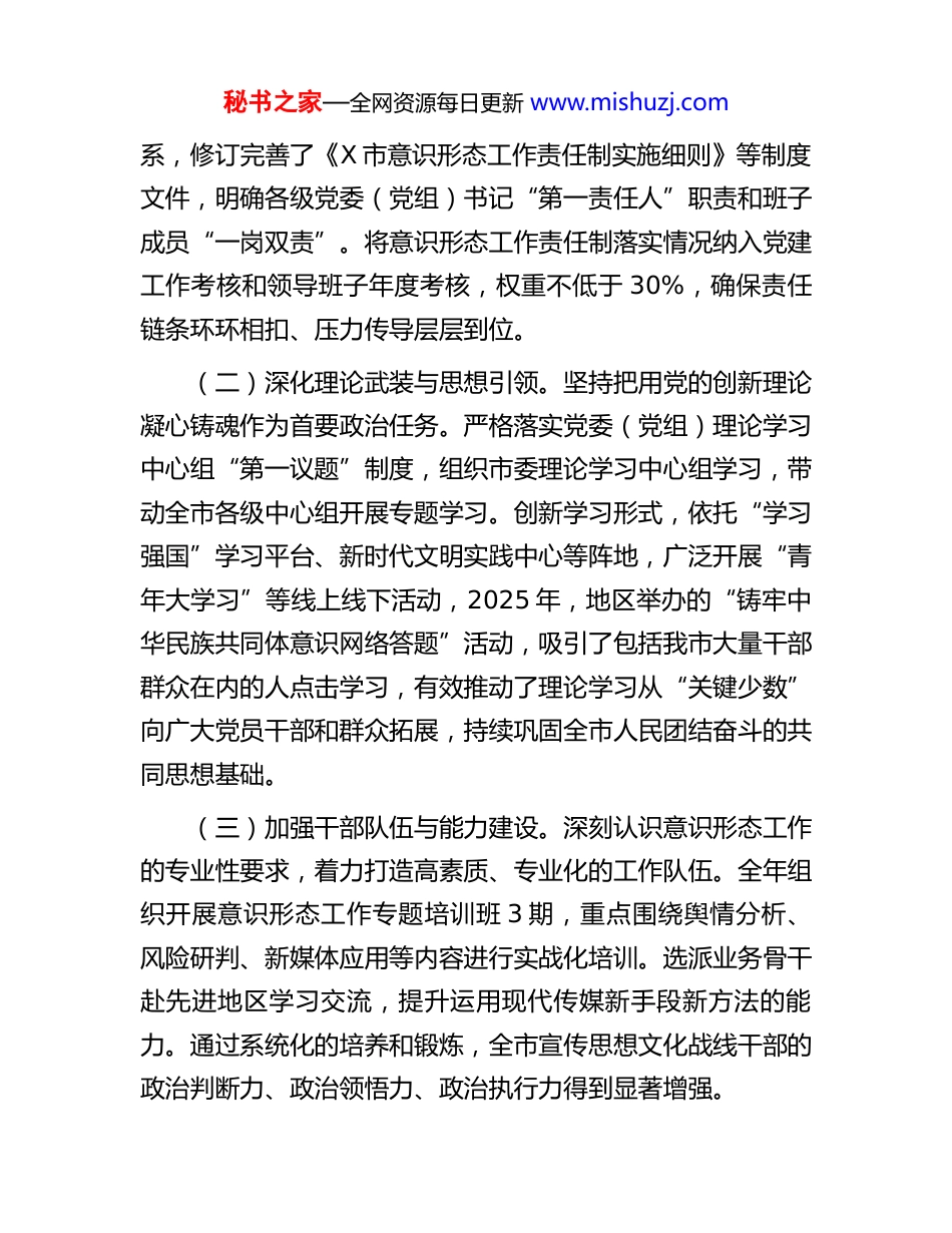 秘书之家—全网资源每日更新 www.mishuzj.com某市关于 2025 年度落实意识形态工作责任制情况的汇报尊敬的各位领导,同志们:2025 年,在地委、行署的坚强领导下,市始终坚持以习近平新时代中国特色社会主义思想为指导,深刻认识意识形态工作的极端重要性将其作为党的建设和政权建设的根本性工作来抓,与经济社会发展各项工作同谋划、同部署、同推进,着力在筑牢思想根基、巩固宣传阵地、防范化解风险上下功夫,全市意识形态领域保持了向上向好、安全稳定的总体态势,为市高质量发展提供了坚实的思想保证和强大的精神力量。根据会议安排,现将市 2025 年度落实意识形态工作责任制情况汇报如下。一、聚焦凝心铸魂,主体责任落实坚强有力始终把压紧压实意识形态工作责任制作为根本保障,构建起市委统一领导、党政齐抓共管、宣传部门组织协调、有关部门分工负责的工作格局。(一)强化组织领导与制度保障。市委常委会严格履行主体责任,将意识形态工作纳入重要议事日程,定期召开专题会议研究部署,2025 年市委常委会会议多次强调要深入贯彻意识形态工作责任制,确保意识形态领域绝对安全。健全制度体秘书之家—全网资源每日更新 www.mishuzj.com系,修订完善了《X 市意识形态工作责任制实施细则》等制度文件,明确各级党委(党组)书记“第一责任人”职责和班子成员“一岗双责”。将意识形态工作责任制落实情况纳入党建工作考核和领导班子年度考核,权重不低于 30%,确保责任链条环环相扣、压力传导层层到位。(二)深化理论武装与思想引领。坚持把用党的创新理论凝心铸魂作为首要政治任务。严格落实党委(党组)理论学习中心组“第一议题”制度,组织市委理论学习中心组学习,带动全市各级中心组开展专题学习。创新学习形式,依托“学习强国”学习平台、新时代文明实践中心等阵地,广泛开展“青年大学习”等线上线下活动,2025 年,地区举办的“铸牢中华民族共同体意识网络答题”活动,吸引了包括我市大量干部群众在内的人点击学习,有效推动了理论学习从“关键少数”向广大党员干部和群众拓展,持续巩固全市人民团结奋斗的共同思想基础。(三)加强干部队伍与能力建设。深刻认识意识形态工作的专业性要求,着力打造高素质、专业化的工作队伍。全年组织开展意识形态工作专题培训班 3 期,重点围绕舆情分析、风险研判、新媒体应用等内容进行实战化培训。选派业务骨干赴先进地区学习交流,提升运用现代传媒新手段新方法的能力。通过系统化的培养和锻炼,全市宣传思想文化战线干部的政治判断力、政治领悟力、政治执行力得到显著增强。秘书之家—全网资源每日更新 www.mishuzj.com二、聚焦守正创新,主流思想舆论持续壮大牢牢把握正确的政治方向、舆论导向和价值取向,以媒体深度融合发展为抓手,不断提升新闻舆论的传播力、引导力、影响力、公信力。(一)媒体融合改革取得突破性进展。以宣传领域全面深化改革为契机,强力推进市融媒体中心建设,着力构建全媒体传播体系。(二)正面宣传引导形成强大声势。围绕市委、市政府中心工作,精心策划实施了一系列主题宣传活动。打造“金山系列”品牌宣传体系围绕发展成就、生态保护、民生服务、文化传承等核心维度,推出深度报道和新媒体产品,有效凝聚了社会共识。深入实施“文化润疆”工程,组织开展各类群众性文化活动,让社会主义核心价值观在潜移默化中深入人心。(三)各类宣传思想阵地管理规范有序。坚持党管宣传、党管媒体原则不动摇,严格落实主管主办和属地管理责任。加强对报告会、研讨会、讲座论坛等阵地的管理,确保各类阵地可管可控。对市属新闻网站、微信公众号、客户端等网络平台实行“三审三校”制度,全年审核各类稿件数万篇,未出现任何意识形态偏差问题。同时,加强对新兴领域党建工作的指导,通过选派党建指导员等方式,将互联网企业等新业态纳入管理视野,确保意识形态工作无盲区、无死角。秘书之家—全网资源每日更新 www.mishuzj.com三、聚焦风险防范,意识形态安全防线坚实稳固坚持底线思维和问题导向,深刻认识意识形态领域斗争的严峻性、复杂性,建立健全风险防范化解机制,牢牢掌握意识形态工作领...
