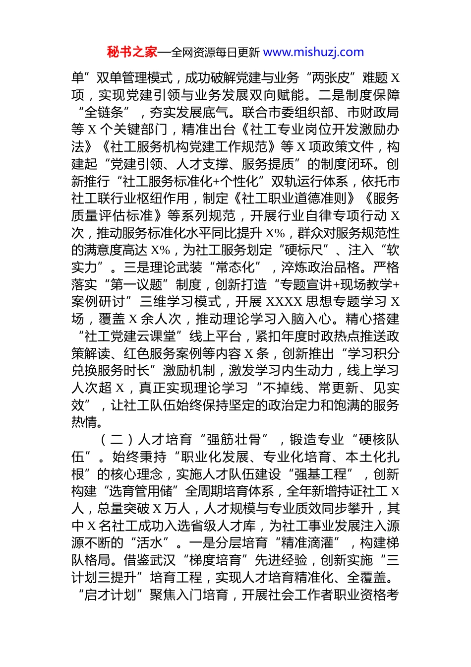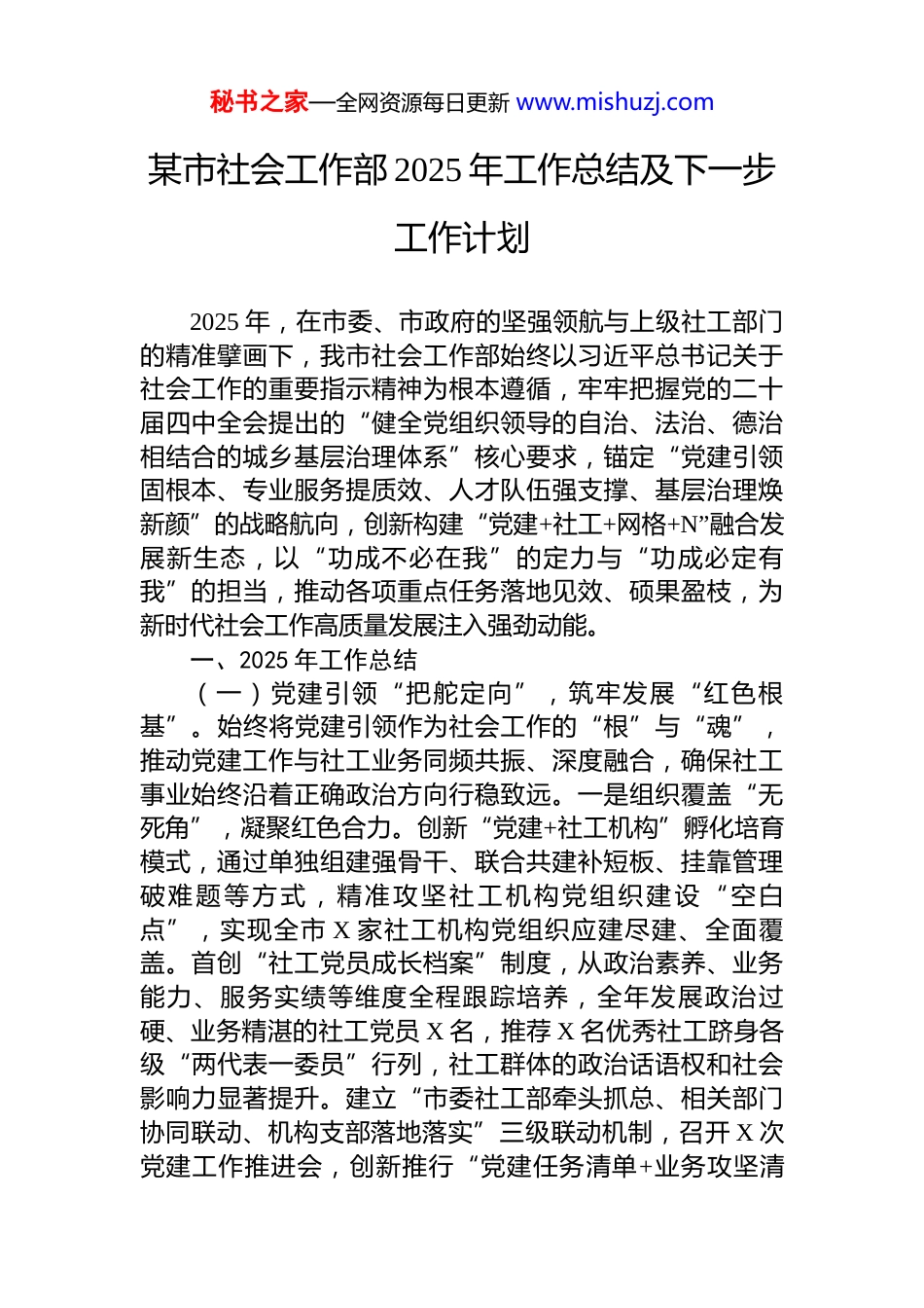 秘书之家—全网资源每日更新 www.mishuzj.com某市社会工作部 2025 年工作总结及下一步工作计划2025 年,在市委、市政府的坚强领航与上级社工部门的精准擘画下,我市社会工作部始终以习近平总书记关于社会工作的重要指示精神为根本遵循,牢牢把握党的二十届四中全会提出的“健全党组织领导的自治、法治、德治相结合的城乡基层治理体系”核心要求,锚定“党建引领固根本、专业服务提质效、人才队伍强支撑、基层治理焕新颜”的战略航向,创新构建“党建+社工+网格+N”融合发展新生态,以“功成不必在我”的定力与“功成必定有我”的担当,推动各项重点任务落地见效、硕果盈枝,为新时代社会工作高质量发展注入强劲动能。一、2025 年工作总结(一)党建引领“把舵定向”,筑牢发展“红色根基”。始终将党建引领作为社会工作的“根”与“魂”,推动党建工作与社工业务同频共振、深度融合,确保社工事业始终沿着正确政治方向行稳致远。一是组织覆盖“无死角”,凝聚红色合力。创新“党建+社工机构”孵化培育模式,通过单独组建强骨干、联合共建补短板、挂靠管理破难题等方式,精准攻坚社工机构党组织建设“空白点”,实现全市 X 家社工机构党组织应建尽建、全面覆盖。首创“社工党员成长档案”制度,从政治素养、业务能力、服务实绩等维度全程跟踪培养,全年发展政治过硬、业务精湛的社工党员 X 名,推荐 X 名优秀社工跻身各级“两代表一委员”行列,社工群体的政治话语权和社会影响力显著提升。建立“市委社工部牵头抓总、相关部门协同联动、机构支部落地落实”三级联动机制,召开 X 次党建工作推进会,创新推行“党建任务清单+业务攻坚清秘书之家—全网资源每日更新 www.mishuzj.com单”双单管理模式,成功破解党建与业务“两张皮”难题 X项,实现党建引领与业务发展双向赋能。二是制度保障“全链条”,夯实发展底气。联合市委组织部、市财政局等 X 个关键部门,精准出台《社工专业岗位开发激励办法》《社工服务机构党建工作规范》等 X 项政策文件,构建起“党建引领、人才支撑、服务提质”的制度闭环。创新推行“社工服务标准化+个性化”双轨运行体系,依托市社工联行业枢纽作用,制定《社工职业道德准则》《服务质量评估标准》等系列规范,开展行业自律专项行动 X次,推动服务标准化水平同比提升 X%,群众对服务规范性的满意度高达 X%,为社工服务划定“硬标尺”、注入“软实力”。三是理论武装“常态化”,淬炼政治品格。严格落实“第一议题”制度,创新打造“专题宣讲+现场教学+案例研讨”三维学习模式,开展 XXXX 思想专题学习 X场,覆盖 X 余人次,推动理论学习入脑入心。精心搭建“社工党建云课堂”线上平台,紧扣年度时政热点推送政策解读、红色服务案例等内容 X 条,创新推出“学习积分兑换服务时长”激励机制,激发学习内生动力,线上学习人次超 X,真正实现理论学习“不掉线、常更新、见实效”,让社工队伍始终保持坚定的政治定力和饱满的服务热情。(二)人才培育“强筋壮骨”,锻造专业“硬核队伍”。始终秉持“职业化发展、专业化培育、本土化扎根”的核心理念,实施人才队伍建设“强基工程”,创新构建“选育管用储”全周期培育体系,全年新增持证社工 X人,总量突破 X 万人,人才规模与专业质效同步攀升,其中 X 名社工成功入选省级人才库,为社工事业发展注入源源不断的“活水”。一是分层培育“精准滴灌”,构建梯队格局。借鉴武汉“梯度培育”先进经验,创新实施“三计划三提升”培育工程,实现人才培育精准化、全覆盖。“启才计划”聚焦入门培育,开展社会工作者职业资格考秘书之家—全网资源每日更新 www.mishuzj.com试考前培训 X 期,参训 X 万人次,创新“名师授课+模拟刷题+一对一辅导”备考模式,推动取证率提升 X%,为社工队伍储备充足“新鲜血液”;“菁英计划”聚焦骨干锻造,以 X 个实战服务项目为载体,通过“项目实操+难题攻坚”培育骨干社工 X 人,筑牢队伍“中坚力量”;“英才计划”聚焦领军打造,严格评选市级领军社工人才 X 名,其中 X 人获评“省和谐使者”,树立行业标杆。组建 X 人专家督...