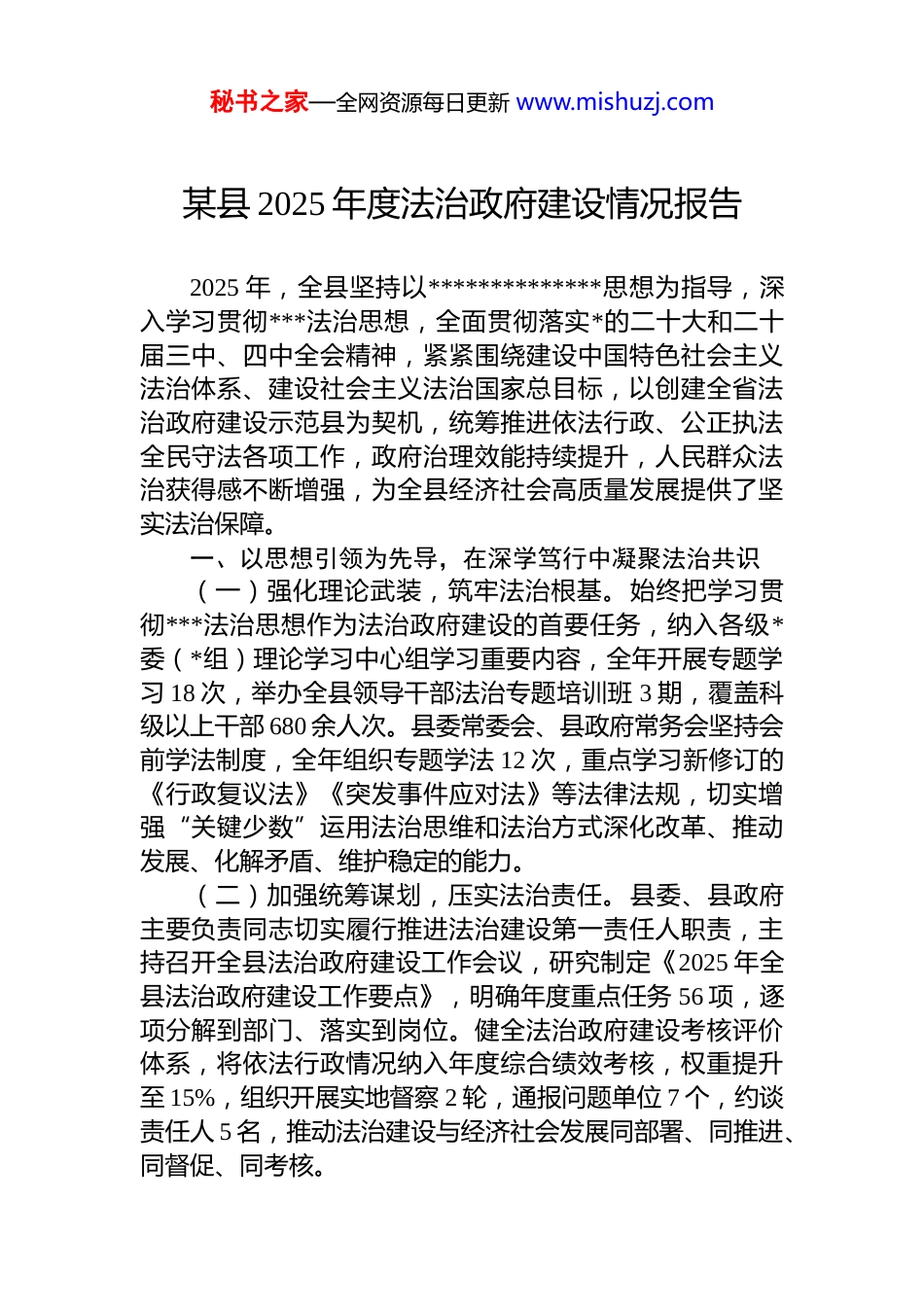 秘书之家—全网资源每日更新 www.mishuzj.com某县 2025 年度法治政府建设情况报告2025 年,全县坚持以**************思想为指导,深入学习贯彻***法治思想,全面贯彻落实*的二十大和二十届三中、四中全会精神,紧紧围绕建设中国特色社会主义法治体系、建设社会主义法治国家总目标,以创建全省法治政府建设示范县为契机,统筹推进依法行政、公正执法全民守法各项工作,政府治理效能持续提升,人民群众法治获得感不断增强,为全县经济社会高质量发展提供了坚实法治保障。一、以思想引领为先导,在深学笃行中凝聚法治共识(一)强化理论武装,筑牢法治根基。始终把学习贯彻***法治思想作为法治政府建设的首要任务,纳入各级*委(*组)理论学习中心组学习重要内容,全年开展专题学习 18 次,举办全县领导干部法治专题培训班 3 期,覆盖科级以上干部 680 余人次。县委常委会、县政府常务会坚持会前学法制度,全年组织专题学法 12 次,重点学习新修订的《行政复议法》《突发事件应对法》等法律法规,切实增强“关键少数”运用法治思维和法治方式深化改革、推动发展、化解矛盾、维护稳定的能力。(二)加强统筹谋划,压实法治责任。县委、县政府主要负责同志切实履行推进法治建设第一责任人职责,主持召开全县法治政府建设工作会议,研究制定《2025 年全县法治政府建设工作要点》,明确年度重点任务 56 项,逐项分解到部门、落实到岗位。健全法治政府建设考核评价体系,将依法行政情况纳入年度综合绩效考核,权重提升至 15%,组织开展实地督察 2 轮,通报问题单位 7 个,约谈责任人 5 名,推动法治建设与经济社会发展同部署、同推进、同督促、同考核。秘书之家—全网资源每日更新 www.mishuzj.com(三)厚植法治文化,营造浓厚氛围。制定实施“八五”普法规划中期评估方案,深入开展“法律七进”活动打造“法治夜市”“乡村大喇叭·说法”等特色普法品牌。建成县级法治文化公园 1 个、乡镇法治广场 12 个,村(社区)法治宣传栏实现全覆盖。组织“以案释法”宣讲团深入基层开展巡回讲座 43 场,惠及群众 3.6 万人次。政务新媒体开设“每日一法”专栏,发布普法短视频 280 余条,总播放量突破 800 万次,全社会尊法学法守法用法的氛围日益浓厚。二、以制度建设为抓手,在规范运行中提升治理效能(一)健全依法决策机制。严格执行《重大行政决策程序暂行条例》,修订完善本县重大行政决策事项目录管理办法,全年确定重大行政决策事项 9 项,均严格落实公众参与、专家论证、风险评估、合法性审查、集体讨论决定等法定程序。县司法局全程参与政府常务会议议题合法性审查,全年出具法律意见书 76 份,否决不合规议题 3 个,确保政府决策于法有据、程序正当、过程公开、责任明确。(二)强化规范性文件管理。坚持“立改废释”并举,对 2024 年底前出台的 137 件行政规范性文件进行全面清理,宣布失效 23 件、修订 15 件。严格落实规范性文件统一登记、统一编号、统一公布“三统一”制度,全年制定发布规范性文件 8 件,备案率、及时率均达 100%。探索开展文件实施后评估工作,选取涉及营商环境、民生保障领域的 5 件文件进行专项评估,提出改进建议 12 条,推动制度设计更接地气、更具实效。(三)深化行政执法改革。持续推进综合行政执法体制改革,聚焦市场监管、生态环境、交通运输、农业、文化市场等领域,优化执法队伍结构,推动执法力量下沉。全面推行行政执法“三项制度”,全县 32 个执法单位全部建立执法公示平台,配备执法记录仪 860 台,重大执法决定法制审核率达 100%。组织开展执法案卷评查 3 次,抽查案秘书之家—全网资源每日更新 www.mishuzj.com卷 240 卷,整改问题 67 个。创新开展“伴随式”执法监督,邀请人大代表、政协委员现场见证执法过程 12 次,有效提升执法公信力。三、以服务民生为追求,在便民利企中彰显法治温度(一)打造高效政务服务环境。深化“放管服”改革,全面推进“一网通办”“跨省通办”“一件事一次办”,县级政务服务事项网上可办率达 98.7%,全程网办率达92.3%。推行告知承诺...