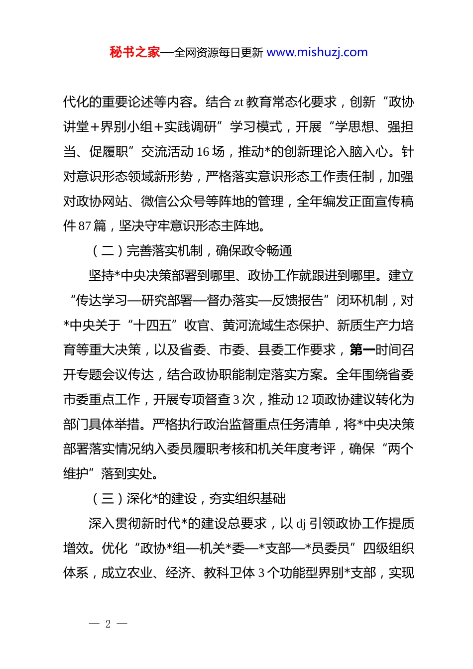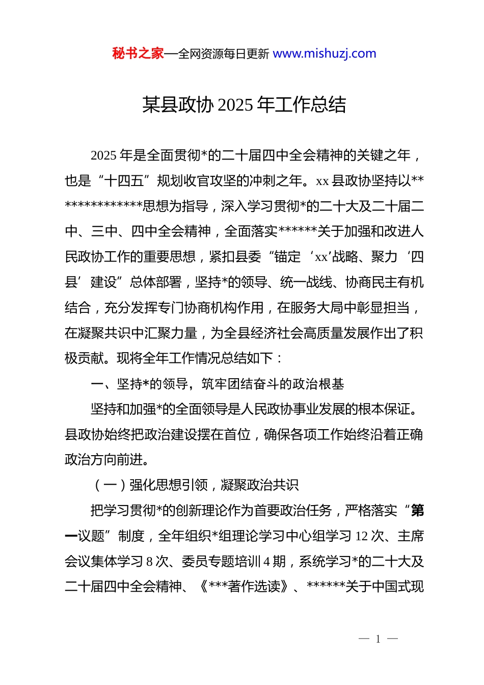 秘书之家—全网资源每日更新 www.mishuzj.com某县政协 2025 年工作总结2025 年是全面贯彻*的二十届四中全会精神的关键之年,也是“十四五”规划收官攻坚的冲刺之年。xx 县政协坚持以**************思想为指导,深入学习贯彻*的二十大及二十届二中、三中、四中全会精神,全面落实******关于加强和改进人民政协工作的重要思想,紧扣县委“锚定‘xx’战略、聚力‘四县’建设”总体部署,坚持*的领导、统一战线、协商民主有机结合,充分发挥专门协商机构作用,在服务大局中彰显担当,在凝聚共识中汇聚力量,为全县经济社会高质量发展作出了积极贡献。现将全年工作情况总结如下:一、坚持*的领导,筑牢团结奋斗的政治根基坚持和加强*的全面领导是人民政协事业发展的根本保证。县政协始终把政治建设摆在首位,确保各项工作始终沿着正确政治方向前进。(一)强化思想引领,凝聚政治共识把学习贯彻*的创新理论作为首要政治任务,严格落实“第一议题”制度,全年组织*组理论学习中心组学习 12 次、主席会议集体学习 8 次、委员专题培训 4 期,系统学习*的二十大及二十届四中全会精神、《***著作选读》、******关于中国式现— 1 —秘书之家—全网资源每日更新 www.mishuzj.com代化的重要论述等内容。结合 zt 教育常态化要求,创新“政协讲堂+界别小组+实践调研”学习模式,开展“学思想、强担当、促履职”交流活动 16 场,推动*的创新理论入脑入心。针对意识形态领域新形势,严格落实意识形态工作责任制,加强对政协网站、微信公众号等阵地的管理,全年编发正面宣传稿件 87 篇,坚决守牢意识形态主阵地。(二)完善落实机制,确保政令畅通坚持*中央决策部署到哪里、政协工作就跟进到哪里。建立“传达学习—研究部署—督办落实—反馈报告”闭环机制,对*中央关于“十四五”收官、黄河流域生态保护、新质生产力培育等重大决策,以及省委、市委、县委工作要求,第一时间召开专题会议传达,结合政协职能制定落实方案。全年围绕省委市委重点工作,开展专项督查 3 次,推动 12 项政协建议转化为部门具体举措。严格执行政治监督重点任务清单,将*中央决策部署落实情况纳入委员履职考核和机关年度考评,确保“两个维护”落到实处。(三)深化*的建设,夯实组织基础深入贯彻新时代*的建设总要求,以 dj 引领政协工作提质增效。优化“政协*组—机关*委—*支部—*员委员”四级组织体系,成立农业、经济、教科卫体 3 个功能型界别*支部,实现— 2 —秘书之家—全网资源每日更新 www.mishuzj.com*的组织对*员委员全覆盖、*的工作对政协委员全覆盖。严格落实民主集中制,修订《县政协*组议事规则》《主席会议工作规则》,全年召开*组会议 21 次、主席会议 10 次,研究重大事项43 项,做到科学决策、民主决策。加强*风廉政建设,召开警示教育大会 3 次,组织观看《永远吹冲锋号》等专题片,开展“以案促改”专题研讨 6 次,推动全面从严治*向纵深发展。二、聚焦主责主业,彰显专门协商机构的担当作为县政协立足“协商民主重要渠道和专门协商机构”定位,紧扣全县中心工作,精选协商议题,深入调查研究,积极建言资政,推动政协工作从“做了什么”向“做成了什么”“做出了什么效果”转变。(一)围绕高质量发展,精准建言献策坚持把服务“十四五”规划收官作为履职主线,聚焦“新质生产力培育”“现代化产业体系构建”等重点任务开展协商议政。一是助力产业转型升级。针对全县传统农业占比高、新兴产业规模小的短板,组织经济界、农业界委员开展“因地制宜发展新质生产力”专题调研,深入 xx 农业产业园、xx 新能源企业等 18 家单位实地考察,形成《关于推动 xx 特色产业向“智造”“绿造”转型的建议案》。提出“打造小杂粮全产业链数— 3 —秘书之家—全网资源每日更新 www.mishuzj.com字化平台”“建设光伏+生态修复示范项目”等 6 条具体建议,其中“小杂粮电商直播基地”项目已落地,带动 12 个村集体年增收超 20 万元。二是助推项目建设攻坚。围绕“项目为王”要求,对全县15 个省市重点项目开展“全周期协商监督”,重点关注资金使用、施工...