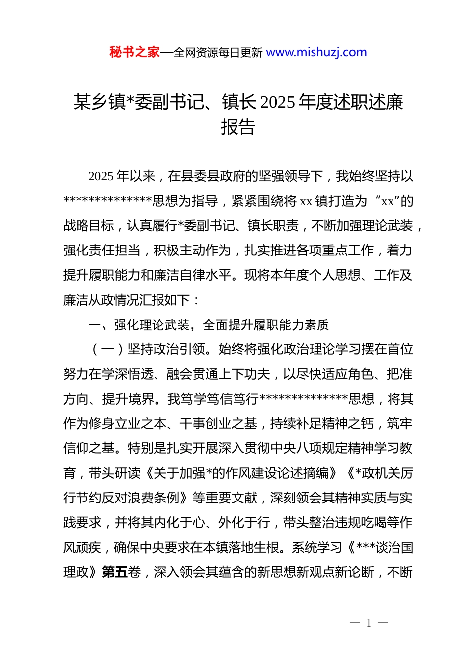 秘书之家—全网资源每日更新 www.mishuzj.com某乡镇*委副书记、镇长 2025 年度述职述廉报告2025 年以来,在县委县政府的坚强领导下,我始终坚持以**************思想为指导,紧紧围绕将 xx 镇打造为“xx”的战略目标,认真履行*委副书记、镇长职责,不断加强理论武装,强化责任担当,积极主动作为,扎实推进各项重点工作,着力提升履职能力和廉洁自律水平。现将本年度个人思想、工作及廉洁从政情况汇报如下:一、强化理论武装,全面提升履职能力素质(一)坚持政治引领。始终将强化政治理论学习摆在首位努力在学深悟透、融会贯通上下功夫,以尽快适应角色、把准方向、提升境界。我笃学笃信笃行**************思想,将其作为修身立业之本、干事创业之基,持续补足精神之钙,筑牢信仰之基。特别是扎实开展深入贯彻中央八项规定精神学习教育,带头研读《关于加强*的作风建设论述摘编》《*政机关厉行节约反对浪费条例》等重要文献,深刻领会其精神实质与实践要求,并将其内化于心、外化于行,带头整治违规吃喝等作风顽疾,确保中央要求在本镇落地生根。系统学习《***谈治国理政》第五卷,深入领会其蕴含的新思想新观点新论断,不断— 1 —秘书之家—全网资源每日更新 www.mishuzj.com提升政治判断力、政治领悟力、政治执行力。高度重视并深入传达学习*的二十届四中全会精神,组织专题学习研讨,引导全镇干部深刻理解*中央的重大决策部署,自觉在思想上政治上行动上同以***同志为核心的*中央保持高度一致。年内牵头组织现场教学 x 次、*课宣讲 x 场,全面完成规定书目学习,有效拓宽战略视野,夯实履职尽责的思想理论基础。(二)深化政策研究。紧密结合 xx 镇发展实际,将学习重心聚焦于推动镇域经济社会高质量发展的具体实践。持续强化对中央、省、市关于镇域经济突破性发展、小城镇品质提升、dj 引领基层治理“三治融合”、全面推进乡村振兴等重大决策部署和重要政策论述的学习研究,坚持读原著、学原文、悟原理,力求准确把握政策精髓和导向。在学习中,注重做好“结合”文章,关注宏观政策导向,着力思考如何将上级精神转化为符合 xx 实际的发展思路、工作举措和具体项目,将学习成果切实落实到政府工作的谋划、部署、推进、考核等各个方面、各个环节和全过程。通过持续深入的学习思考和实践探索,我效提升运用政策理论指导具体工作、破解发展难题、服务人民群众的能力水平,努力使各项决策和工作部署更接地气、更富成效。(三)恪守法治原则。认真完成领导干部学法用法的各项— 2 —秘书之家—全网资源每日更新 www.mishuzj.com规定任务,积极参加年度法治考试并取得合格成绩。在日常工作中,坚持依法决策,坚持组织法律专家或顾问对镇级规范性文件、重要合同协议、关键工作程序进行合法性审查和研讨,确保各项决策部署于法有据、程序合规。带头学习与群众生产生活息息相关的《民法典》等法律法规,增强运用法治思维和法治方式深化改革、推动发展、化解矛盾、维护稳定的能力,确保政府行为言必有据、行必依法。坚持督促全体机关干部充分利用学法用法平台进行学习,常态化开展法治教育培训,不断增强全镇干部职工的法治意识和法治素养,推动形成办事依法、遇事找法、解决问题用法、化解矛盾靠法的良好环境,为全镇经济社会发展提供坚实的法治保障。(四)守好意识形态主阵地。积极学习领会******关于意识形态工作的重要论述,深刻认识意识形态工作的极端重要性,切实履行好意识形态工作责任。定期组织分析研判本地区意识形态领域态势,加强对政府门户网站、微信公众号等宣传阵地的管理,定期更新信息内容,及时清理不合规的网络工作群组,确保各类宣传文化阵地可管可控,始终弘扬主旋律,传播正能量,牢牢掌握意识形态工作的领导权、管理权、话语权,为全镇改革发展稳定营造了健康向上的思想舆论氛围。二、始终牢记宗旨,勤政务实践行使命担当— 3 —秘书之家—全网资源每日更新 www.mishuzj.com始终将“为官一任、造福一方”作为根本追求,迅速转变角色定位,聚焦发展要务,恪守为民初心,全力推动经济社会高质量发展,以实干实绩践行岗位使命。(一)聚...