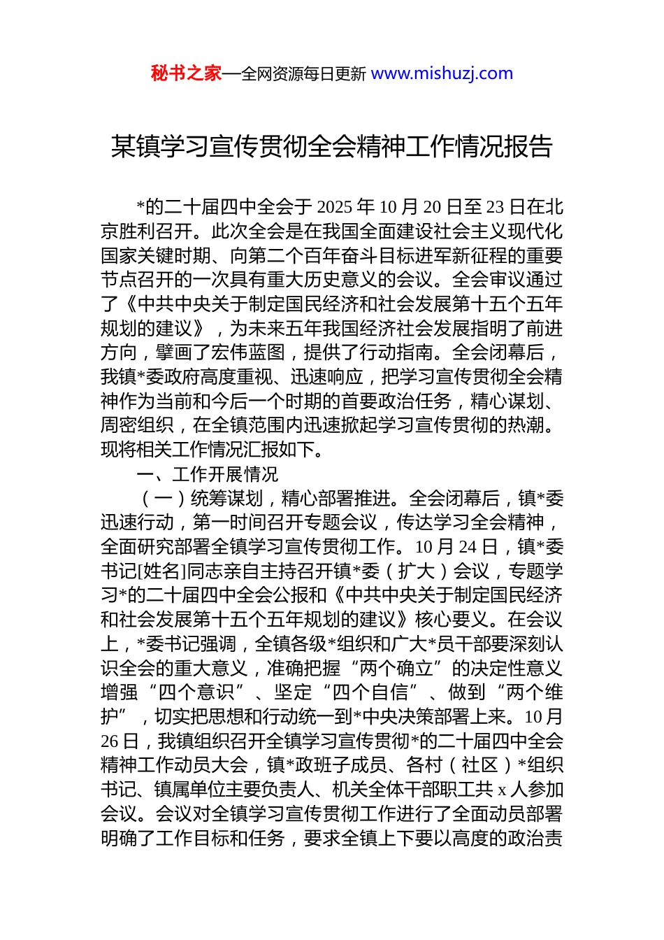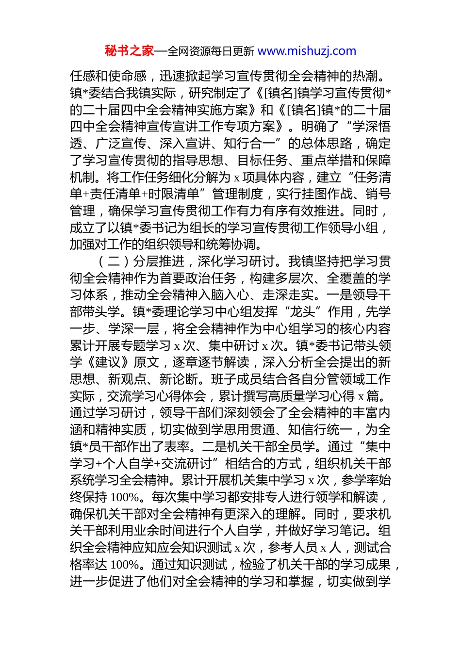 秘书之家—全网资源每日更新 www.mishuzj.com某镇学习宣传贯彻全会精神工作情况报告*的二十届四中全会于 2025 年 10 月 20 日至 23 日在北京胜利召开。此次全会是在我国全面建设社会主义现代化国家关键时期、向第二个百年奋斗目标进军新征程的重要节点召开的一次具有重大历史意义的会议。全会审议通过了《中共中央关于制定国民经济和社会发展第十五个五年规划的建议》,为未来五年我国经济社会发展指明了前进方向,擘画了宏伟蓝图,提供了行动指南。全会闭幕后,我镇*委政府高度重视、迅速响应,把学习宣传贯彻全会精神作为当前和今后一个时期的首要政治任务,精心谋划、周密组织,在全镇范围内迅速掀起学习宣传贯彻的热潮。现将相关工作情况汇报如下。一、工作开展情况(一)统筹谋划,精心部署推进。全会闭幕后,镇*委迅速行动,第一时间召开专题会议,传达学习全会精神,全面研究部署全镇学习宣传贯彻工作。10 月 24 日,镇*委书记[姓名]同志亲自主持召开镇*委(扩大)会议,专题学习*的二十届四中全会公报和《中共中央关于制定国民经济和社会发展第十五个五年规划的建议》核心要义。在会议上,*委书记强调,全镇各级*组织和广大*员干部要深刻认识全会的重大意义,准确把握“两个确立”的决定性意义增强“四个意识”、坚定“四个自信”、做到“两个维护”,切实把思想和行动统一到*中央决策部署上来。10 月26 日,我镇组织召开全镇学习宣传贯彻*的二十届四中全会精神工作动员大会,镇*政班子成员、各村(社区)*组织书记、镇属单位主要负责人、机关全体干部职工共 x 人参加会议。会议对全镇学习宣传贯彻工作进行了全面动员部署明确了工作目标和任务,要求全镇上下要以高度的政治责秘书之家—全网资源每日更新 www.mishuzj.com任感和使命感,迅速掀起学习宣传贯彻全会精神的热潮。镇*委结合我镇实际,研究制定了《[镇名]镇学习宣传贯彻*的二十届四中全会精神实施方案》和《[镇名]镇*的二十届四中全会精神宣传宣讲工作专项方案》。明确了“学深悟透、广泛宣传、深入宣讲、知行合一”的总体思路,确定了学习宣传贯彻的指导思想、目标任务、重点举措和保障机制。将工作任务细化分解为 x 项具体内容,建立“任务清单+责任清单+时限清单”管理制度,实行挂图作战、销号管理,确保学习宣传贯彻工作有力有序有效推进。同时,成立了以镇*委书记为组长的学习宣传贯彻工作领导小组,加强对工作的组织领导和统筹协调。(二)分层推进,深化学习研讨。我镇坚持把学习贯彻全会精神作为首要政治任务,构建多层次、全覆盖的学习体系,推动全会精神入脑入心、走深走实。一是领导干部带头学。镇*委理论学习中心组发挥“龙头”作用,先学一步、学深一层,将全会精神作为中心组学习的核心内容累计开展专题学习 x 次、集中研讨 x 次。镇*委书记带头领学《建议》原文,逐章逐节解读,深入分析全会提出的新思想、新观点、新论断。班子成员结合各自分管领域工作实际,交流学习心得体会,累计撰写高质量学习心得 x 篇。通过学习研讨,领导干部们深刻领会了全会精神的丰富内涵和精神实质,切实做到学思用贯通、知信行统一,为全镇*员干部作出了表率。二是机关干部全员学。通过“集中学习+个人自学+交流研讨”相结合的方式,组织机关干部系统学习全会精神。累计开展机关集中学习 x 次,参学率始终保持 100%。每次集中学习都安排专人进行领学和解读,确保机关干部对全会精神有更深入的理解。同时,要求机关干部利用业余时间进行个人自学,并做好学习笔记。组织全会精神应知应会知识测试 x 次,参考人员 x 人,测试合格率达 100%。通过知识测试,检验了机关干部的学习成果,进一步促进了他们对全会精神的学习和掌握,切实做到学秘书之家—全网资源每日更新 www.mishuzj.com有所获、学有所成。三是基层*员广泛学。各村(社区)*组织充分发挥基层*组织的战斗堡垒作用,通过“三会一课”、主题*日等形式,组织广大基层*员学习全会精神。累计开展基层*组织集中学习 x 场次,参与*员达 x 余人次。部分村(社区)还邀请了镇*委班子成员或*校教师到村(社区)进行专题辅导讲座...