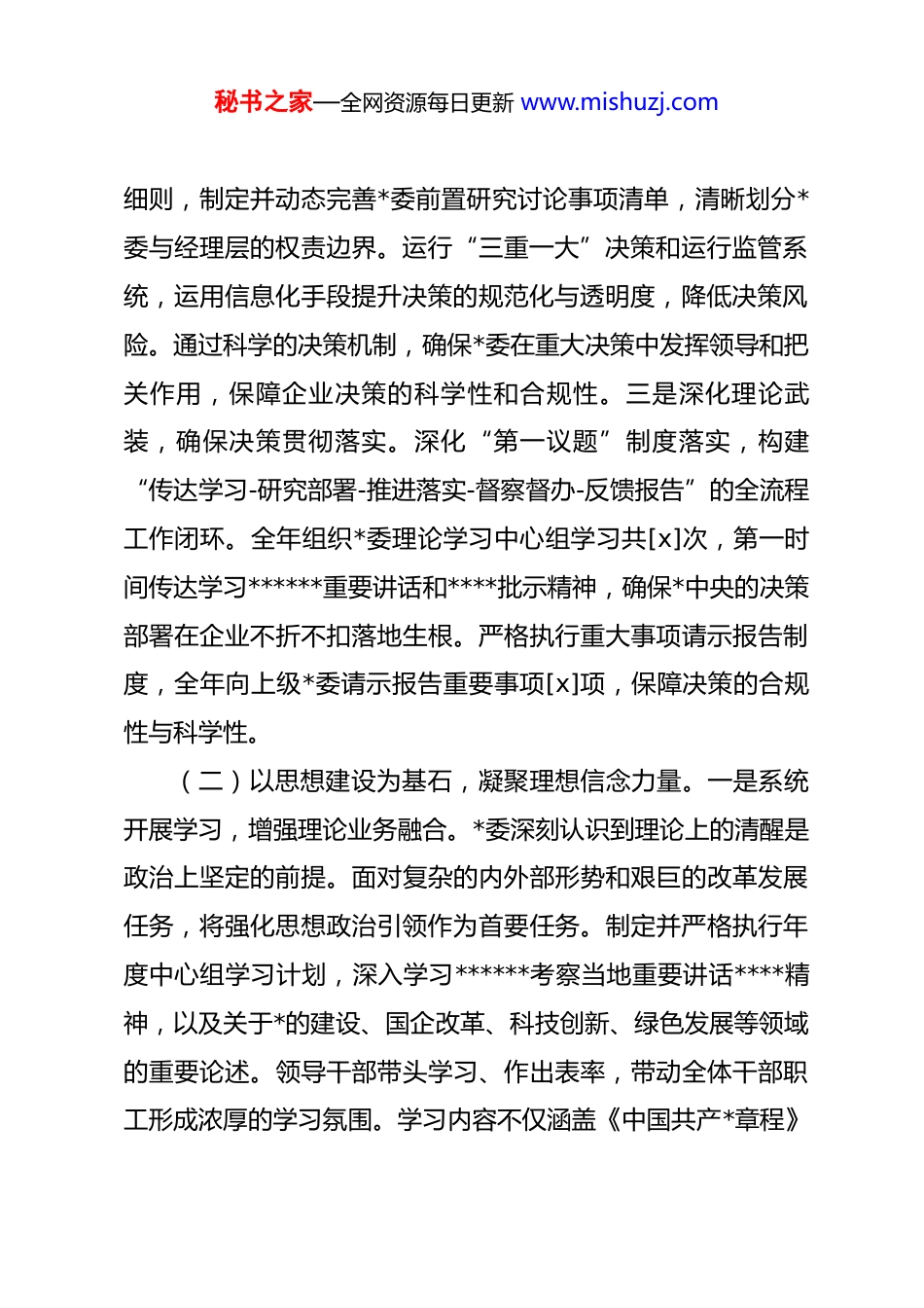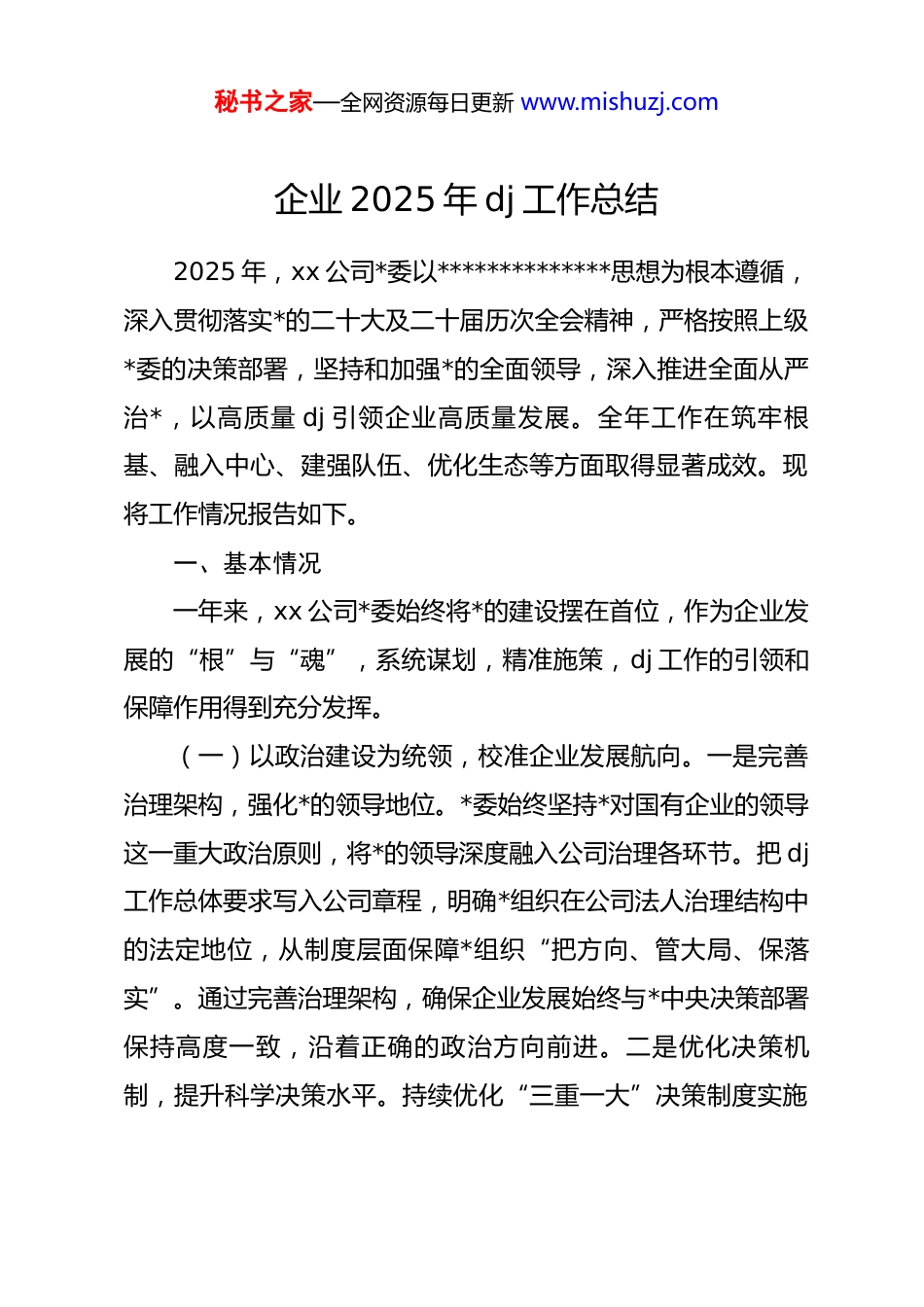 秘书之家—全网资源每日更新 www.mishuzj.com企业 2025 年 dj 工作总结2025 年,xx 公司*委以**************思想为根本遵循,深入贯彻落实*的二十大及二十届历次全会精神,严格按照上级*委的决策部署,坚持和加强*的全面领导,深入推进全面从严治*,以高质量 dj 引领企业高质量发展。全年工作在筑牢根基、融入中心、建强队伍、优化生态等方面取得显著成效。现将工作情况报告如下。一、基本情况一年来,xx 公司*委始终将*的建设摆在首位,作为企业发展的“根”与“魂”,系统谋划,精准施策,dj 工作的引领和保障作用得到充分发挥。(一)以政治建设为统领,校准企业发展航向。一是完善治理架构,强化*的领导地位。*委始终坚持*对国有企业的领导这一重大政治原则,将*的领导深度融入公司治理各环节。把 dj工作总体要求写入公司章程,明确*组织在公司法人治理结构中的法定地位,从制度层面保障*组织“把方向、管大局、保落实”。通过完善治理架构,确保企业发展始终与*中央决策部署保持高度一致,沿着正确的政治方向前进。二是优化决策机制,提升科学决策水平。持续优化“三重一大”决策制度实施秘书之家—全网资源每日更新 www.mishuzj.com细则,制定并动态完善*委前置研究讨论事项清单,清晰划分*委与经理层的权责边界。运行“三重一大”决策和运行监管系统,运用信息化手段提升决策的规范化与透明度,降低决策风险。通过科学的决策机制,确保*委在重大决策中发挥领导和把关作用,保障企业决策的科学性和合规性。三是深化理论武装,确保决策贯彻落实。深化“第一议题”制度落实,构建“传达学习-研究部署-推进落实-督察督办-反馈报告”的全流程工作闭环。全年组织*委理论学习中心组学习共[x]次,第一时间传达学习******重要讲话和****批示精神,确保*中央的决策部署在企业不折不扣落地生根。严格执行重大事项请示报告制度,全年向上级*委请示报告重要事项[x]项,保障决策的合规性与科学性。(二)以思想建设为基石,凝聚理想信念力量。一是系统开展学习,增强理论业务融合。*委深刻认识到理论上的清醒是政治上坚定的前提。面对复杂的内外部形势和艰巨的改革发展任务,将强化思想政治引领作为首要任务。制定并严格执行年度中心组学习计划,深入学习******考察当地重要讲话****精神,以及关于*的建设、国企改革、科技创新、绿色发展等领域的重要论述。领导干部带头学习、作出表率,带动全体干部职工形成浓厚的学习氛围。学习内容不仅涵盖《中国共产*章程》秘书之家—全网资源每日更新 www.mishuzj.com《中国共产*廉洁自律准则》等 dj*规,还包括《企业安全生产规范》《行业技术标准》等专业法规,实现 dj 理论与业务知识的有机融合。二是常态宣传引导,掌握意识形态主动。扎实开展形势任务教育,深入践行“[特色活动名称]”活动,全面落实*支部联系点制度。领导班子成员全年深入基层联系点[x]次,宣讲政策、倾听呼声、解决实际困难[x]余项。压紧压实意识形态工作责任制,强化网络舆情监控和信访维稳工作,牢牢掌握意识形态工作的主动权。通过常态化的宣传引导,统一员工思想,凝聚发展共识。三是立体塑造形象,展示企业良好风貌。围绕中心工作,大力宣传在安全生产、技术创新、经营管理等方面的经验做法和先进典型。全年对内发布宣传稿件[x]篇,对外在主流媒体发稿[x]篇,有效凝聚了内部人心,提振了员工士气,向社会展示了良好的企业形象。通过立体化的宣传,提升企业的知名度和美誉度,为企业发展营造良好的外部环境。(三)以组织建设为支撑,筑牢基层战斗堡垒。一是打造特色品牌,促进 dj 业务融合。创立“[品牌名称]先锋”dj 品牌,以品牌建设引领 dj 与生产经营深度融合。确立《“dj+创新”驱动企业高质量发展》重点创建项目,由*委书记亲自挂帅,明确 dj 理念、创建措施与目标成效,通过 dj 工作例会等机制强力推进,确保任务落地见效。通过特色 dj 品牌的打造,激秘书之家—全网资源每日更新 www.mishuzj.com发基层*组织的活力和创造力,推动企业各项工作的开展。二是提升支部水平,加强基层组织建设。实施 dj 工作规范提升专项行动,聚焦政...