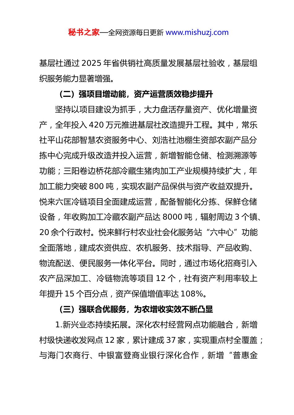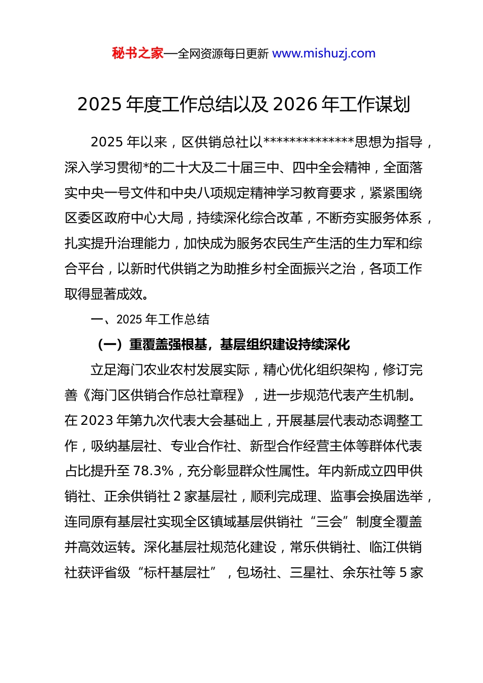 秘书之家—全网资源每日更新 www.mishuzj.com2025 年度工作总结以及 2026 年工作谋划2025 年以来,区供销总社以**************思想为指导,深入学习贯彻*的二十大及二十届三中、四中全会精神,全面落实中央一号文件和中央八项规定精神学习教育要求,紧紧围绕区委区政府中心大局,持续深化综合改革,不断夯实服务体系,扎实提升治理能力,加快成为服务农民生产生活的生力军和综合平台,以新时代供销之为助推乡村全面振兴之治,各项工作取得显著成效。一、2025 年工作总结(一)重覆盖强根基,基层组织建设持续深化立足海门农业农村发展实际,精心优化组织架构,修订完善《海门区供销合作总社章程》,进一步规范代表产生机制。在 2023 年第九次代表大会基础上,开展基层代表动态调整工作,吸纳基层社、专业合作社、新型合作经营主体等群体代表占比提升至 78.3%,充分彰显群众性属性。年内新成立四甲供销社、正余供销社 2 家基层社,顺利完成理、监事会换届选举,连同原有基层社实现全区镇域基层供销社“三会”制度全覆盖并高效运转。深化基层社规范化建设,常乐供销社、临江供销社获评省级“标杆基层社”,包场社、三星社、余东社等 5 家秘书之家—全网资源每日更新 www.mishuzj.com基层社通过 2025 年省供销社高质量发展基层社验收,基层组织服务能力显著增强。(二)强项目增动能,资产运营质效稳步提升坚持以项目建设为抓手,大力盘活存量资产、优化增量资产,全年投入 420 万元推进基层社改造提升工程。其中,常乐社平山花部智慧农资服务中心、刘浩社池棚生资部农副产品分拣中心完成升级改造并投入运营,新增智能仓储、检测溯源等功能;三阳卷边桥花部冷藏生猪肉加工产业规模持续扩大,年加工能力突破 800 吨,实现农副产品保供与资产收益双提升。悦来六匡冷链项目全面建成运营,配备智能化分拣、保鲜仓储设备,年收购加工冷藏农副产品达 8000 吨,辐射周边 3 个镇、20 余个行政村。悦来鲜行村农业社会化服务站“六中心”功能全面落地,建成农资供应、农机服务、技术指导、产品收购、物流配送、便民服务一体化平台。同时,通过市场化招商引入农产品深加工、冷链物流等项目 12 个,社有资产利用率较上年提升 15 个百分点,资产保值增值率达 108%。(三)强联合优服务,为农增收实效不断凸显1.新兴业态持续拓展。深化农村经营网点功能融合,新增村级快递收发网点 12 家,累计建成 37 家,实现重点村全覆盖;与海门农商行、中银富登商业银行深化合作,新增“普惠金秘书之家—全网资源每日更新 www.mishuzj.com融”服务网点 15 家,累计达 24 家,提供政务代办、金融咨询、信贷对接等 240 余项服务。联合区委宣传部、区农业农村局等部门举办“南通市‘叠石桥杯’第三届网络直播大赛”,培育本土供销主播 32 名,开展助农直播 216 场,带动农产品网销额达 1800 万元。全年创办专业合作社 8 家,提档升级农村综合服务社 23 家,其中 12 家获评省级星级综合服务社。2.展示展销成果丰硕。组织海门山羊、海门大米、万年香沙芋等优特农产品,先后参与“率鲜进沪”2025 南通名优农产品上海展示展销会、长三角供销社展销会、江苏农产品交易会等大型展会 11 场,现场销售额达 3200 万元,签订购销订单额超 1.8 亿元,进一步扩大海门特色农产品品牌影响力。与上海浦东新区供销社达成战略合作,设立海门农产品上海直销中心 3 个,实现“海门优品”直供上海社区,年销售额突破5000 万元。3.绿色服务全面升级。优化调整农药包装废弃物(农膜)回收处置体系,新增区级运营中心 1 个、区镇回收站 6 个、村级回收点 45 个,累计建成区级运营中心 2 个、区镇回收站 30个、村级回收点 276 个,农药零差率配供点达 62 个,8 个区镇成功创建省级示范站点。全年回收处置农药包装废弃物 786万件,回收废旧地膜 1680 吨(毛重),完成农药零差率配供秘书之家—全网资源每日更新 www.mishuzj.com销售 1560 万元,超额完成年度目标任务。发挥嘉原农资主渠道作用,储备各类农资 2.8 万吨,保障农业生产需求,推广绿色防...
