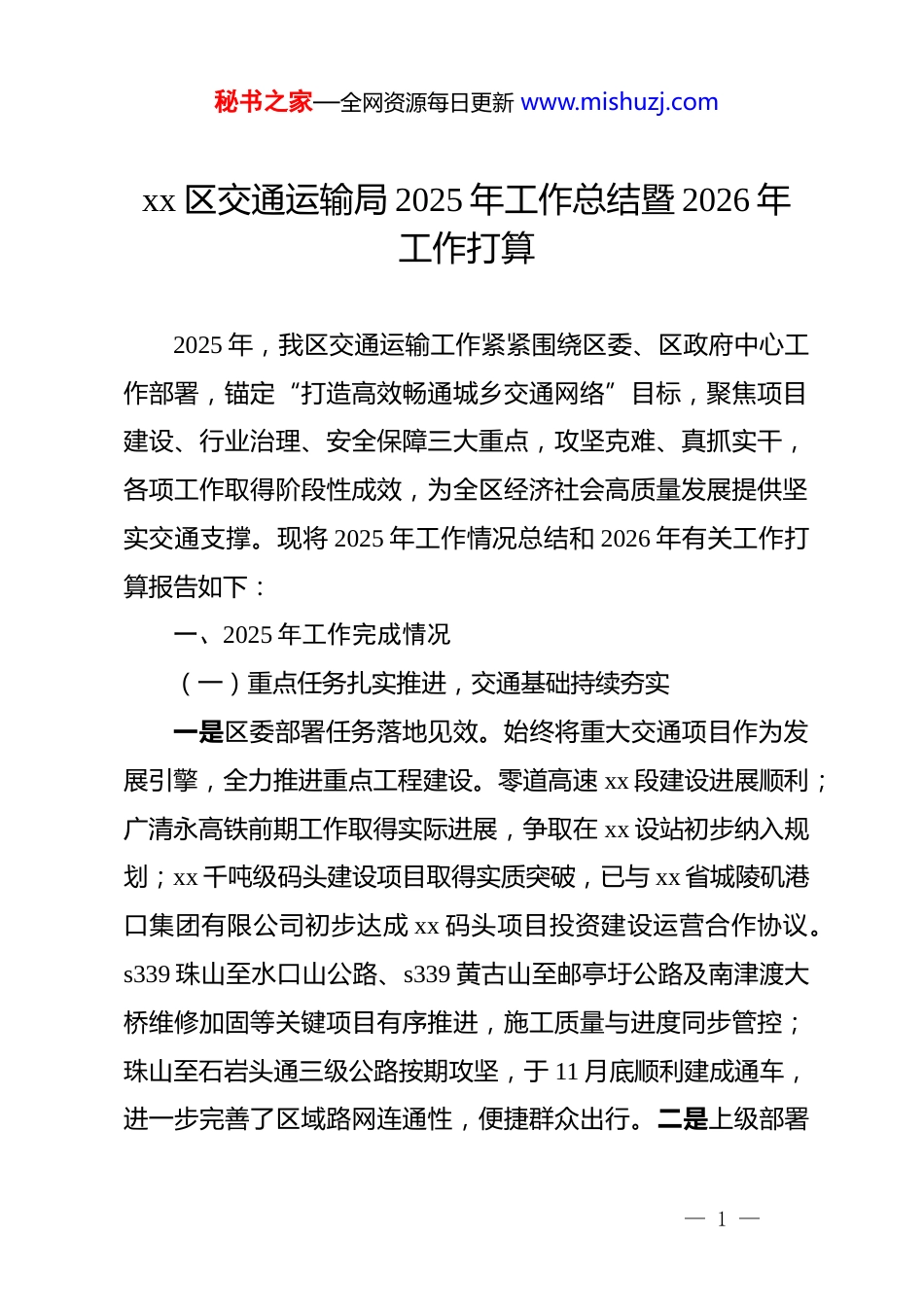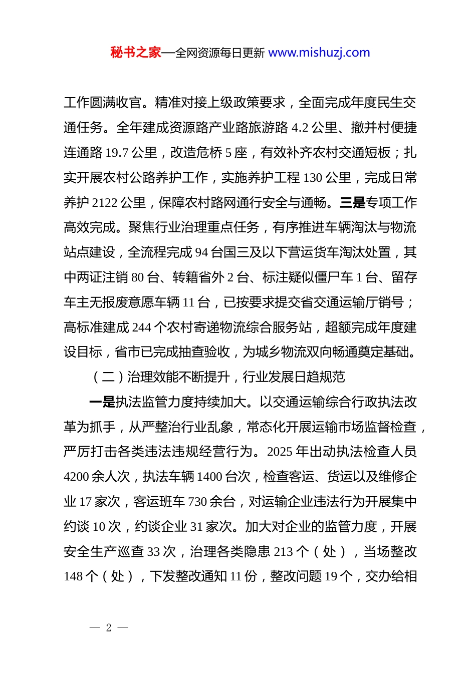 秘书之家—全网资源每日更新 www.mishuzj.comxx 区交通运输局 2025 年工作总结暨 2026 年工作打算2025 年,我区交通运输工作紧紧围绕区委、区政府中心工作部署,锚定“打造高效畅通城乡交通网络”目标,聚焦项目建设、行业治理、安全保障三大重点,攻坚克难、真抓实干,各项工作取得阶段性成效,为全区经济社会高质量发展提供坚实交通支撑。现将 2025 年工作情况总结和 2026 年有关工作打算报告如下:一、2025 年工作完成情况(一)重点任务扎实推进,交通基础持续夯实一是区委部署任务落地见效。始终将重大交通项目作为发展引擎,全力推进重点工程建设。零道高速 xx 段建设进展顺利;广清永高铁前期工作取得实际进展,争取在 xx 设站初步纳入规划;xx 千吨级码头建设项目取得实质突破,已与 xx 省城陵矶港口集团有限公司初步达成 xx 码头项目投资建设运营合作协议。s339 珠山至水口山公路、s339 黄古山至邮亭圩公路及南津渡大桥维修加固等关键项目有序推进,施工质量与进度同步管控;珠山至石岩头通三级公路按期攻坚,于 11 月底顺利建成通车,进一步完善了区域路网连通性,便捷群众出行。二是上级部署— 1 —秘书之家—全网资源每日更新 www.mishuzj.com工作圆满收官。精准对接上级政策要求,全面完成年度民生交通任务。全年建成资源路产业路旅游路 4.2 公里、撤并村便捷连通路 19.7 公里,改造危桥 5 座,有效补齐农村交通短板;扎实开展农村公路养护工作,实施养护工程 130 公里,完成日常养护 2122 公里,保障农村路网通行安全与通畅。三是专项工作高效完成。聚焦行业治理重点任务,有序推进车辆淘汰与物流站点建设,全流程完成 94 台国三及以下营运货车淘汰处置,其中两证注销 80 台、转籍省外 2 台、标注疑似僵尸车 1 台、留存车主无报废意愿车辆 11 台,已按要求提交省交通运输厅销号;高标准建成 244 个农村寄递物流综合服务站,超额完成年度建设目标,省市已完成抽查验收,为城乡物流双向畅通奠定基础。(二)治理效能不断提升,行业发展日趋规范一是执法监管力度持续加大。以交通运输综合行政执法改革为抓手,从严整治行业乱象,常态化开展运输市场监督检查,严厉打击各类违法违规经营行为。2025 年出动执法检查人员4200 余人次,执法车辆 1400 台次,检查客运、货运以及维修企业 17 家次,客运班车 730 余台,对运输企业违法行为开展集中约谈 10 次,约谈企业 31 家次。加大对企业的监管力度,开展安全生产巡查 33 次,治理各类隐患 213 个(处),当场整改148 个(处),下发整改通知 11 份,整改问题 19 个,交办给相— 2 —秘书之家—全网资源每日更新 www.mishuzj.com关部门 65 个(处),整改率 100%。二是“四好农村路”建设深化巩固。今年以来,治理各类隐患 213 个(处),当场整改148 个(处),交办给相关部门 65 个(处),整改率 100%。持续总结推广“四好农村路”建设经验,积极争取上级政策资金支持,预计新增 247 公里农村公路养护资金,每年可稳定获得补助 112 万元,构建农村公路养护长效保障机制,推动农村公路从“建好”向“管好、护好、运营好”深度转变。三是安全监管防线牢固筑牢。始终坚持“安全第一、预防为主、综合治理”方针,常态化开展道路交通顽瘴痼疾整治与打非治违专项行动,加大非法营运、超载超限源头治理、危险货物运输违法经营及“两客一危”车辆动态监管不到位等问题的打击力度,全年立案查处非法违法行为 309 起,共处罚金额 1366975.28 元。所有案件均严格遵循法定程序,合法合规率达 100%,有效维护公平有序的运输市场环境。加强执法队伍建设,通过业务培训、岗位练兵等活动,提升执法人员政治素养、执法水平和办案能力,守住交通运输安全底线。(三)存在的问题与不足一是资金保障压力突出。地方配套资金落实难度大,部分交通项目建设成本高于上级补助标准,资金缺口问题制约项目推进效率,影响部分民生交通工程实施进度。— 3 —秘书之家—全网资源每日更新 www.mishuzj.com二是重大项目推进受阻。因交通建设项目涉及多...