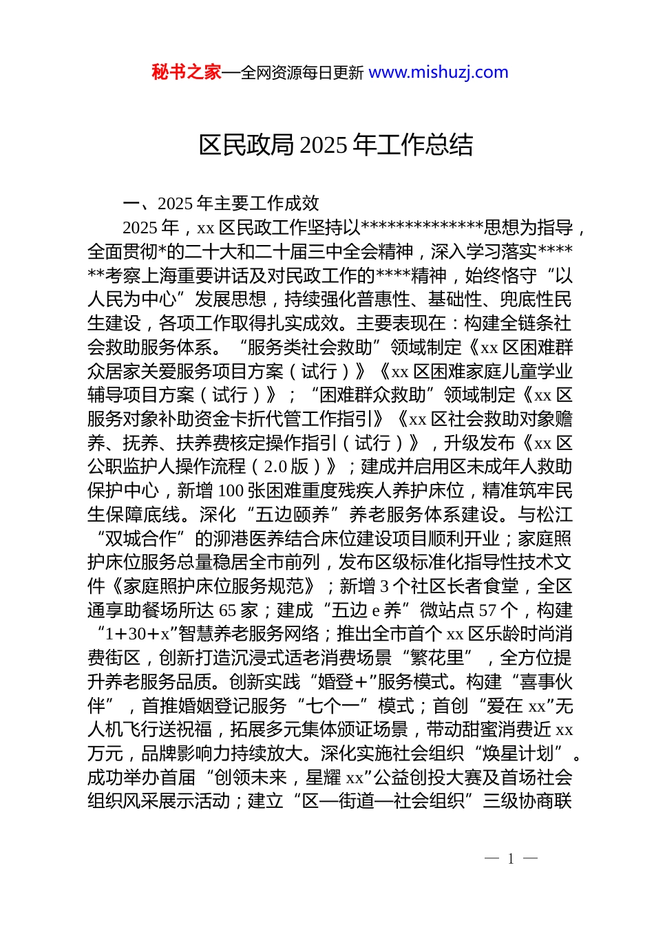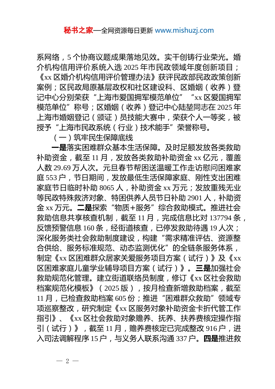 秘书之家—全网资源每日更新 www.mishuzj.com区民政局 2025 年工作总结一、2025 年主要工作成效2025 年,xx 区民政工作坚持以**************思想为指导,全面贯彻*的二十大和二十届三中全会精神,深入学习落实******考察上海重要讲话及对民政工作的****精神,始终恪守“以人民为中心”发展思想,持续强化普惠性、基础性、兜底性民生建设,各项工作取得扎实成效。主要表现在:构建全链条社会救助服务体系。“服务类社会救助”领域制定《xx 区困难群众居家关爱服务项目方案(试行)》《xx 区困难家庭儿童学业辅导项目方案(试行)》;“困难群众救助”领域制定《xx 区服务对象补助资金卡折代管工作指引》《xx 区社会救助对象赡养、抚养、扶养费核定操作指引(试行)》,升级发布《xx 区公职监护人操作流程(2.0 版)》;建成并启用区未成年人救助保护中心,新增 100 张困难重度残疾人养护床位,精准筑牢民生保障底线。深化“五边颐养”养老服务体系建设。与松江“双城合作”的泖港医养结合床位建设项目顺利开业;家庭照护床位服务总量稳居全市前列,发布区级标准化指导性技术文件《家庭照护床位服务规范》;新增 3 个社区长者食堂,全区通享助餐场所达 65 家;建成“五边 e 养”微站点 57 个,构建“1+30+x”智慧养老服务网络;推出全市首个 xx 区乐龄时尚消费街区,创新打造沉浸式适老消费场景“繁花里”,全方位提升养老服务品质。创新实践“婚登+”服务模式。构建“喜事伙伴”,首推婚姻登记服务“七个一”模式;首创“爱在 xx”无人机飞行送祝福,拓展多元集体颁证场景,带动甜蜜消费近 xx万元,品牌影响力持续放大。深化实施社会组织“焕星计划”。成功举办首届“创领未来,星耀 xx”公益创投大赛及首场社会组织风采展示活动;建立“区—街道—社会组织”三级协商联— 1 —秘书之家—全网资源每日更新 www.mishuzj.com系网络,5 个协商议题成果落地见效。实干创铸行业荣光。婚介机构信用评价系统入选 2025 年市民政领域年度创新项目;《xx 区婚介机构信用评价管理办法》获评民政部民政政策创新案例;区民政局原基层政权和社区建设科、区婚姻(收养)登记中心分别荣获“上海市爱国拥军模范单位”“xx 区爱国拥军模范单位”称号;区婚姻(收养)登记中心陆堃同志在 2025 年上海市婚姻登记(颁证)员技能大赛中,荣获个人一等奖,被授予“上海市民政系统(行业)技术能手”荣誉称号。(一)筑牢民生保障底线一是落实困难群众基本生活保障。及时足额发放各类救助补助资金,截至 11 月,发放各类救助补助资金 xx 亿元,覆盖人数 29.69 万人次。元旦春节帮困送温暖工作走访慰问困难家庭 553 户,节日期间,发放最低生活保障家庭、刚性支出困难家庭节日临时补助 8065 人,补助资金 xx 万元;发放重残无业等民政特殊救济对象、特困供养人员节日补助 2901 人,补助资金 xx 万元。二是探索“物质+服务”综合救助模式。推进社会救助信息共享核查机制,截至 11 月,完成信息比对 137794 条,反馈预警信息 160 条,经街道核查,已停发救助待遇 19 人次;深化服务类社会救助制度建设,构建“需求精准评估、资源整合供给、服务标准规范、动态监测优化”的全链条服务体系,制定《xx 区困难群众居家关爱服务项目方案(试行)》及《xx区困难家庭儿童学业辅导项目方案(试行)》。三是加强社会救助规范化管理。建立街道联络员制度,修订《xx 区社会救助档案规范化模板》(2025 版),按月检查新增救助档案,截至11 月,已检查救助档案 605 份;推进“困难群众救助”领域专项巡察整改,研究制定《xx 区服务对象补助资金卡折代管工作指引》、《xx 区社会救助对象赡养、抚养、扶养费核定操作指引(试行)》,截至 11 月,赡养费核定已完成整改 916 户,进入司法调解程序 15 户,与义务人联系沟通 337 户。四是推进救— 2 —秘书之家—全网资源每日更新 www.mishuzj.com助顾问品牌和队伍建设。截至 11 月,已累计开展培训 9 场次,培训社区救助顾问 230 余人次;研究制定《xx 区社区救助顾问工作室带教工作指...