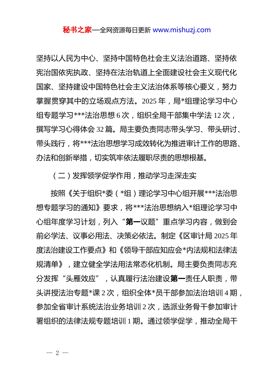 秘书之家—全网资源每日更新 www.mishuzj.com区审计局 2025 年度述法报告2025 年,区审计局坚持以**************思想为指导,深入学习贯彻***法治思想和******关于审计工作的****批示精神,全面贯彻*的二十届四中全会精神,认真落实*中央、国务院关于法治政府建设的决策部署和省委、市委、区委工作要求,坚持依法审计、文明审计,全面推进审计工作法治化,着力构建集中统一、全面覆盖、权威高效的审计监督体系,以高质量审计监督护航全区经济社会高质量发展。现将 2025 年度法治建设情况报告如下:一、深入学习***法治思想情况(一)带头学习领会,筑牢思想根基坚持把学习贯彻***法治思想作为首要政治任务,认真学习贯彻******对全面依法治国工作的****精神,学深悟透***法治思想丰富发展的最新成果。用好《***法治文选》第一卷、《***法治思想学习纲要》等权威读本,读原著、学原文、悟原理,深刻领会***法治思想“十二个坚持”的核心要义、精神实质、丰富内涵、实践要求,准确把握坚持*对全面依法治国的领导、— 1 —秘书之家—全网资源每日更新 www.mishuzj.com坚持以人民为中心、坚持中国特色社会主义法治道路、坚持依宪治国依宪执政、坚持在法治轨道上全面建设社会主义现代化国家、坚持建设中国特色社会主义法治体系等核心要义,努力掌握贯穿其中的立场观点方法。2025 年,局*组理论学习中心组专题学习***法治思想 6 次,组织全局干部集中学法 12 次,撰写学习心得体会 32 篇。局主要负责同志带头学习、带头研讨、带头践行,将***法治思想学习成效转化为推进审计工作的思路、办法和创新举措,切实筑牢依法履职尽责的思想根基。(二)发挥领学促学作用,推动学习走深走实按照《关于组织*委(*组)理论学习中心组开展***法治思想专题学习的通知》要求,将***法治思想纳入*组理论学习中心组年度学习计划,列入“第一议题”重点学习内容,做到会前必学法、议事必用法、决策必依法。制定《区审计局 2025 年度法治建设工作要点》和《领导干部应知应会*内法规和法律法规清单》,建立健全学法用法常态化机制。局主要负责同志充分发挥“头雁效应”,认真履行法治建设第一责任人职责,带头讲授法治专题*课 2 次,组织全体*员干部参加法治培训 4 期,参加全省审计系统法治业务培训 2 次,选派业务骨干参加审计署组织的法律法规专题培训 1 期。通过领学促学,推动全局干— 2 —秘书之家—全网资源每日更新 www.mishuzj.com部切实增强法治意识和法治思维,自觉用***法治思想武装头脑、指导实践、推动工作,做到学思用贯通、知信行统一。(三)深入基层宣讲,推动入脑入心认真落实“谁执法谁普法”责任制,制定年度普法责任清单,结合审计工作实际,深入被审计单位和基层群众开展法治宣传教育。围绕《审计法》《审计法实施条例》《国家审计准则》等法律法规,组织开展“送法进机关”“送法进社区”“送法进企业”等活动 8 场次,发放宣传资料 2000 余份。利用“12·4”国家宪法日、宪法宣传周等重要节点,组织开展宪法法律宣传活动 4 场次,受众达 600 余人次。局主要负责同志带头深入基层、走入群众宣讲***法治思想,结合审计案例讲解法治精神和法治要求。充分运用政务新媒体平台,推送法治宣传信息 36 条,制作普法短视频 4 个,让***法治思想飞入寻常百姓家,推动***法治思想深入人心。二、深入贯彻***法治思想情况(一)聚焦重大决策部署,发挥法治保障作用聚焦******考察河北****批示精神的贯彻落实,坚持运用法治思维和法治方式制定工作举措,充分发挥审计监督在服务— 3 —秘书之家—全网资源每日更新 www.mishuzj.com大局中的法治保障作用。紧紧围绕区委、区政府中心工作,聚焦重大项目、重大资金、重大政策,依法开展财政预算执行审计、经济责任审计、政府投资项目审计、自然资源资产审计等各类审计项目 38 个,查出违规金额**万元,提出审计建议 86条,促进增收节支**万元,移送问题线索*件。坚持“审帮促”结合,在依法指出问题的同时,帮助被审计单位举一反三、完善制度、堵塞漏洞,推动审计整改落实到位。建立健全审计整改“清...