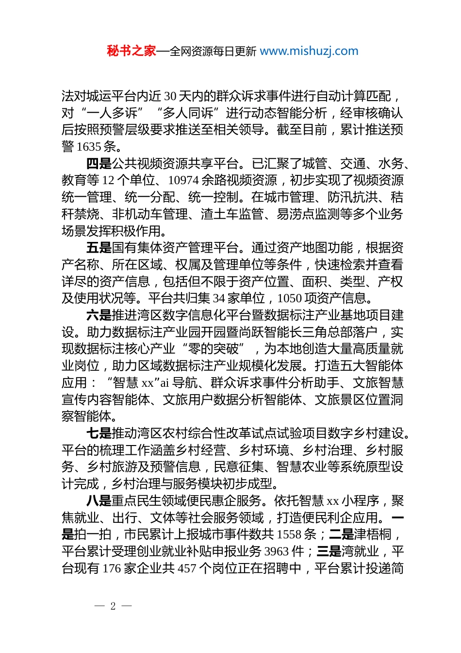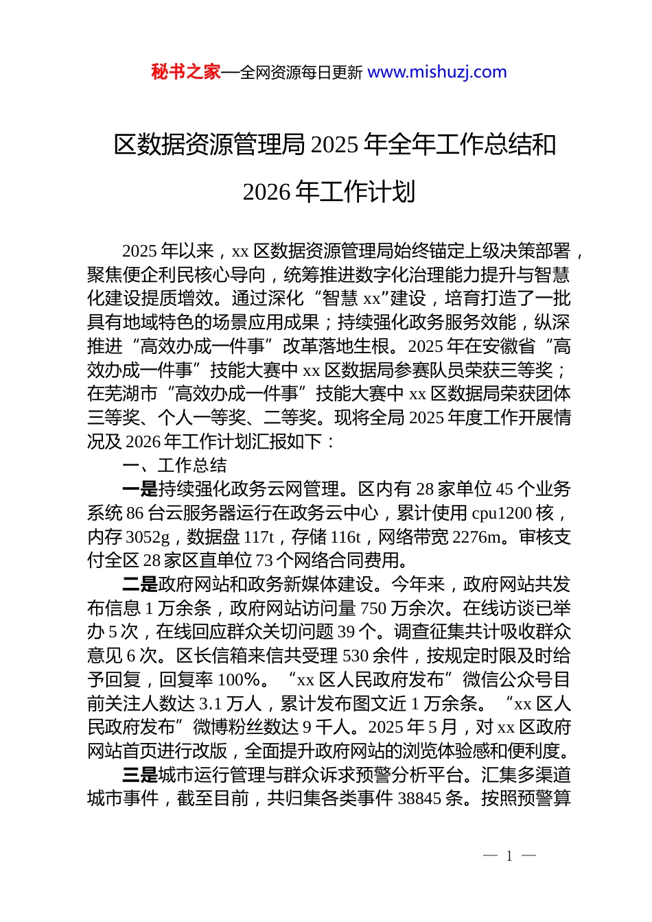 秘书之家—全网资源每日更新 www.mishuzj.com区数据资源管理局 2025 年全年工作总结和2026 年工作计划2025 年以来,xx 区数据资源管理局始终锚定上级决策部署,聚焦便企利民核心导向,统筹推进数字化治理能力提升与智慧化建设提质增效。通过深化“智慧 xx”建设,培育打造了一批具有地域特色的场景应用成果;持续强化政务服务效能,纵深推进“高效办成一件事”改革落地生根。2025 年在安徽省“高效办成一件事”技能大赛中 xx 区数据局参赛队员荣获三等奖;在芜湖市“高效办成一件事”技能大赛中 xx 区数据局荣获团体三等奖、个人一等奖、二等奖。现将全局 2025 年度工作开展情况及 2026 年工作计划汇报如下:一、工作总结一是持续强化政务云网管理。区内有 28 家单位 45 个业务系统 86 台云服务器运行在政务云中心,累计使用 cpu1200 核,内存 3052g,数据盘 117t,存储 116t,网络带宽 2276m。审核支付全区 28 家区直单位 73 个网络合同费用。二是政府网站和政务新媒体建设。今年来,政府网站共发布信息 1 万余条,政府网站访问量 750 万余次。在线访谈已举办 5 次,在线回应群众关切问题 39 个。调查征集共计吸收群众意见 6 次。区长信箱来信共受理 530 余件,按规定时限及时给予回复,回复率 100%。“xx 区人民政府发布”微信公众号目前关注人数达 3.1 万人,累计发布图文近 1 万余条。“xx 区人民政府发布”微博粉丝数达 9 千人。2025 年 5 月,对 xx 区政府网站首页进行改版,全面提升政府网站的浏览体验感和便利度。三是城市运行管理与群众诉求预警分析平台。汇集多渠道城市事件,截至目前,共归集各类事件 38845 条。按照预警算— 1 —秘书之家—全网资源每日更新 www.mishuzj.com法对城运平台内近 30 天内的群众诉求事件进行自动计算匹配,对“一人多诉”“多人同诉”进行动态智能分析,经审核确认后按照预警层级要求推送至相关领导。截至目前,累计推送预警 1635 条。四是公共视频资源共享平台。已汇聚了城管、交通、水务、教育等 12 个单位、10974 余路视频资源,初步实现了视频资源统一管理、统一分配、统一控制。在城市管理、防汛抗洪、秸秆禁烧、非机动车管理、渣土车监管、易涝点监测等多个业务场景发挥积极作用。五是国有集体资产管理平台。通过资产地图功能,根据资产名称、所在区域、权属及管理单位等条件,快速检索并查看详尽的资产信息,包括但不限于资产位置、面积、类型、产权及使用状况等。平台共归集 34 家单位,1050 项资产信息。六是推进湾区数字信息化平台暨数据标注产业基地项目建设。助力数据标注产业园开园暨尚跃智能长三角总部落户,实现数据标注核心产业“零的突破”,为本地创造大量高质量就业岗位,助力区域数据标注产业规模化发展。打造五大智能体应用:“智慧 xx”ai 导航、群众诉求事件分析助手、文旅智慧宣传内容智能体、文旅用户数据分析智能体、文旅景区位置洞察智能体。七是推动湾区农村综合性改革试点试验项目数字乡村建设。平台的梳理工作涵盖乡村经营、乡村环境、乡村治理、乡村服务、乡村旅游及预警信息,民意征集、智慧农业等系统原型设计完成,乡村治理与服务模块初步成型。八是重点民生领域便民惠企服务。依托智慧 xx 小程序,聚焦就业、出行、文体等社会服务领域,打造便民利企应用。一是拍一拍,市民累计上报城市事件数共 1558 条;二是津梧桐,平台累计受理创业就业补贴申报业务 3963 件;三是湾就业,平台现有 176 家企业共 457 个岗位正在招聘中,平台累计投递简— 2 —秘书之家—全网资源每日更新 www.mishuzj.com历次数共 16473 次;四是湾零工平台,累计个人注册岗位 262个,企业注册岗位 37 个;五是智慧停车。提供区内 29 个公共停车场车位情况并提供导航;六是政策与房源。汇聚 xx 区 27个小区在售商品住宅房面积、层数、备案单价等信息;七是易涝点监测,监测区内 22 个易涝点积水情况,通过声光报警和led 屏及短信提醒进行实时预警。九是聚焦数字经济培育。为打造区域数字经济竞争优势,我局以大数据企业培育...