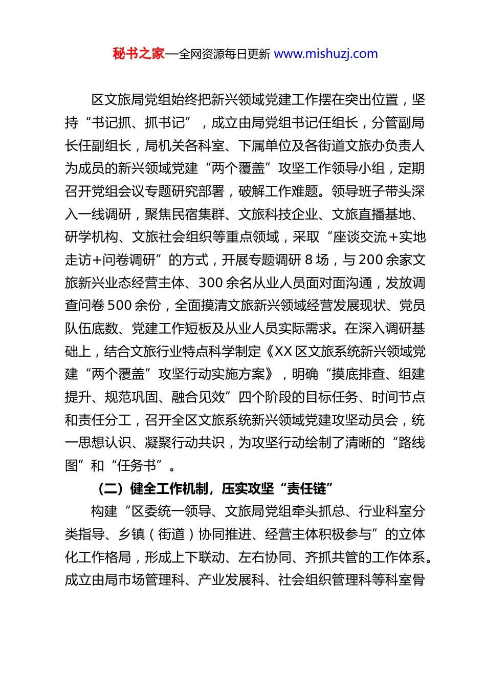 秘书之家—全网资源每日更新 www.mishuzj.comXX 区文旅系统关于“两个覆盖”攻坚行动推动新兴领域党建工作总结为深入贯彻落实中央及省委、市委关于新兴领域党建工作的部署要求,切实把党的领导贯穿文旅新兴领域发展全过程、各方面,XX 区文旅系统自 2025 年 5 月起,聚焦文旅行业新兴业态特点,以“组织覆盖无盲区、工作覆盖无空白”为目标,坚持边摸排、边组建、边规范、边提升的工作思路,全面打响新兴领域党建“两个覆盖”攻坚行动,推动党建工作与文旅产业发展深度融合、互促共进,为区域文旅高质量发展注入强劲“红色动能”。现将攻坚工作开展情况总结如下:一、高位统筹聚合力,健全机制强保障,筑牢攻坚行动“压舱石”文旅行业作为意识形态工作的重要阵地和经济社会发展的关键支柱,近年来新兴业态蓬勃兴起,民宿集群、文旅直播机构、研学旅行企业、非遗传承社会组织、网红文旅街区等不断涌现,成为推动文旅产业创新发展的重要力量。针对新兴领域党组织覆盖不足、党建工作基础薄弱、党建与业务融合不深等问题,区文旅系统将“两个覆盖”攻坚作为年度重点政治任务,着力强化顶层设计、健全工作机制、夯实保障支撑,凝聚起齐抓共管的强大合力。(一)强化顶层设计,锚定攻坚“路线图”秘书之家—全网资源每日更新 www.mishuzj.com区文旅局党组始终把新兴领域党建工作摆在突出位置,坚持“书记抓、抓书记”,成立由局党组书记任组长,分管副局长任副组长,局机关各科室、下属单位及各街道文旅办负责人为成员的新兴领域党建“两个覆盖”攻坚工作领导小组,定期召开党组会议专题研究部署,破解工作难题。领导班子带头深入一线调研,聚焦民宿集群、文旅科技企业、文旅直播基地、研学机构、文旅社会组织等重点领域,采取“座谈交流+实地走访+问卷调研”的方式,开展专题调研 8 场,与 200 余家文旅新兴业态经营主体、300 余名从业人员面对面沟通,发放调查问卷 500 余份,全面摸清文旅新兴领域经营发展现状、党员队伍底数、党建工作短板及从业人员实际需求。在深入调研基础上,结合文旅行业特点科学制定《XX 区文旅系统新兴领域党建“两个覆盖”攻坚行动实施方案》,明确“摸底排查、组建提升、规范巩固、融合见效”四个阶段的目标任务、时间节点和责任分工,召开全区文旅系统新兴领域党建攻坚动员会,统一思想认识、凝聚行动共识,为攻坚行动绘制了清晰的“路线图”和“任务书”。(二)健全工作机制,压实攻坚“责任链”构建“区委统一领导、文旅局党组牵头抓总、行业科室分类指导、乡镇(街道)协同推进、经营主体积极参与”的立体化工作格局,形成上下联动、左右协同、齐抓共管的工作体系。成立由局市场管理科、产业发展科、社会组织管理科等科室骨秘书之家—全网资源每日更新 www.mishuzj.com干组成的工作专班,建立联席会议制度,每月召开 1 次工作推进会,每季度开展 1 次专题调度,及时协调解决排查组建、阵地建设、作用发挥等方面的堵点难点问题,累计召开联席会议6 次,解决各类问题 40 余个。压实“行业主管+属地管理”双责任,明确局机关各科室按照“管行业必须管党建”原则,负责对应领域新兴业态党建工作指导;各街道文旅办履行属地责任,配合开展排查摸底、组织组建等工作,形成横到边、纵到底、无死角的责任体系。建立“督查—整改—提升”闭环工作机制,由局党组牵头成立专项督导组,采取“四不两直”方式开展专项督导 30 余次,通过查阅资料、实地核查、座谈访谈等形式,对各单位攻坚任务推进情况进行全方位督导,发现问题现场反馈、限期整改,跟踪问效确保各项任务落地见效。(三)营造浓厚氛围,夯实攻坚“支撑力”充分发挥文旅系统宣传优势,构建多渠道、广覆盖的宣传矩阵,营造重视新兴领域党建的浓厚氛围。通过区文旅局官方公众号、视频号、抖音号等平台刊发攻坚行动进展、政策解读、先进案例等报道 20 余篇,制作“党建引领文旅新兴业态发展”专题短视频 10 条,累计阅读量超 10 万次;在景区游客中心、民宿集群、文旅直播基地等场所设置宣传展板 50 余块,发放宣传手册 1000 余份,让党建工作深入人心。注重先进典型...