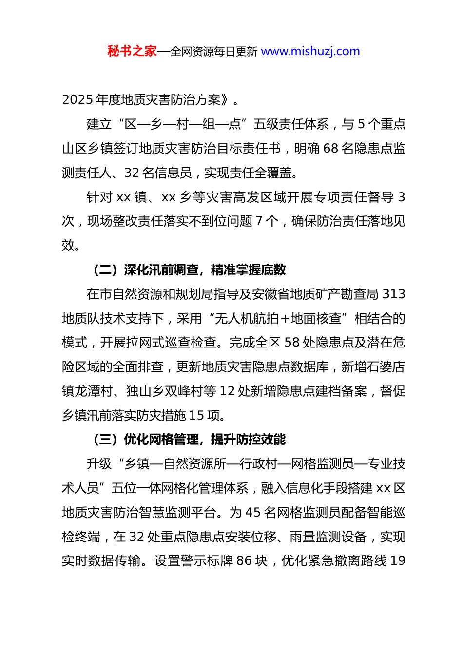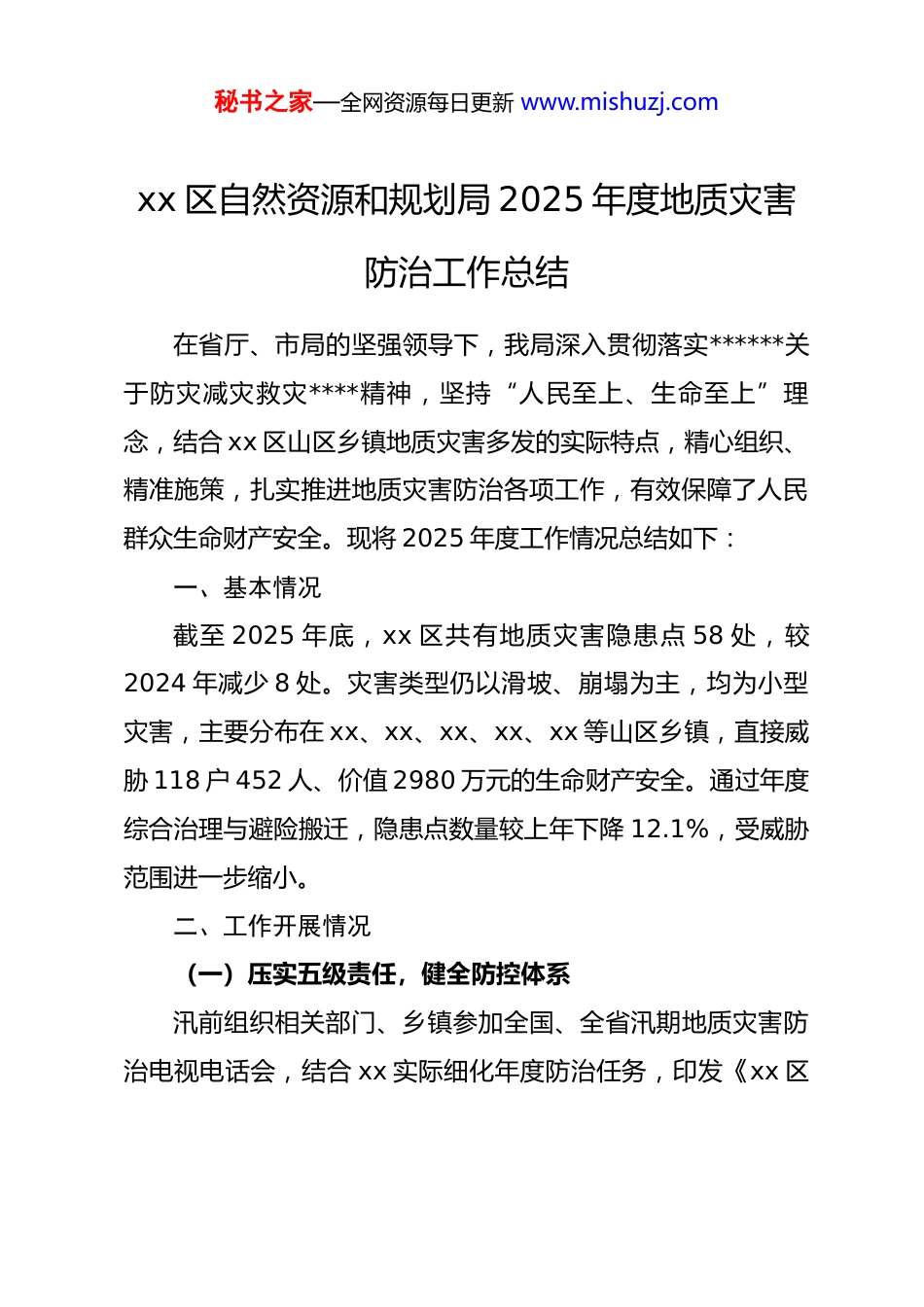 秘书之家—全网资源每日更新 www.mishuzj.comxx 区自然资源和规划局 2025 年度地质灾害防治工作总结在省厅、市局的坚强领导下,我局深入贯彻落实******关于防灾减灾救灾****精神,坚持“人民至上、生命至上”理念,结合 xx 区山区乡镇地质灾害多发的实际特点,精心组织、精准施策,扎实推进地质灾害防治各项工作,有效保障了人民群众生命财产安全。现将 2025 年度工作情况总结如下:一、基本情况截至 2025 年底,xx 区共有地质灾害隐患点 58 处,较2024 年减少 8 处。灾害类型仍以滑坡、崩塌为主,均为小型灾害,主要分布在 xx、xx、xx、xx、xx 等山区乡镇,直接威胁 118 户 452 人、价值 2980 万元的生命财产安全。通过年度综合治理与避险搬迁,隐患点数量较上年下降 12.1%,受威胁范围进一步缩小。二、工作开展情况(一)压实五级责任,健全防控体系汛前组织相关部门、乡镇参加全国、全省汛期地质灾害防治电视电话会,结合 xx 实际细化年度防治任务,印发《xx 区秘书之家—全网资源每日更新 www.mishuzj.com2025 年度地质灾害防治方案》。建立“区—乡—村—组—点”五级责任体系,与 5 个重点山区乡镇签订地质灾害防治目标责任书,明确 68 名隐患点监测责任人、32 名信息员,实现责任全覆盖。针对 xx 镇、xx 乡等灾害高发区域开展专项责任督导 3次,现场整改责任落实不到位问题 7 个,确保防治责任落地见效。(二)深化汛前调查,精准掌握底数在市自然资源和规划局指导及安徽省地质矿产勘查局 313地质队技术支持下,采用“无人机航拍+地面核查”相结合的模式,开展拉网式巡查检查。完成全区 58 处隐患点及潜在危险区域的全面排查,更新地质灾害隐患点数据库,新增石婆店镇龙潭村、独山乡双峰村等 12 处新增隐患点建档备案,督促乡镇汛前落实防灾措施 15 项。(三)优化网格管理,提升防控效能升级“乡镇—自然资源所—行政村—网格监测员—专业技术人员”五位一体网格化管理体系,融入信息化手段搭建 xx 区地质灾害防治智慧监测平台。为 45 名网格监测员配备智能巡检终端,在 32 处重点隐患点安装位移、雨量监测设备,实现实时数据传输。设置警示标牌 86 块,优化紧急撤离路线 19秘书之家—全网资源每日更新 www.mishuzj.com条,向受威胁群众发放“两卡”452 份,组织网格实操培训 4场次。(四)强化预警值守,提升应急能力严格落实领导带班和 24 小时值班制度,印发《关于进一步加强 2025 年汛期地质灾害值班值守工作的通知》,明确值班职责与信息报送流程,全年未发生脱岗、漏岗情况。密切联动气象、应急等部门,建立预警信息快速推送机制。2025 年累计发布黄色预警 11 次、橙色预警 7 次、红色预警 2 次,推送预警信息 1350 条,覆盖受威胁群众及各级责任人。台风“杜苏芮”影响期间,提前 48 小时发布红色预警,联动乡镇完成石板冲乡、石婆店镇 3 个村的紧急避险准备,未造成人员伤亡。(五)加密巡查排查,确保转移安全按照“横向到边、纵向到底、不留死角”要求,汛期开展常态化巡查,梅雨期、台风降雨期间加密巡查频次至每日 1次。全年累计派出巡查组 186 个、528 人次,巡查排查隐患点1630 处。发现独山乡双峰村滑坡隐患点裂缝扩张等险情先兆13 起,均在 2 小时内完成危险区群众转移,累计转移 386 户1392 人次,实现“零伤亡、少损失”目标。秘书之家—全网资源每日更新 www.mishuzj.com(六)推进项目建设,夯实防治基础积极实施 2024 年增发国债地质灾害综合治理项目,覆盖6 个山区乡镇 48 处隐患点。采取“治理+复绿”模式,完成滑坡体削坡减载、挡土墙砌筑等工程治理 18 处,实施避险搬迁35 户 127 人,项目直接保障 235 人、价值 1200 余万元的生命财产安全,同步完成治理区域生态修复 120 亩,契合大别山区生态保护要求。(七)深化宣传教育,增强防灾意识借助“4.22 世界地球日”“5.12 防灾减灾日”“6.25 全国土地日”及安全生产月等节点,在乡镇集市设置宣传咨询台12 个,悬挂横幅 68 条,发放宣传资料 1.2 万份。针对山区老年人口多、...