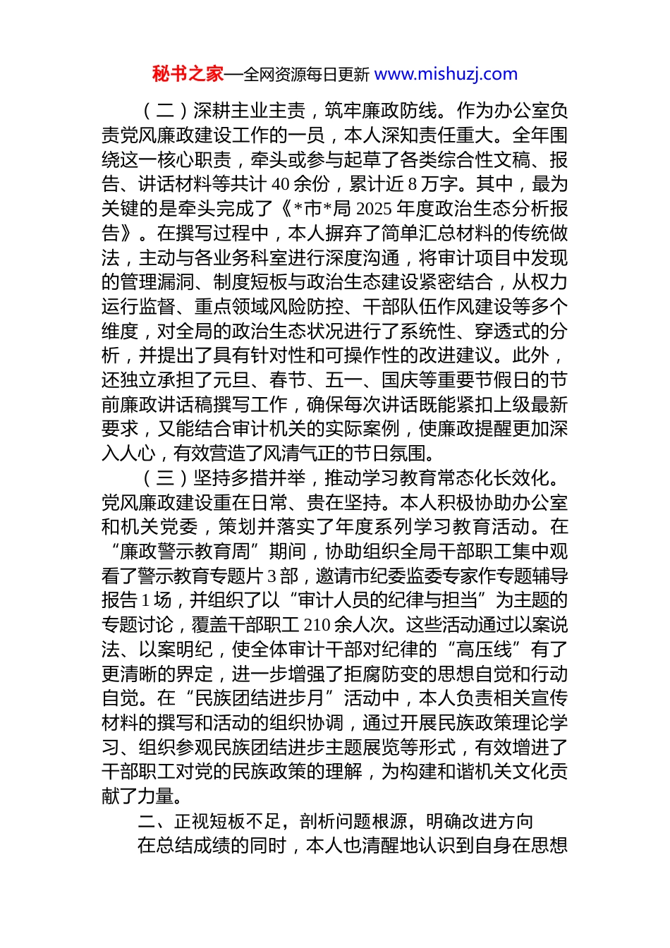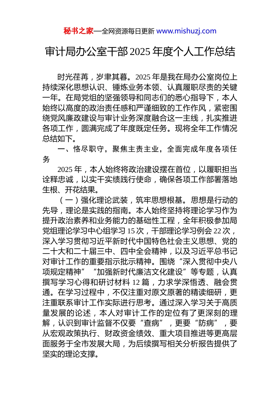 秘书之家—全网资源每日更新 www.mishuzj.com审计局办公室干部 2025 年度个人工作总结时光荏苒,岁聿其暮。2025 年是我在局办公室岗位上持续深化思想认识、锤炼业务本领、认真履职尽责的关键一年。在局党组的坚强领导和同志们的悉心指导下,本人始终以高度的政治责任感和严谨细致的工作作风,紧密围绕党风廉政建设与审计业务深度融合这一主线,扎实推进各项工作,圆满完成了年度既定任务。现将全年工作情况总结如下。一、恪尽职守,聚焦主责主业,全面完成年度各项任务2025 年,本人始终将政治建设摆在首位,以履职担当诠释忠诚,以实干实绩践行使命,确保各项工作部署落地生根、开花结果。(一)强化理论武装,筑牢思想根基。思想是行动的先导,理论是实践的指南。本人始终坚持将理论学习作为提升政治素养和业务能力的基础性工程,全年积极参加局党组理论学习中心组学习 15 次,干部理论学习例会 22 次,深入学习贯彻习近平新时代中国特色社会主义思想、党的二十大和二十届三中、四中全会精神,以及习近平总书记对审计工作的重要指示批示精神。围绕“深入贯彻中央八项规定精神”“加强新时代廉洁文化建设”等专题,认真撰写学习心得和研讨材料 12 篇,力求学深悟透、融会贯通。在学习过程中,不仅注重对原文原著的精读细研,更注重联系审计工作实际进行思考。通过深入学习关于高质量发展的论述,本人对审计工作的定位有了更深刻的理解,认识到审计监督不仅要“查病”,更要“防病”,要从宏观政策执行、财政资金绩效、重大项目推进等更高层面服务于全市发展大局,为后续撰写相关分析报告提供了坚实的理论支撑。秘书之家—全网资源每日更新 www.mishuzj.com(二)深耕主业主责,筑牢廉政防线。作为办公室负责党风廉政建设工作的一员,本人深知责任重大。全年围绕这一核心职责,牵头或参与起草了各类综合性文稿、报告、讲话材料等共计 40 余份,累计近 8 万字。其中,最为关键的是牵头完成了《*市*局 2025 年度政治生态分析报告》。在撰写过程中,本人摒弃了简单汇总材料的传统做法,主动与各业务科室进行深度沟通,将审计项目中发现的管理漏洞、制度短板与政治生态建设紧密结合,从权力运行监督、重点领域风险防控、干部队伍作风建设等多个维度,对全局的政治生态状况进行了系统性、穿透式的分析,并提出了具有针对性和可操作性的改进建议。此外,还独立承担了元旦、春节、五一、国庆等重要节假日的节前廉政讲话稿撰写工作,确保每次讲话既能紧扣上级最新要求,又能结合审计机关的实际案例,使廉政提醒更加深入人心,有效营造了风清气正的节日氛围。(三)坚持多措并举,推动学习教育常态化长效化。党风廉政建设重在日常、贵在坚持。本人积极协助办公室和机关党委,策划并落实了年度系列学习教育活动。在“廉政警示教育周”期间,协助组织全局干部职工集中观看了警示教育专题片 3 部,邀请市纪委监委专家作专题辅导报告 1 场,并组织了以“审计人员的纪律与担当”为主题的专题讨论,覆盖干部职工 210 余人次。这些活动通过以案说法、以案明纪,使全体审计干部对纪律的“高压线”有了更清晰的界定,进一步增强了拒腐防变的思想自觉和行动自觉。在“民族团结进步月”活动中,本人负责相关宣传材料的撰写和活动的组织协调,通过开展民族政策理论学习、组织参观民族团结进步主题展览等形式,有效增进了干部职工对党的民族政策的理解,为构建和谐机关文化贡献了力量。二、正视短板不足,剖析问题根源,明确改进方向在总结成绩的同时,本人也清醒地认识到自身在思想秘书之家—全网资源每日更新 www.mishuzj.com和工作中仍然存在一些短板与不足,亟待在未来的工作中加以改进和提升。(一)理论成果转化效能有待提升。虽然全年参加了大量的理论学习,但在将学习成果系统性、创造性地转化为推动工作的具体举措方面,深度和广度仍显不足。有时满足于“学过了”“记下了”,但在如何运用党的创新理论指导审计实践、破解工作难题上,缺乏主动深入的思考和探索。例如,对于如何将法治思想贯穿于审计项目全过程,形成更具法理深度的审计报告和建议,相关的研究和实践还...