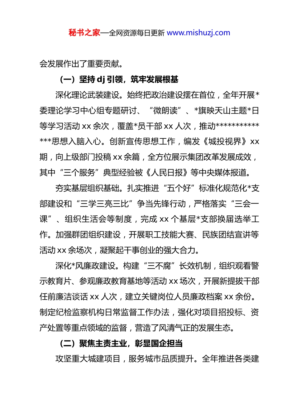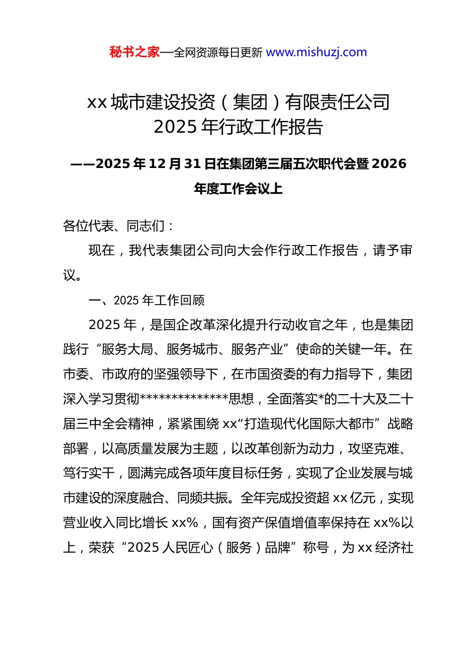 秘书之家—全网资源每日更新 www.mishuzj.comxx 城市建设投资(集团)有限责任公司2025 年行政工作报告——2025 年 12 月 31 日在集团第三届五次职代会暨 2026年度工作会议上各位代表、同志们:现在,我代表集团公司向大会作行政工作报告,请予审议。一、2025 年工作回顾2025 年,是国企改革深化提升行动收官之年,也是集团践行“服务大局、服务城市、服务产业”使命的关键一年。在市委、市政府的坚强领导下,在市国资委的有力指导下,集团深入学习贯彻**************思想,全面落实*的二十大及二十届三中全会精神,紧紧围绕 xx“打造现代化国际大都市”战略部署,以高质量发展为主题,以改革创新为动力,攻坚克难、笃行实干,圆满完成各项年度目标任务,实现了企业发展与城市建设的深度融合、同频共振。全年完成投资超 xx 亿元,实现营业收入同比增长 xx%,国有资产保值增值率保持在 xx%以上,荣获“2025 人民匠心(服务)品牌”称号,为 xx 经济社秘书之家—全网资源每日更新 www.mishuzj.com会发展作出了重要贡献。(一)坚持 dj 引领,筑牢发展根基深化理论武装建设。始终把政治建设摆在首位,全年开展*委理论学习中心组专题研讨、“微朗读”、*旗映天山主题*日等学习活动 xx 余次,覆盖*员干部 xx 人次,推动**************思想入脑入心。创新宣传思想工作,编发《城投视界》xx期,向上级部门投稿 xx 余篇,全方位展示集团改革发展成效,其中“三个服务”典型经验被《人民日报》等中央媒体报道。夯实基层组织基础。扎实推进“五个好”标准化规范化*支部建设和“三学三亮三比”争当先锋行动,严格落实“三会一课”、组织生活会等制度,完成 xx 个基层*支部换届选举工作。加强群团组织建设,开展职工技能大赛、民族团结宣讲等活动 xx 余场次,凝聚起干事创业的强大合力。深化*风廉政建设。构建“三不腐”长效机制,组织观看警示教育片、参观廉政教育基地等活动 xx 场次,开展新提拔干部任前廉洁谈话 xx 人次,建立关键岗位人员廉政档案 xx 余份。制定纪检监察机构日常监督工作办法,强化对项目招投标、资产处置等重点领域的监督,营造了风清气正的发展生态。(二)聚焦主责主业,彰显国企担当攻坚重大城建项目,服务城市品质提升。全年推进各类建秘书之家—全网资源每日更新 www.mishuzj.com设项目 xx 项,其中市重大工程 xx 项,完成投资 xx 亿元,超额完成年度计划。xx 路隧道顺利贯通,作为全国最大跨度市政隧道,有效缓解了区域交通压力,成为连接 xx 东西城区的交通大动脉。xx 片区改造项目稳步推进,累计投入 xx 亿元,完成学校、康养中心等配套设施建设,实现从老工业区到宜居宜业新城区的华丽蜕变。xx 水库、xx 高速扩建等民生工程进展顺利,工程质量优良率保持 xx%。新能源充电站实现 xx 区 xx 市全覆盖,xx 个乡镇公共充电站全部投用,彻底解决了群众出行“里程焦虑”问题。布局产业发展赛道,赋能经济转型升级。以资本为纽带,以园区为载体,全力推动产业链集聚发展。在 xx 汽车 xx 基地旁,xx 零部件产业园建成投用,吸引 xx 家配套企业入驻,预计年产值达 xx 亿元,形成了完整的汽车零部件产业链。xx 产业园加快建设,xx、xx 等一批优质企业相继落户,资金链、产业链、人才链深度融合,助力 xx 打造 xx 产业高地。积极参与“一带一路”建设,xx 镍铁冶炼项目顺利投产,为保障国家战略资源安全提供了坚实支撑。强化金融赋能作用,服务实体经济发展。充分发挥国有资本投资运营平台作用,2025 年成功发行绿色乡村振兴债券 xx亿元,精准支持农村新能源项目建设,绘就“新能源+乡村振秘书之家—全网资源每日更新 www.mishuzj.com兴”产融新图景。累计为近 xx 家中小微实体企业提供资金支持,解决了企业发展融资难题。推动 xx 家投资企业成功上市,其中 xx 家企业入选国内主板上市公司百强,资本运作能力持续提升。集团保持 xx 个 aaa 级信用评级,建立债务风险预警平台,有效防范化解金融风险,保障了企业稳健运营。(三)深化改革创新,激发发展活力推进国企改革收官。制定...