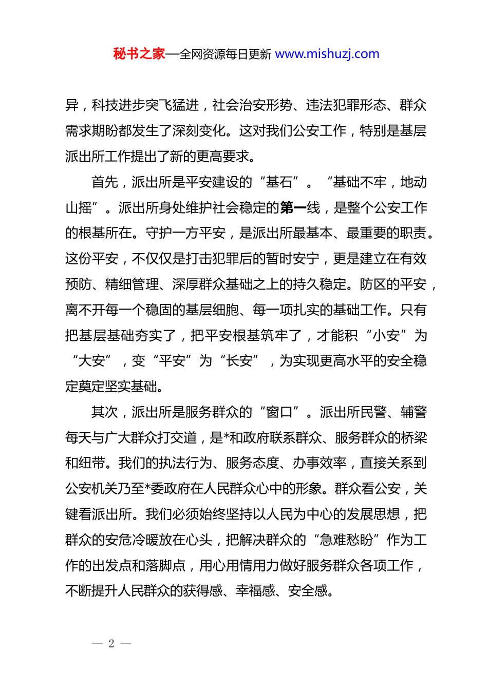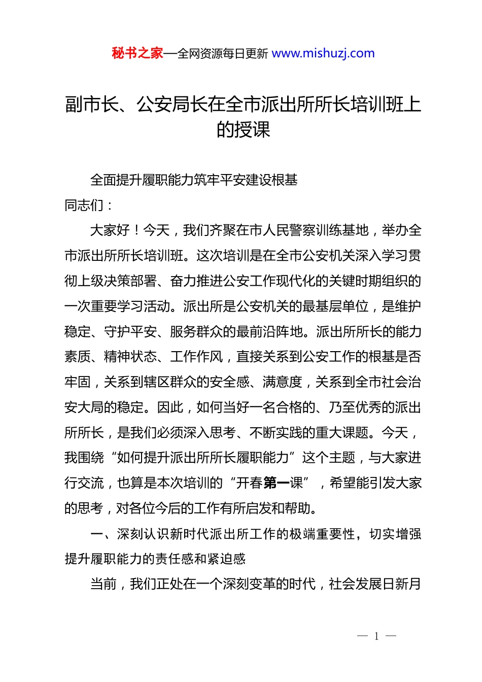 秘书之家—全网资源每日更新 www.mishuzj.com副市长、公安局长在全市派出所所长培训班上的授课全面提升履职能力筑牢平安建设根基同志们:大家好!今天,我们齐聚在市人民警察训练基地,举办全市派出所所长培训班。这次培训是在全市公安机关深入学习贯彻上级决策部署、奋力推进公安工作现代化的关键时期组织的一次重要学习活动。派出所是公安机关的最基层单位,是维护稳定、守护平安、服务群众的最前沿阵地。派出所所长的能力素质、精神状态、工作作风,直接关系到公安工作的根基是否牢固,关系到辖区群众的安全感、满意度,关系到全市社会治安大局的稳定。因此,如何当好一名合格的、乃至优秀的派出所所长,是我们必须深入思考、不断实践的重大课题。今天,我围绕“如何提升派出所所长履职能力”这个主题,与大家进行交流,也算是本次培训的“开春第一课”,希望能引发大家的思考,对各位今后的工作有所启发和帮助。一、深刻认识新时代派出所工作的极端重要性,切实增强提升履职能力的责任感和紧迫感当前,我们正处在一个深刻变革的时代,社会发展日新月— 1 —秘书之家—全网资源每日更新 www.mishuzj.com异,科技进步突飞猛进,社会治安形势、违法犯罪形态、群众需求期盼都发生了深刻变化。这对我们公安工作,特别是基层派出所工作提出了新的更高要求。首先,派出所是平安建设的“基石”。“基础不牢,地动山摇”。派出所身处维护社会稳定的第一线,是整个公安工作的根基所在。守护一方平安,是派出所最基本、最重要的职责。这份平安,不仅仅是打击犯罪后的暂时安宁,更是建立在有效预防、精细管理、深厚群众基础之上的持久稳定。防区的平安,离不开每一个稳固的基层细胞、每一项扎实的基础工作。只有把基层基础夯实了,把平安根基筑牢了,才能积“小安”为“大安”,变“平安”为“长安”,为实现更高水平的安全稳定奠定坚实基础。其次,派出所是服务群众的“窗口”。派出所民警、辅警每天与广大群众打交道,是*和政府联系群众、服务群众的桥梁和纽带。我们的执法行为、服务态度、办事效率,直接关系到公安机关乃至*委政府在人民群众心中的形象。群众看公安,关键看派出所。我们必须始终坚持以人民为中心的发展思想,把群众的安危冷暖放在心头,把解决群众的“急难愁盼”作为工作的出发点和落脚点,用心用情用力做好服务群众各项工作,不断提升人民群众的获得感、幸福感、安全感。— 2 —秘书之家—全网资源每日更新 www.mishuzj.com再次,派出所是锤炼队伍的“熔炉”。派出所队伍庞大,年轻民警多,是公安队伍战斗力生成的重要源泉。派出所所长作为“兵头将尾”,不仅自身要过硬,更要担负起带队伍、管队伍的重要责任。所长的管理水平、示范作用,直接影响整个派出所的凝聚力、向心力和战斗力。打造一支“对*忠诚、服务人民、执法公正、纪律严明”的过硬基层警队,所长是关键。我们必须把带好队伍作为履职尽责的重要内容,严管厚爱,激发活力,确保队伍绝对忠诚、绝对纯洁、绝对可靠。面对新形势、新任务、新挑战,我们派出所所长的履职能力必须与时俱进、全面提升。不能满足于当“太平官”、“守摊子”,要有“本领恐慌”的危机感,主动学习新知识、掌握新技能、探索新方法,努力成为基层公安工作的行家里手、治理专家。二、准确把握提升履职能力的核心要求,努力锻造“七个要”的过硬本领基于对派出所工作重要性的认识,结合当前基层实际,我认为,当好一名派出所所长,全面提升履职能力,务必在以下七个方面下功夫、见真章:(一)思想要正:把稳政治方向之舵,筑牢忠诚干净担当之基— 3 —秘书之家—全网资源每日更新 www.mishuzj.com这是当好派出所所长的根本前提和第一要求。政治上不过关,本事再大也不能用。坚定政治立场,做到“两个维护”。必须深刻领悟“两个确立”的决定性意义,增强“四个意识”、坚定“四个自信”、做到“两个维护”。这不是抽象的口号,而是要具体落实到行动上。要不断提高政治判断力、政治领悟力、政治执行力,始终在思想上政治上行动上同*中央保持高度一致,确保*的路线方针政策和上级*委、政府的决策部署在派出所得到不折不扣的贯...